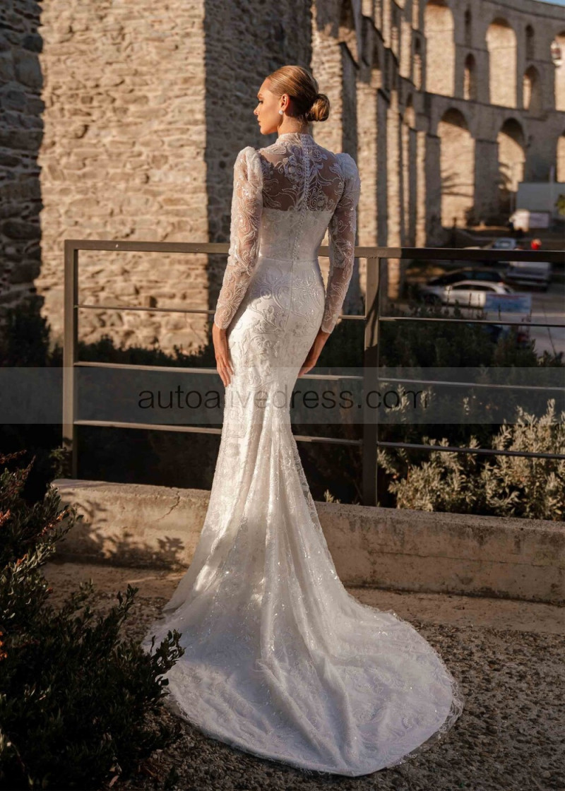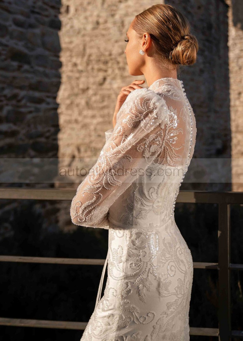High Neck Beaded Ivory Lace Tulle Luxurious Wedding Dress
