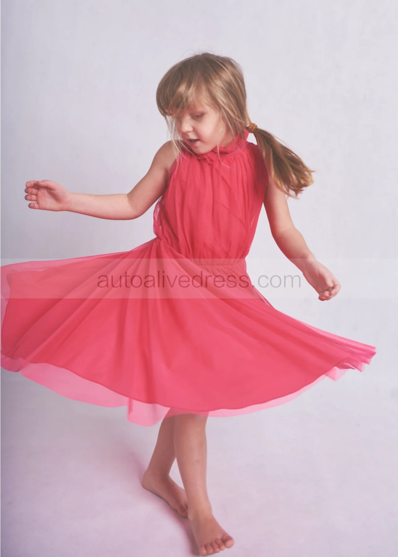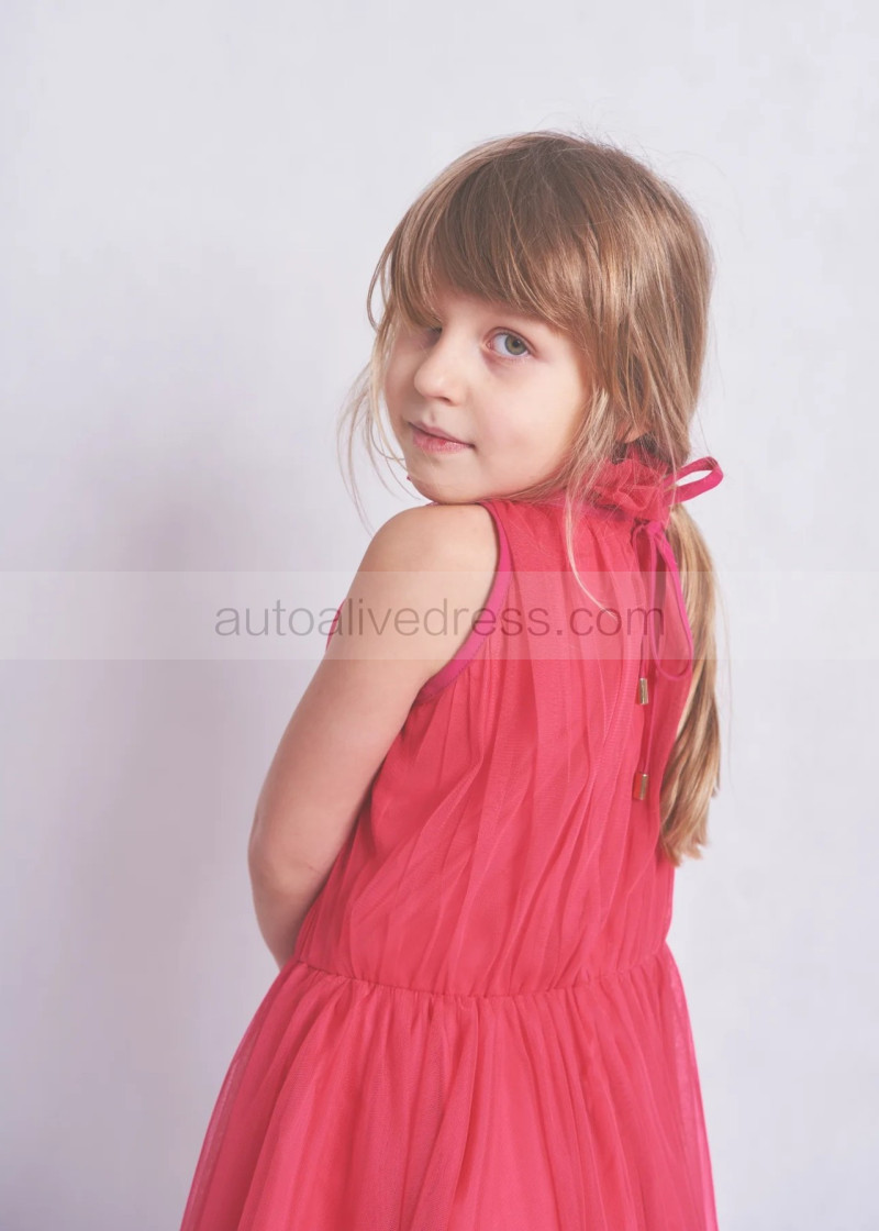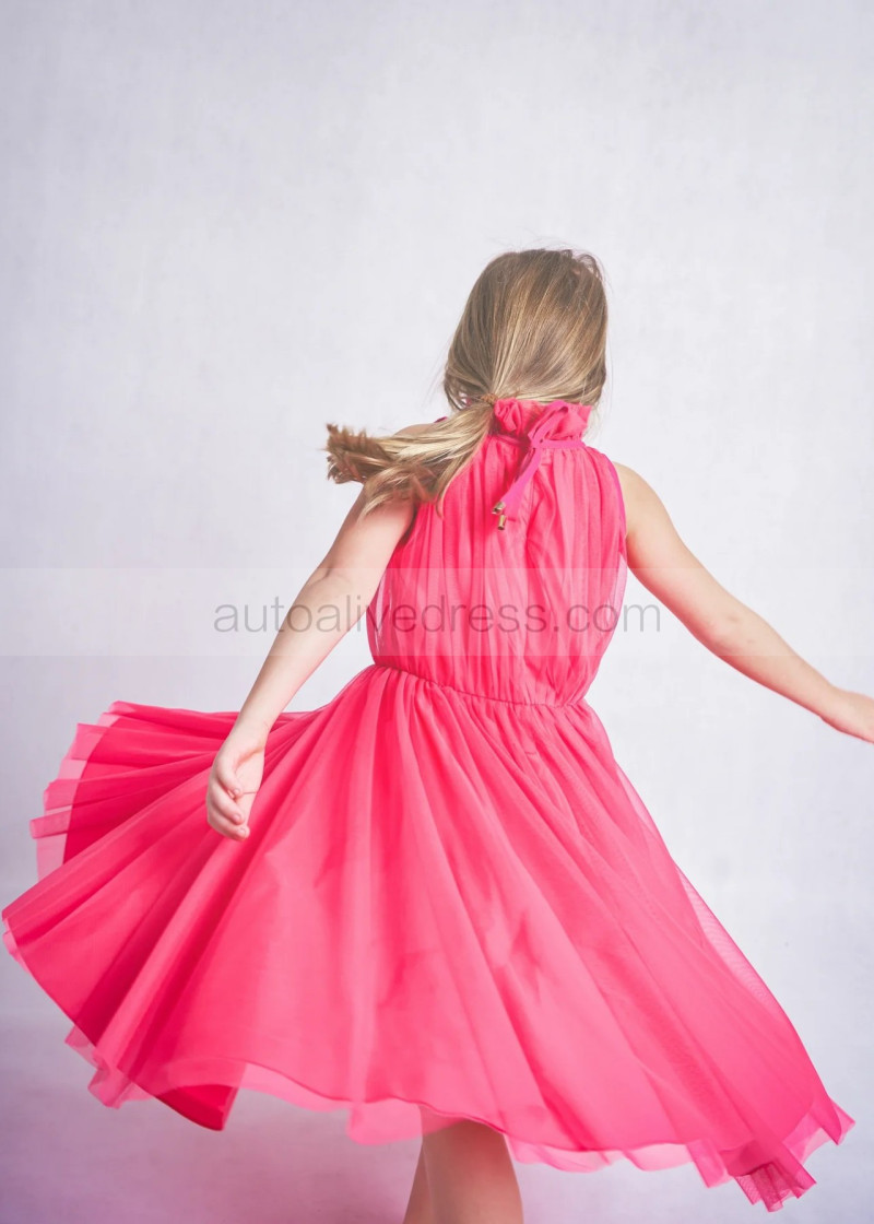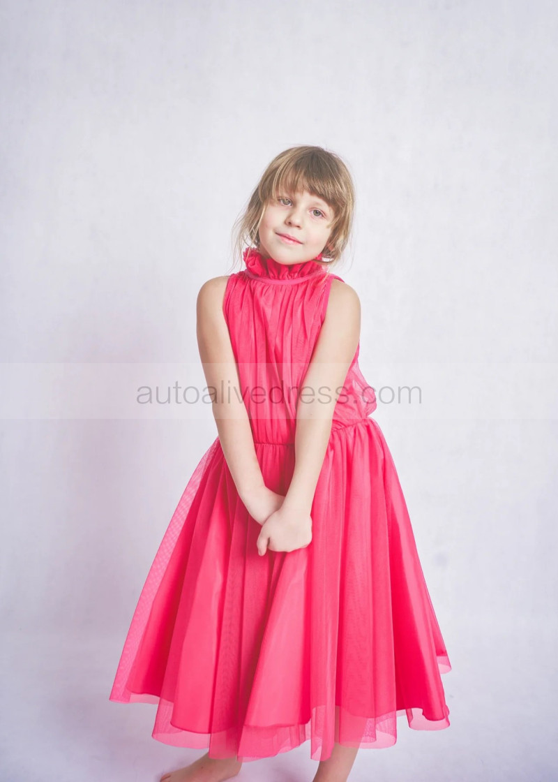 High Neck Fuchsia Tulle Tea Length Flower Girl Dress