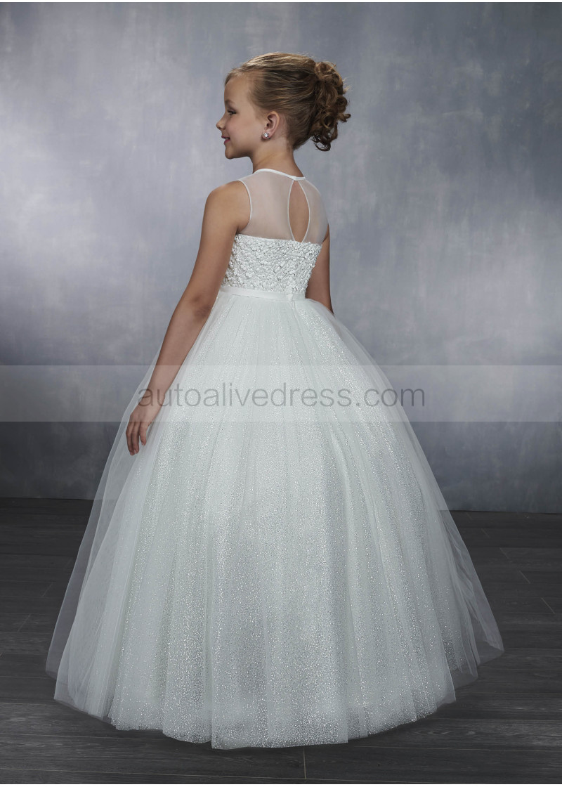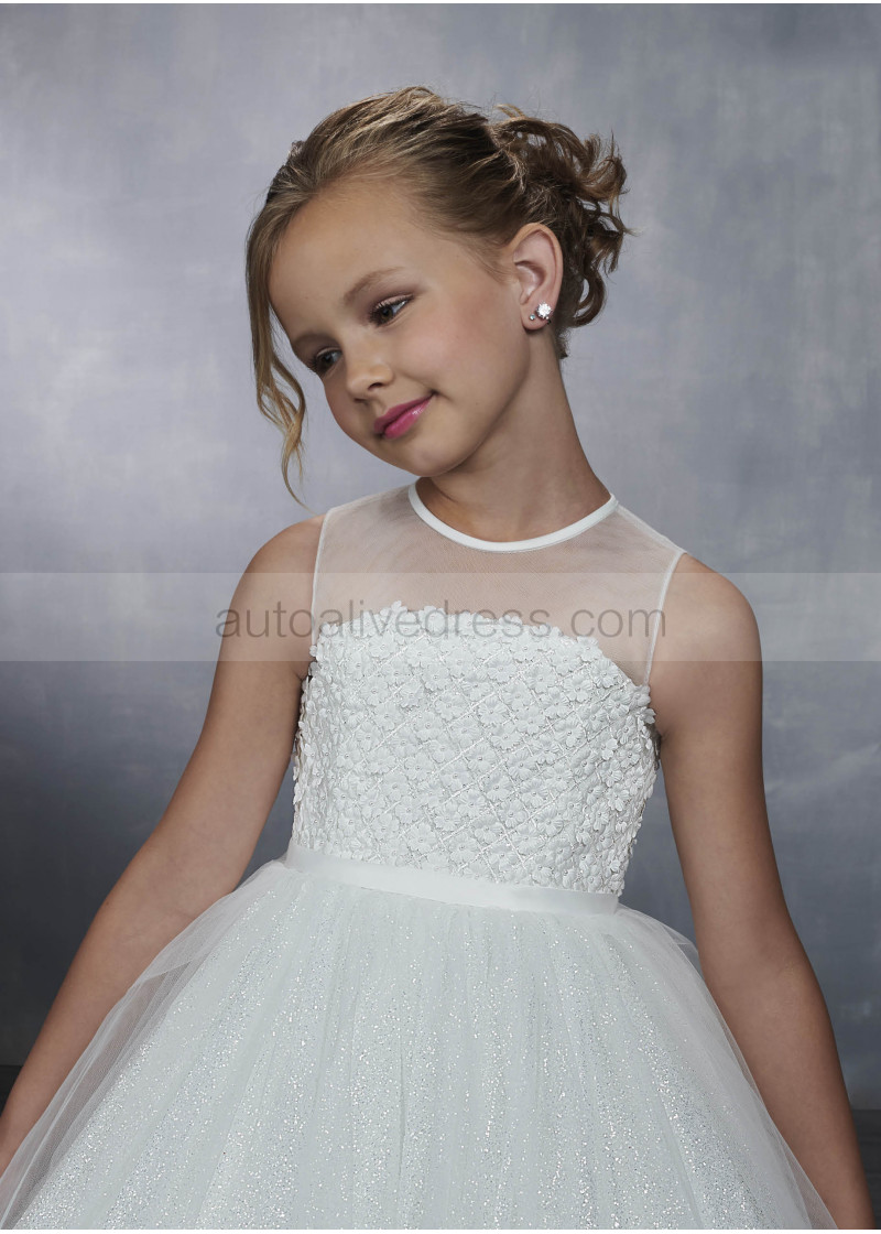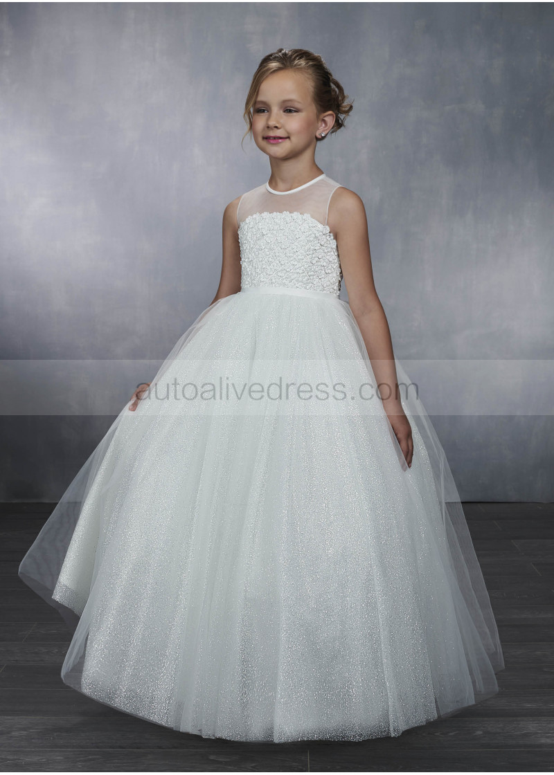 Illusion Neck Beaded Ivory Sparkle Tulle 3D Flowers Flower Girl Dress