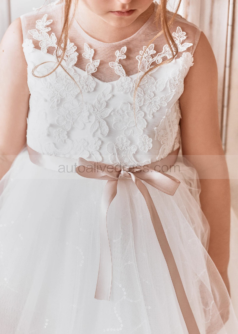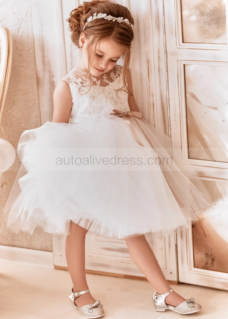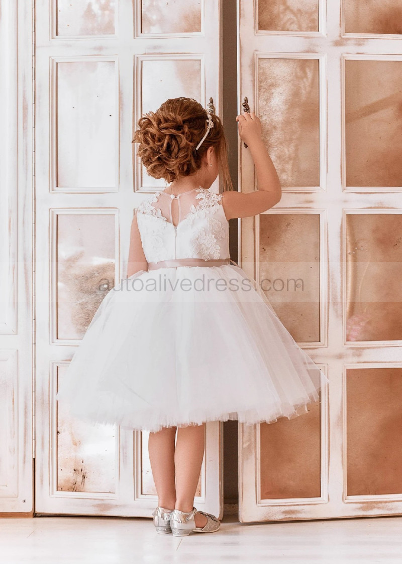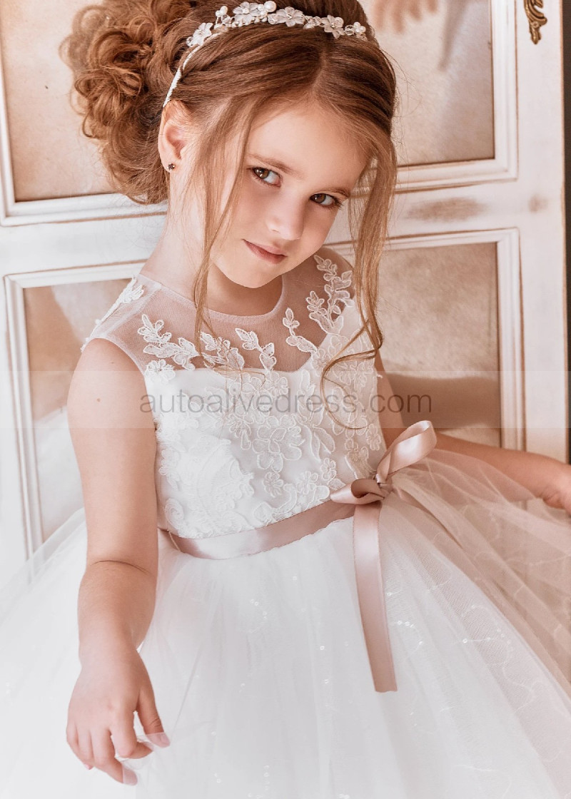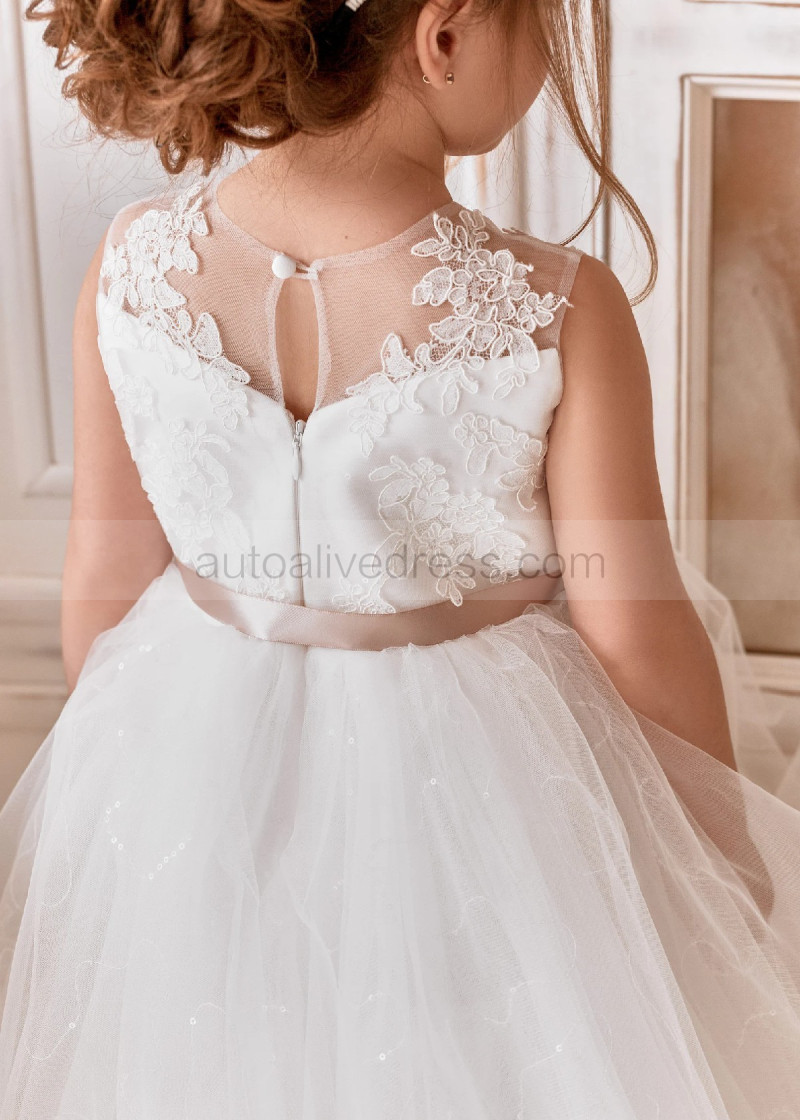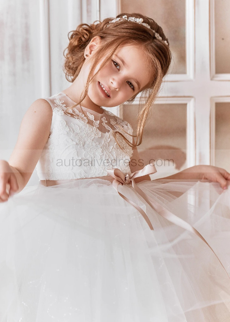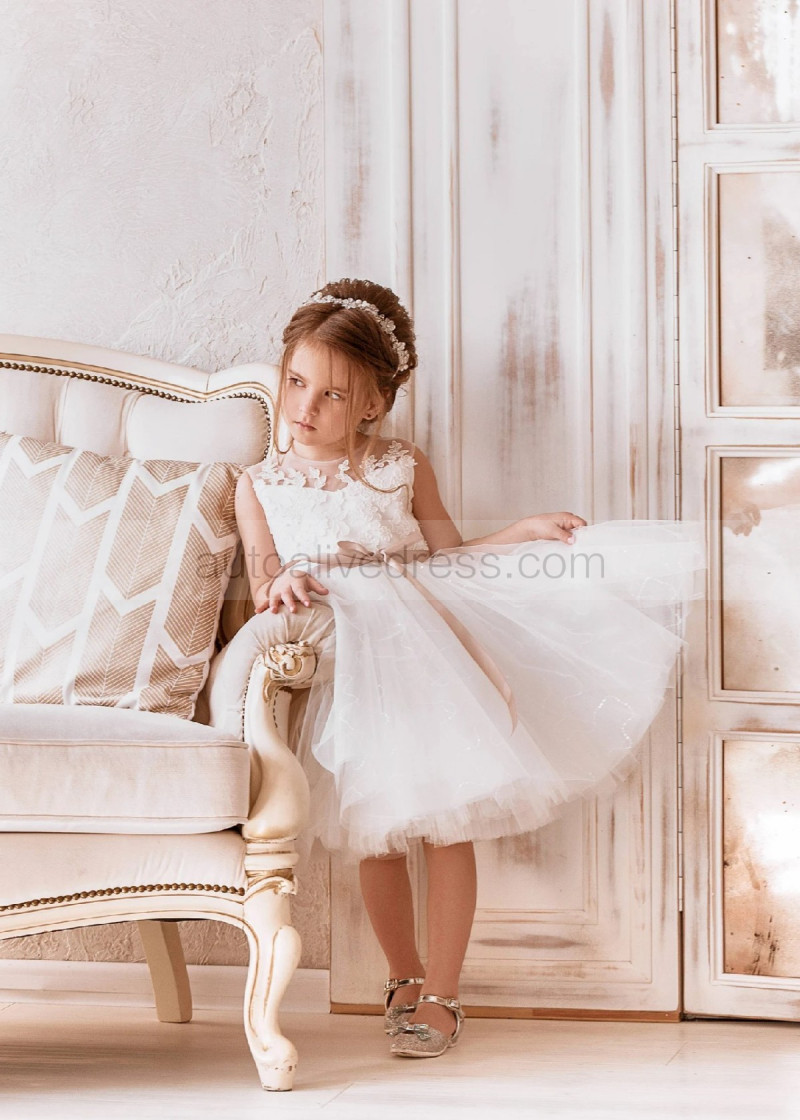 Illusion Neck Ivory Lace Tulle Slit Open Back Flower Girl Dress