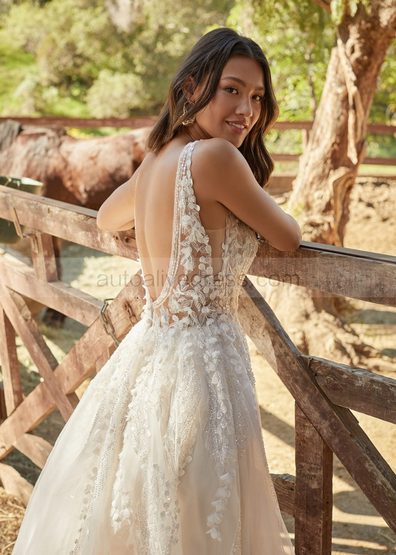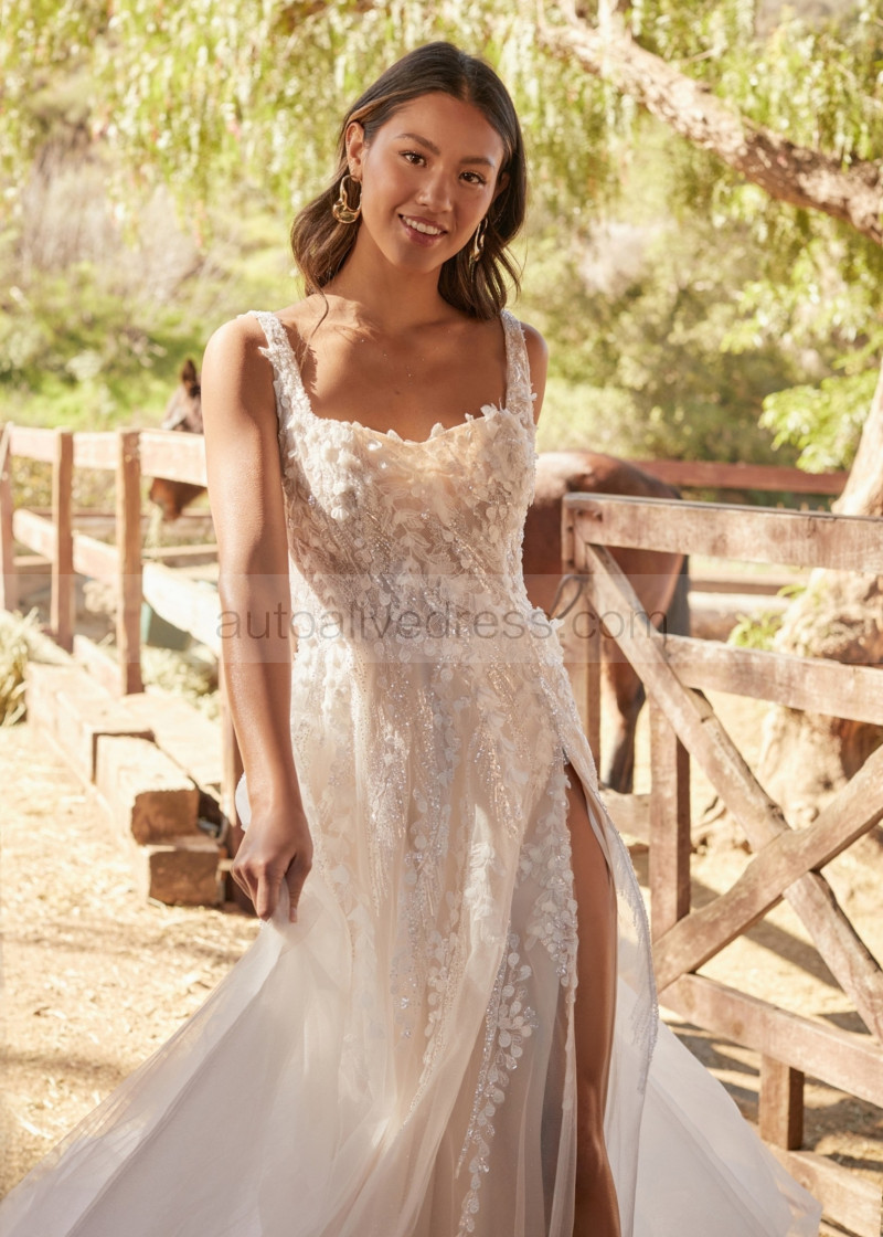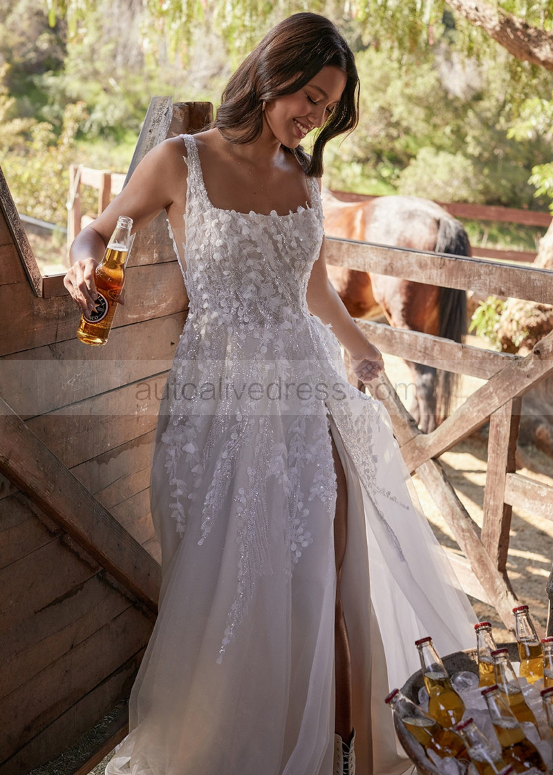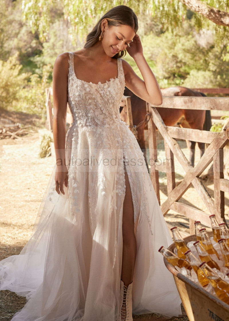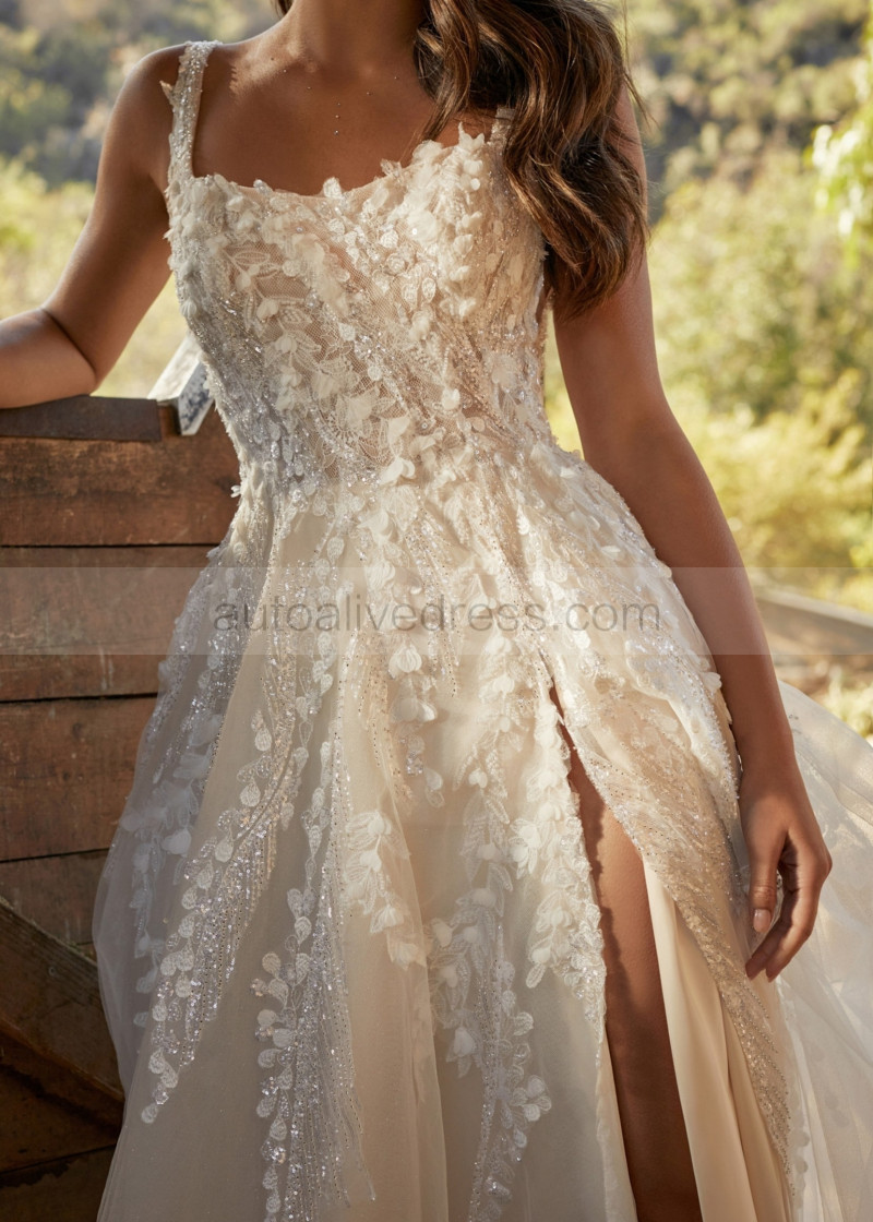 Ivory 3D Floral Lace Tulle Slit Glitter Wedding Dress