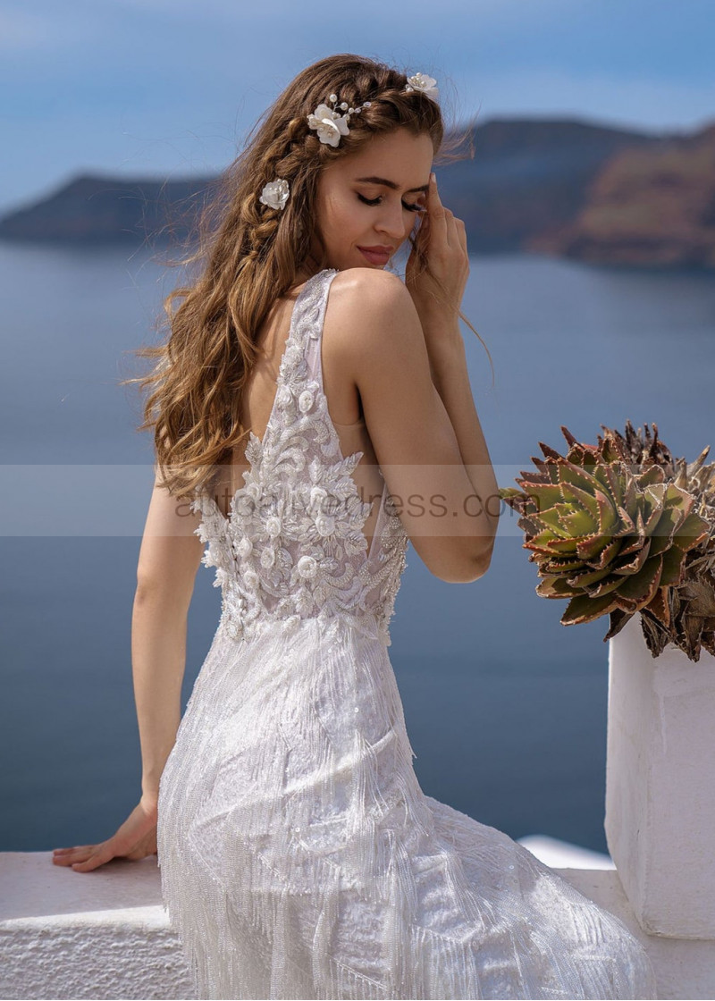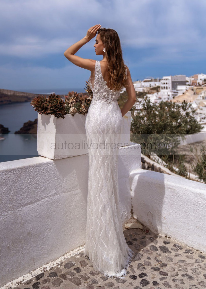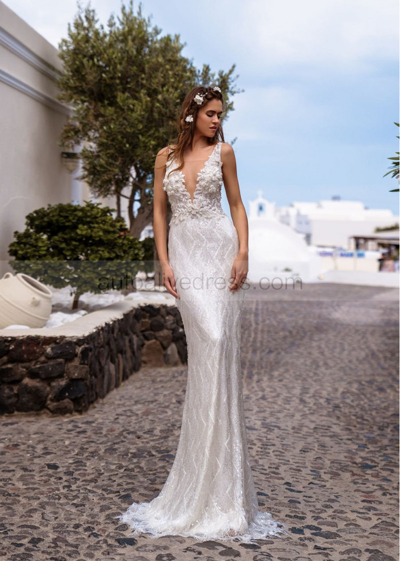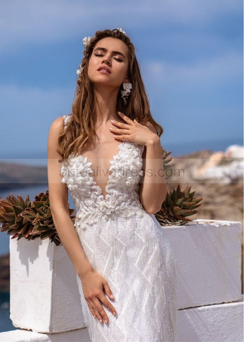 Ivory Beaded Floral Lace Tulle Wedding Dress
