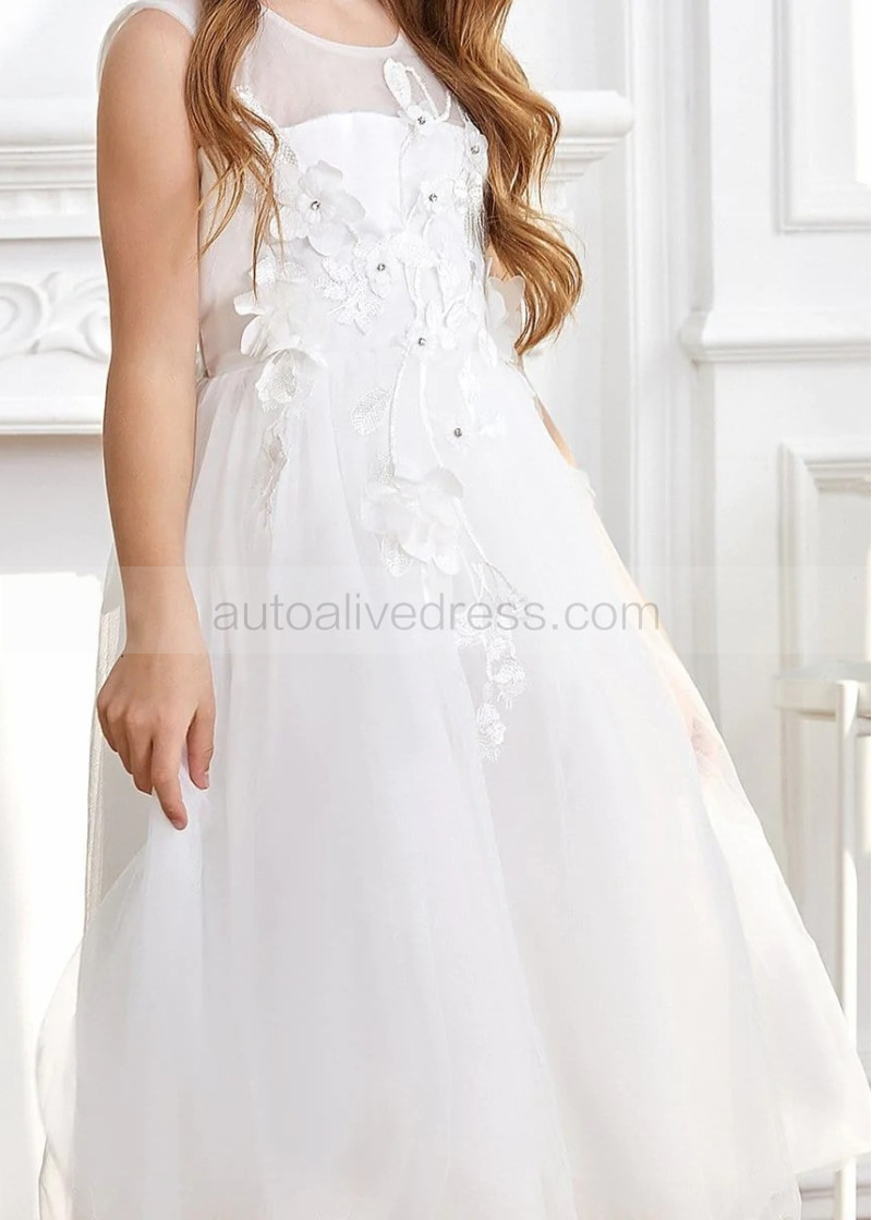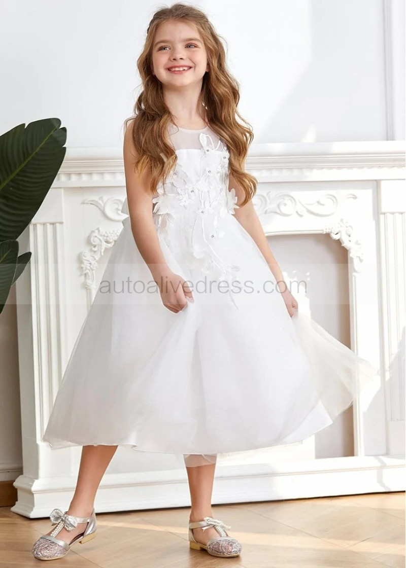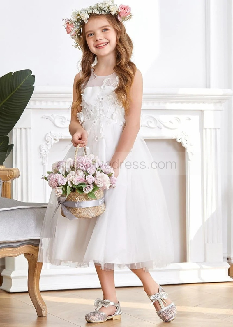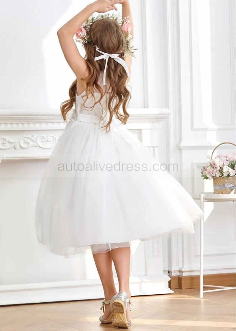 Ivory Beaded Lace Appliques Tulle Tea Length Flower Girl Dress