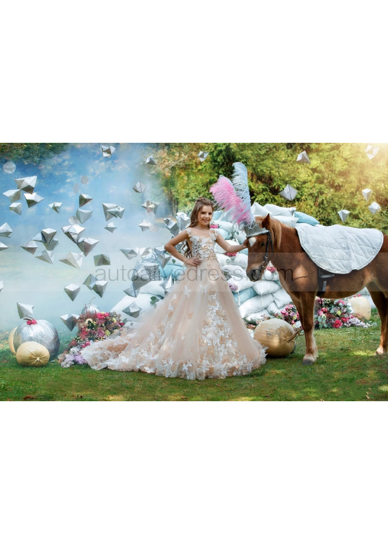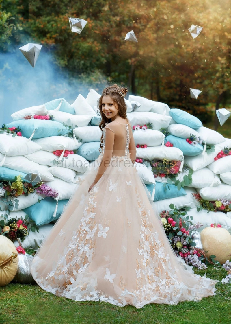 Ivory Champagne Butterfly Pearl Buttons Back Fairytale Flower Girl Dress