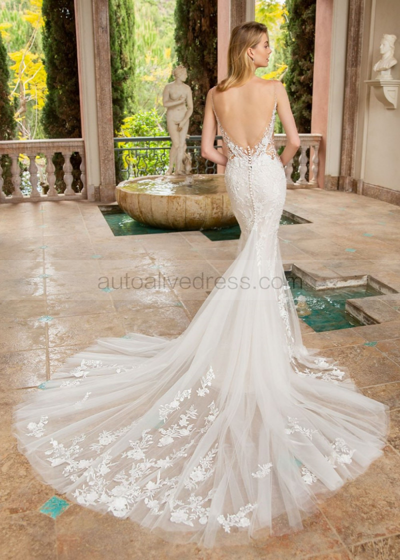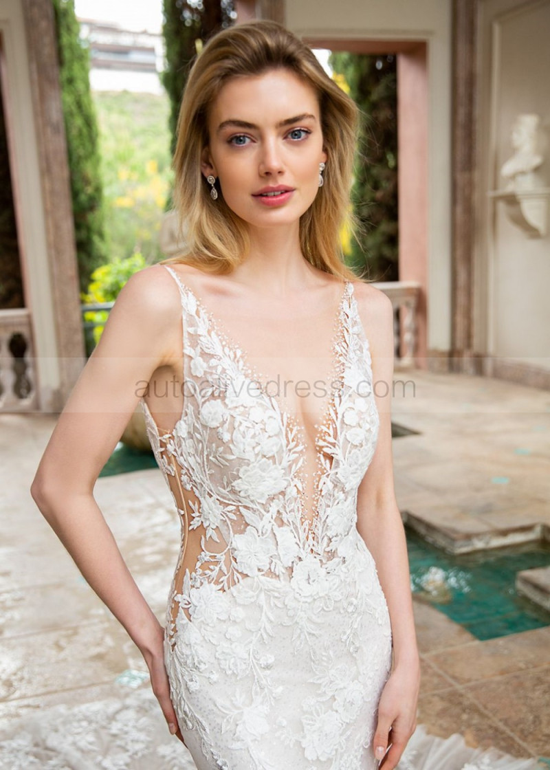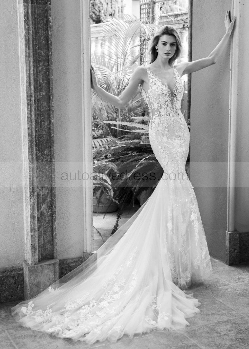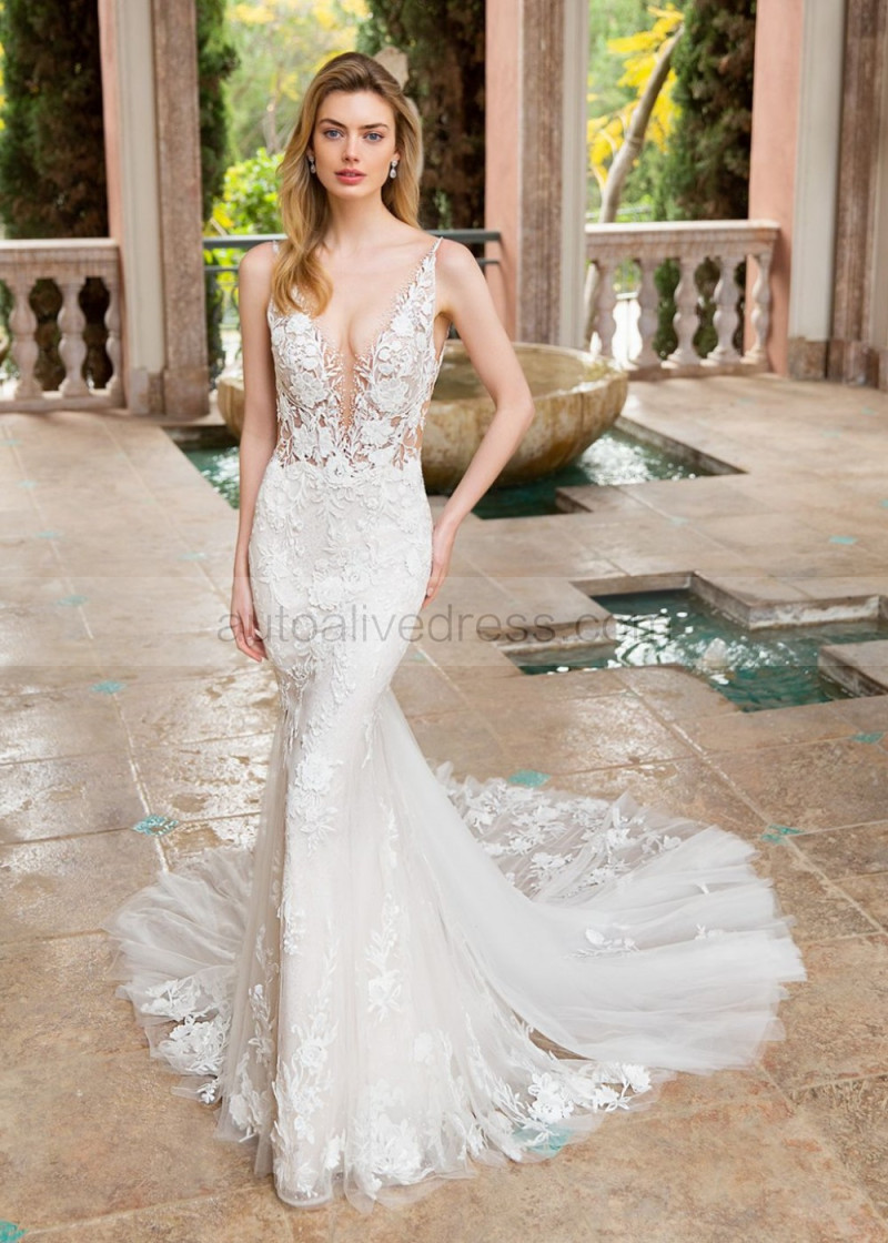Ivory Embroidered Floral Lace Tulle Sexy Shimmering Wedding Dress