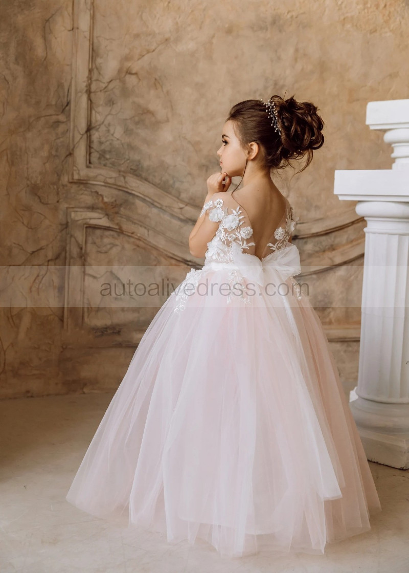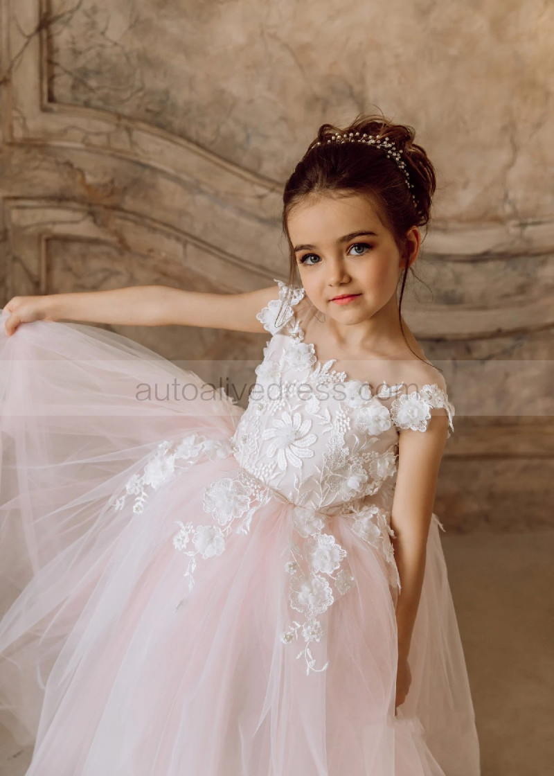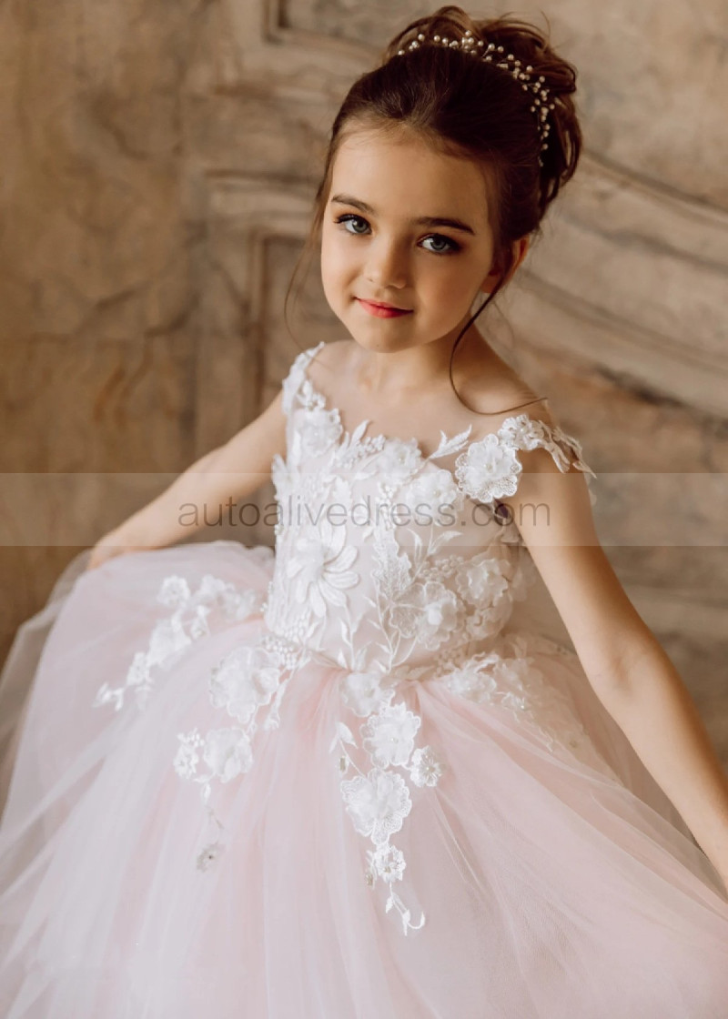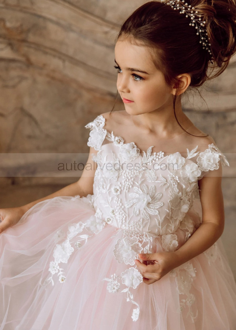 Ivory Floral Lace Blush Pink Tulle Flower Girl Dress