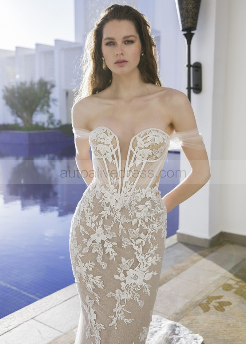 Ivory Floral Lace Tulle Glitter Wedding Dress With Detachable Straps