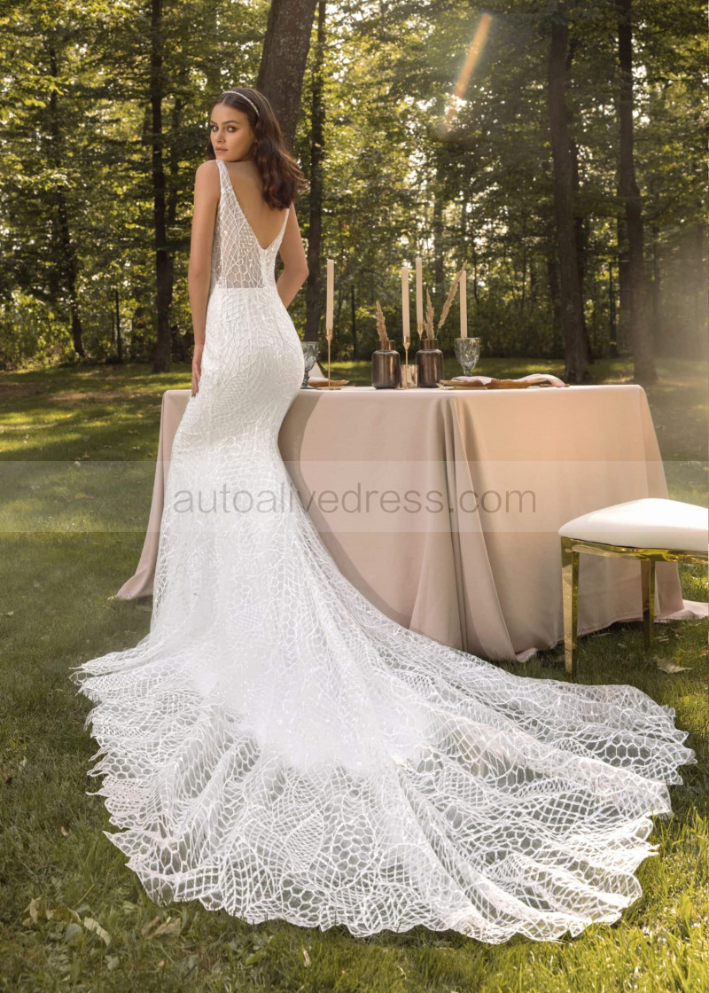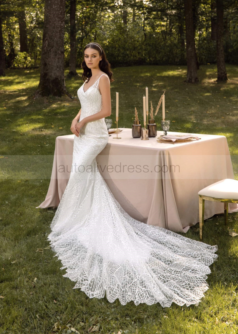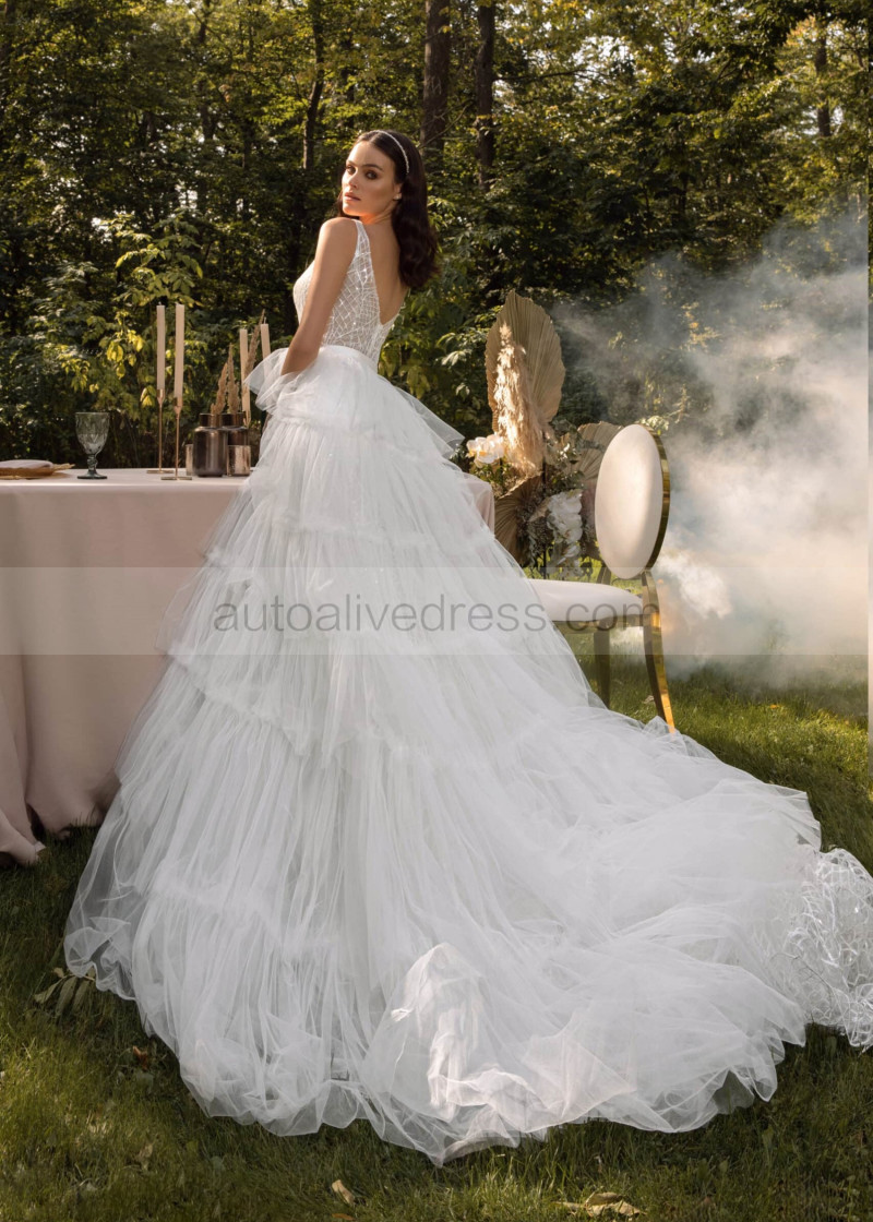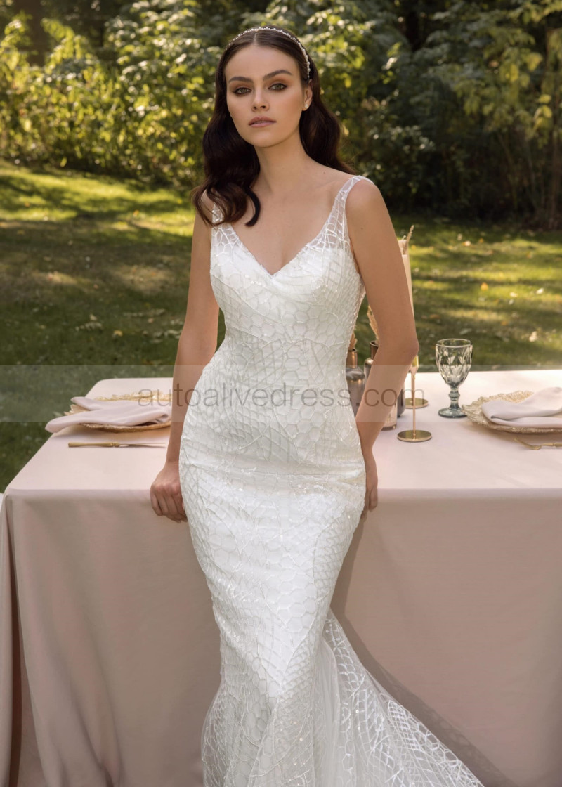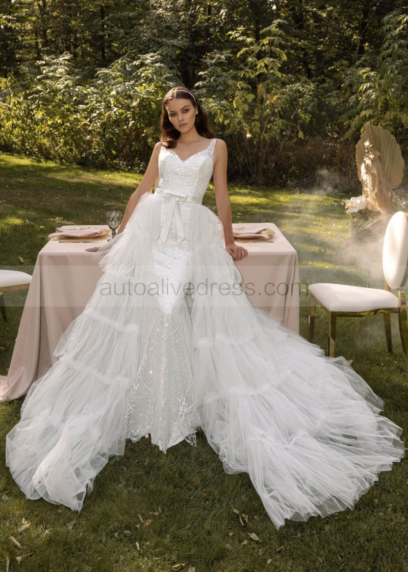 Ivory Glitter Lace Luxurious Wedding Dress With Detachable Tulle Train