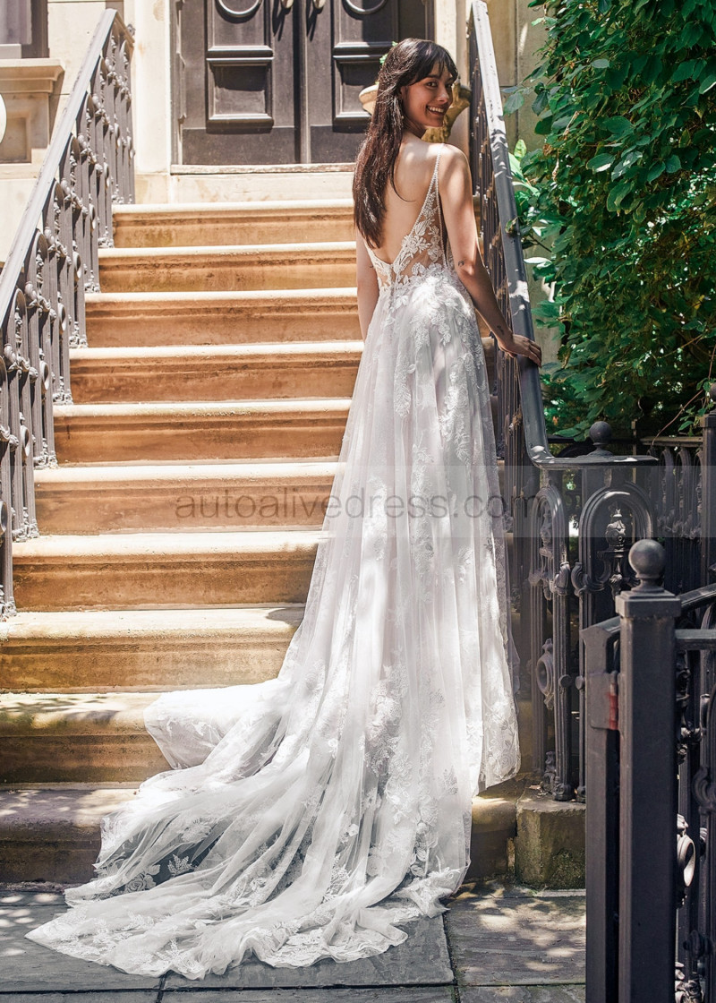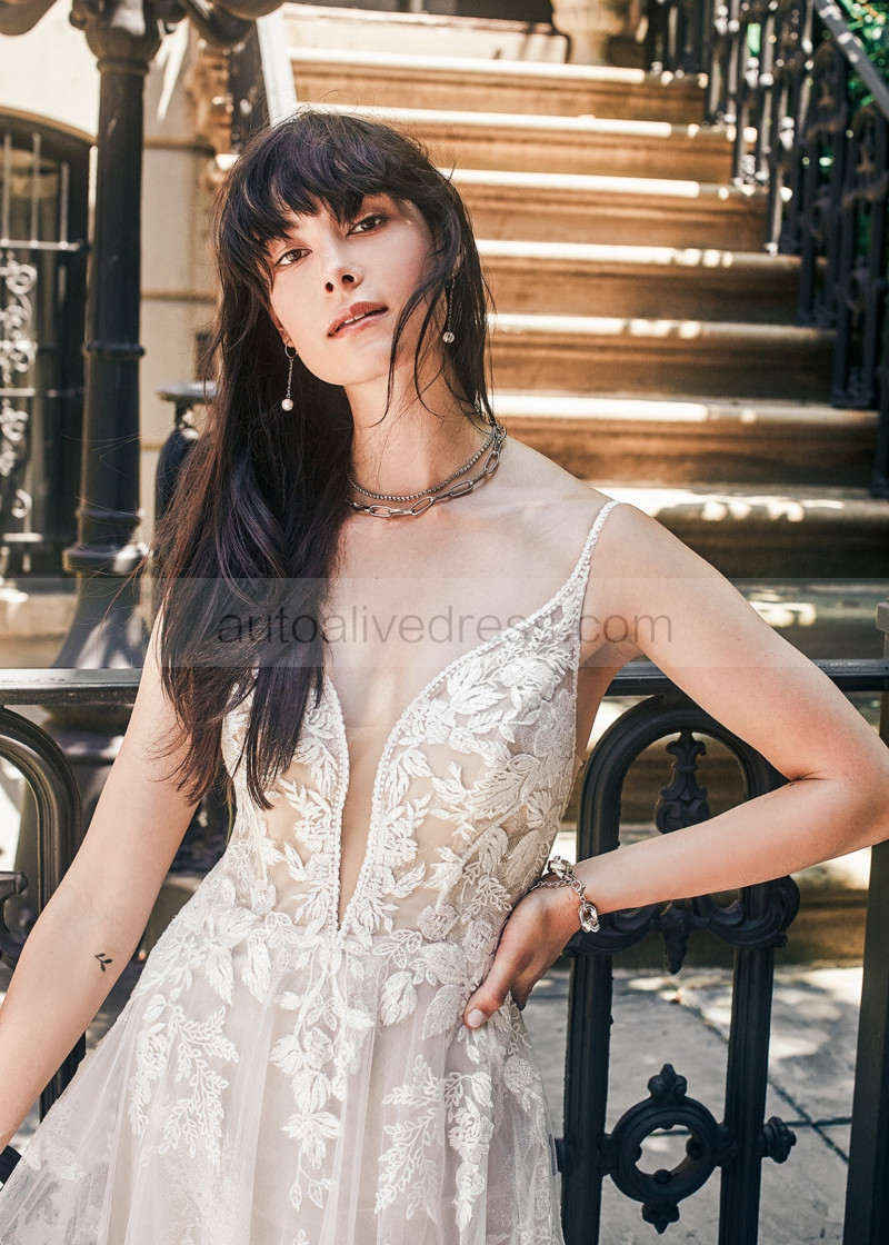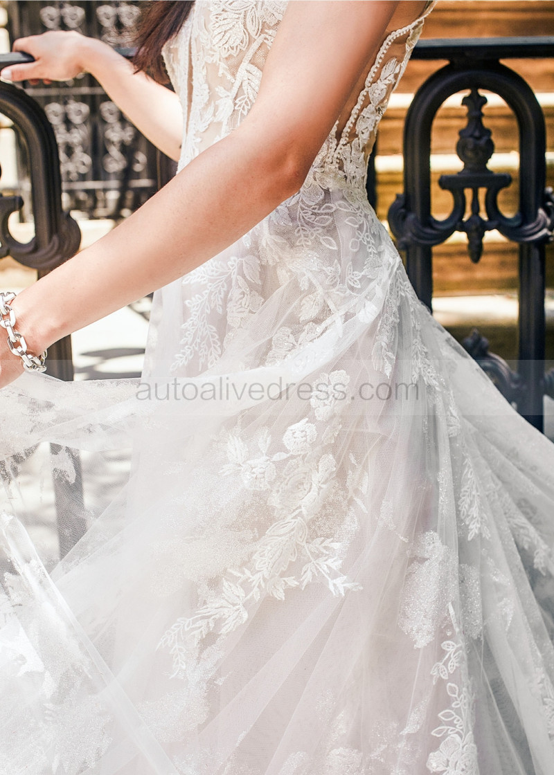 Ivory Glitter Lace Tulle Deep V Back Elegant Wedding Dress