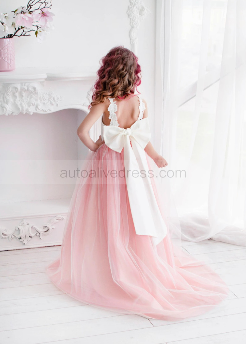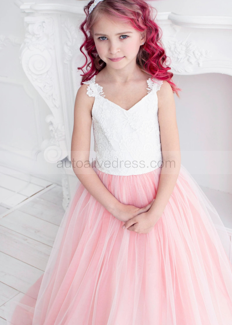Ivory Lace Coral Pink Tulle Wedding Flower Girl Dress