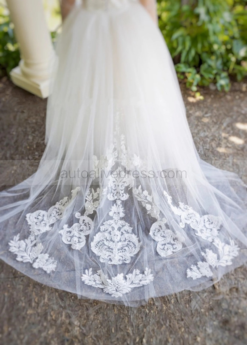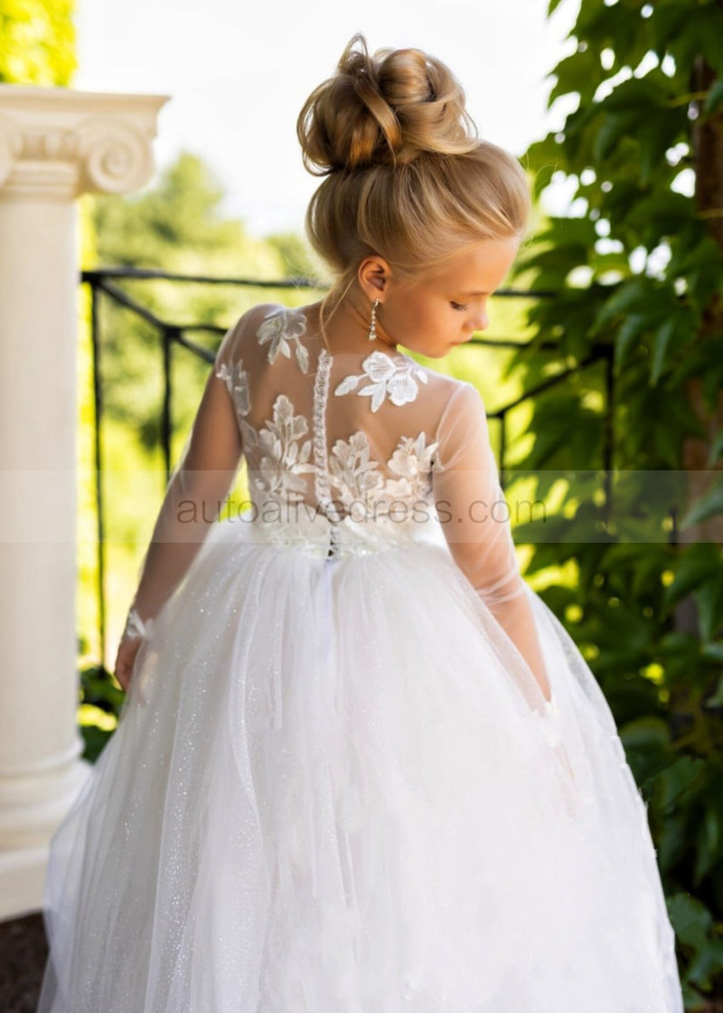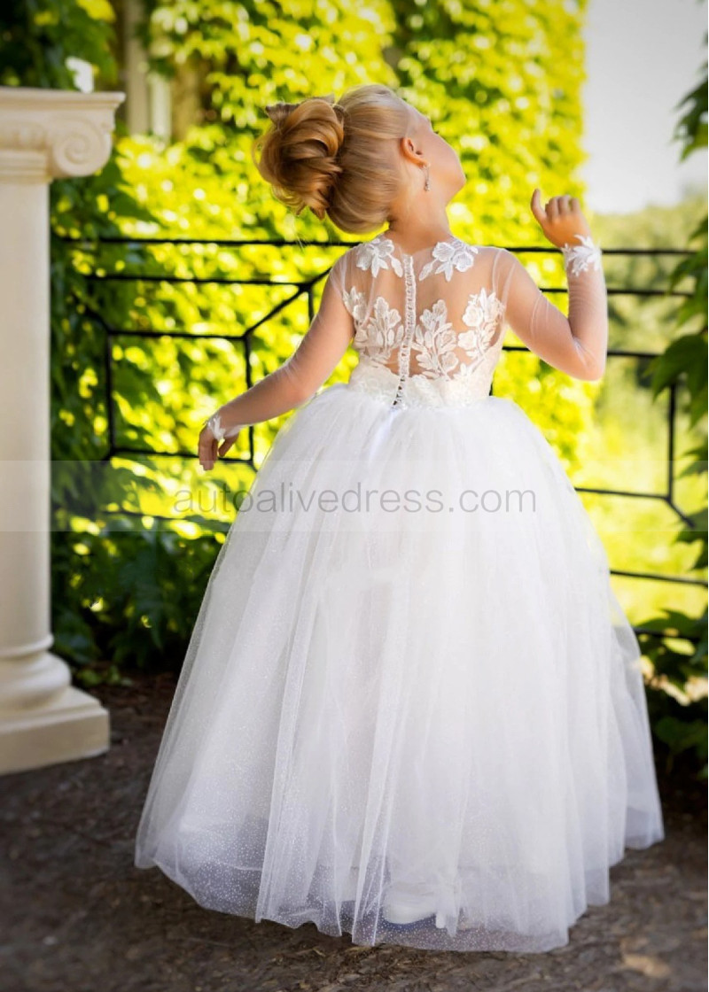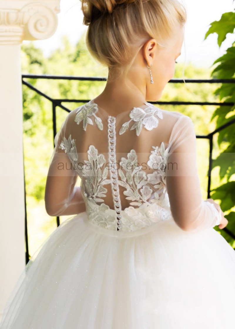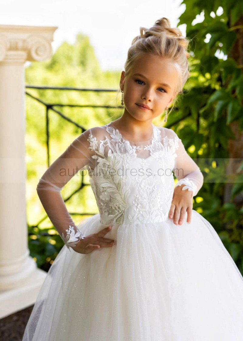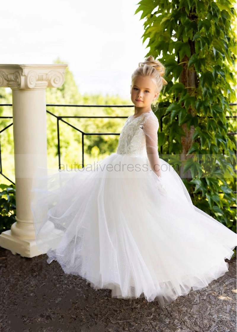 Ivory Lace Glitter Tulle Flower Girl Dress With Removable Train