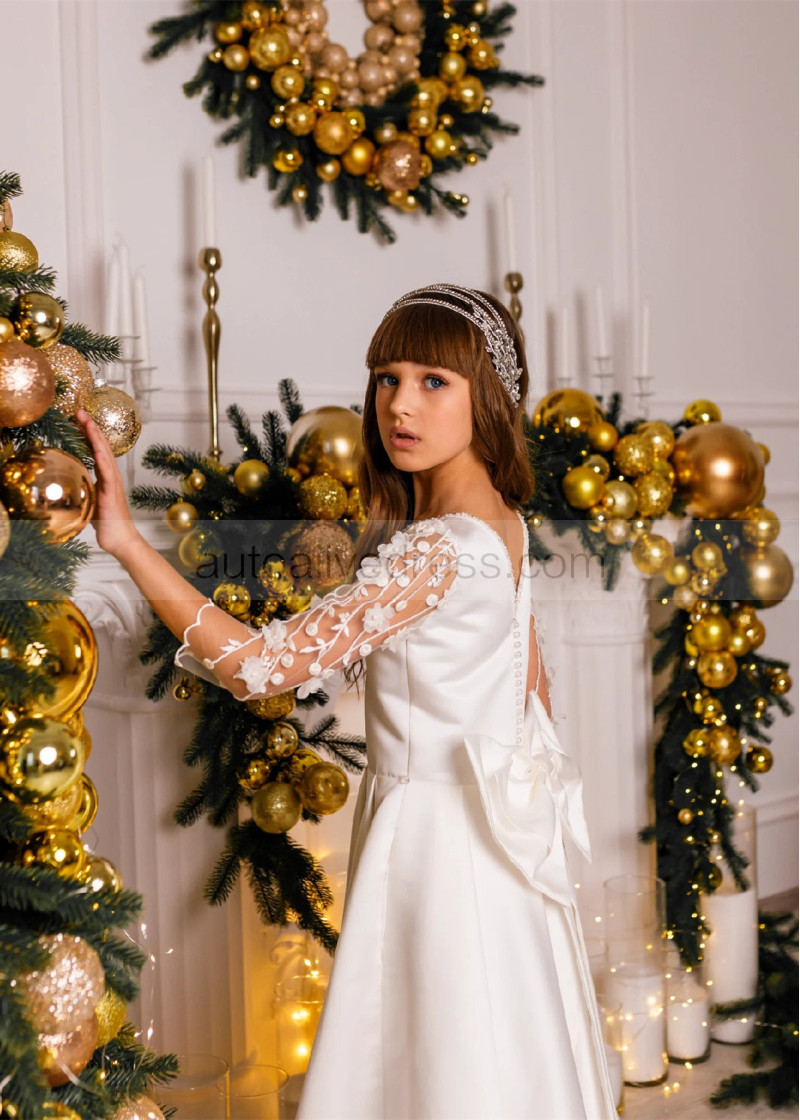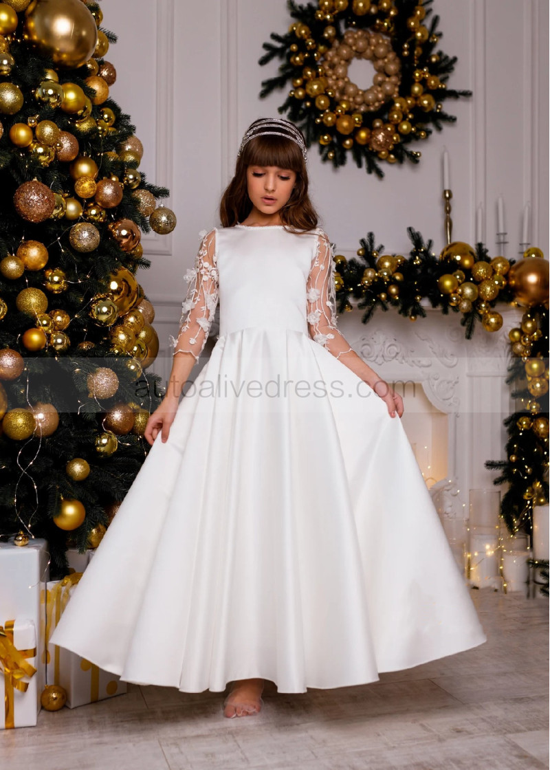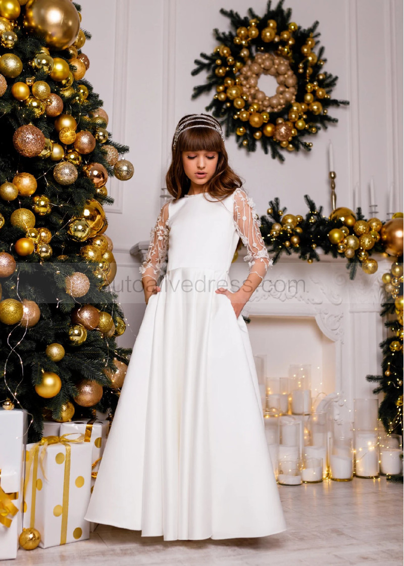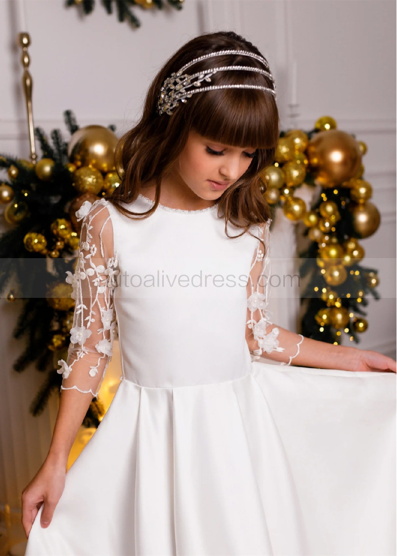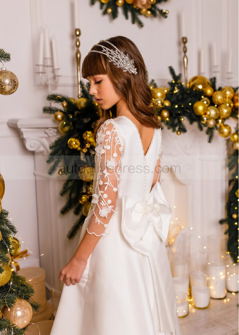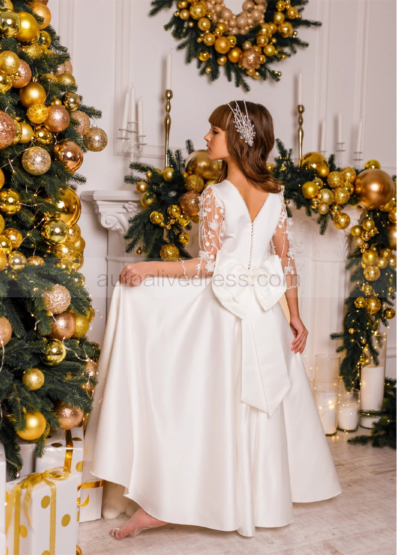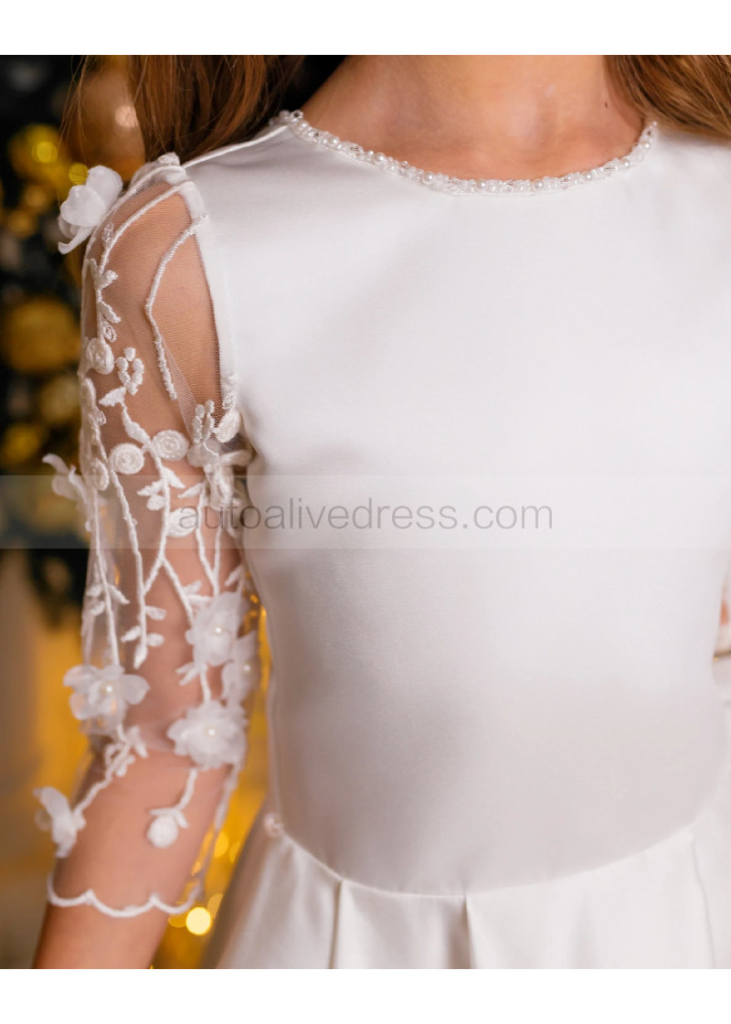 Ivory Lace Satin Beaded Flower Girl Dress Wedding Party Dress