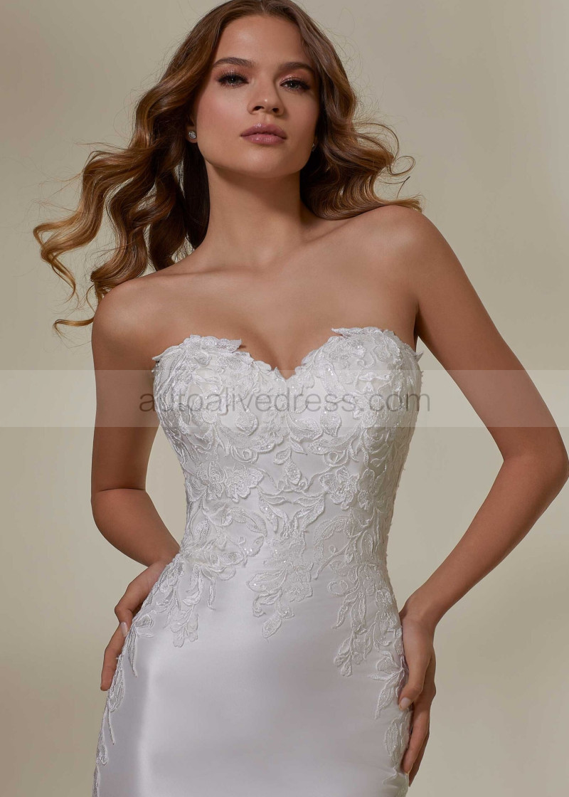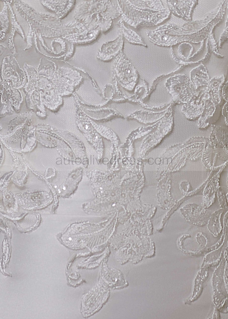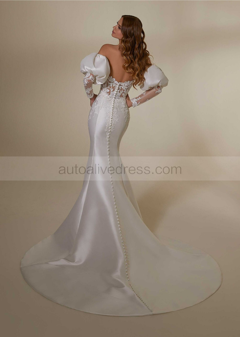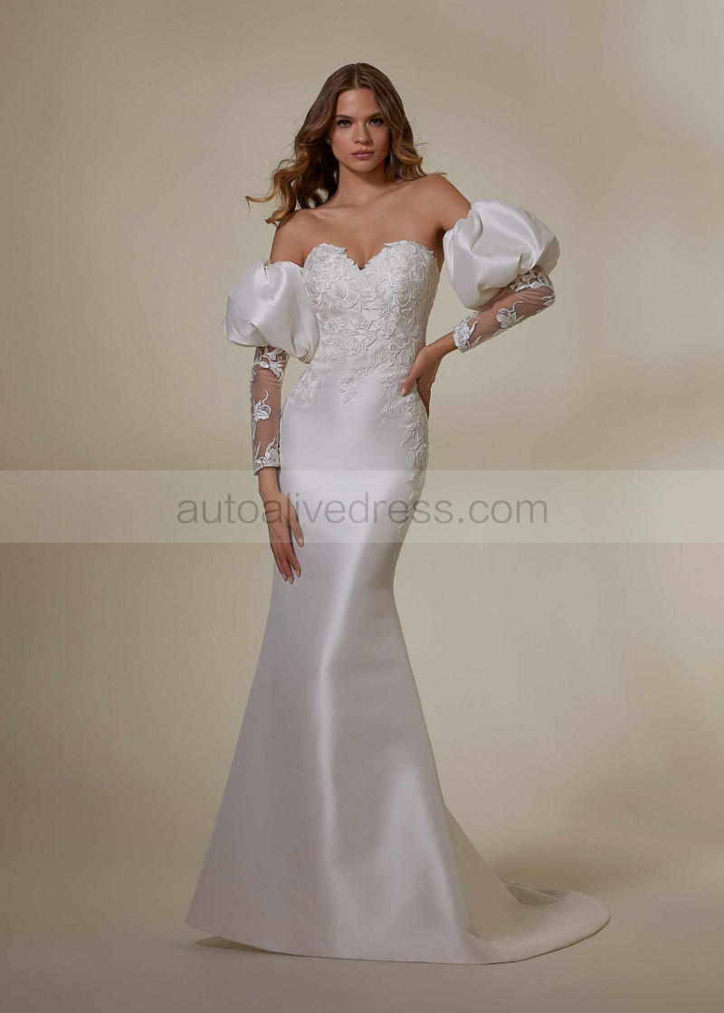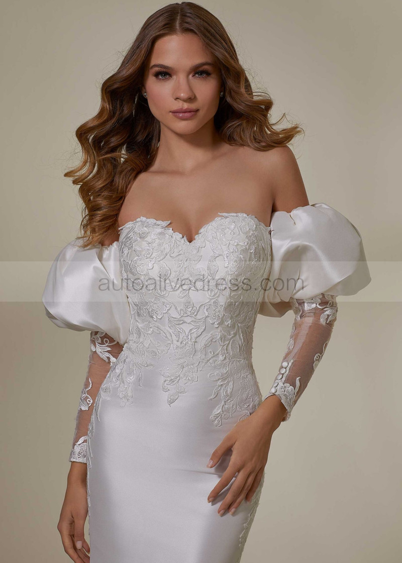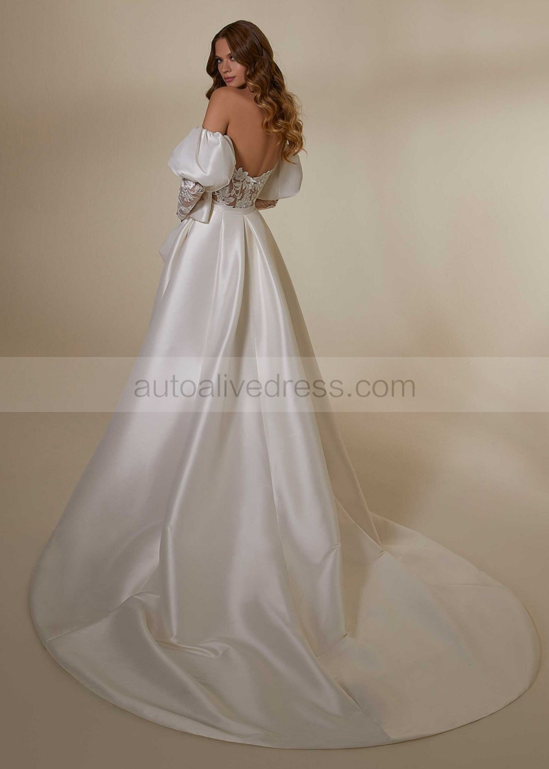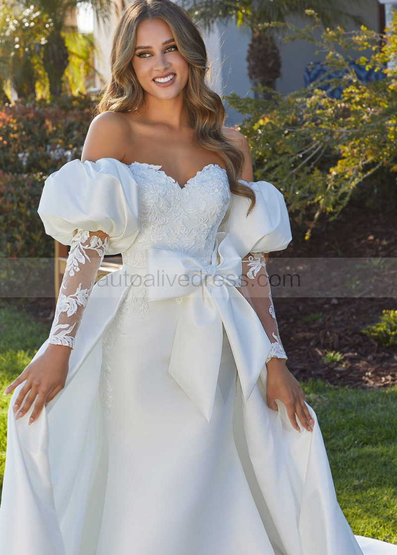 Ivory Lace Satin Elegant Wedding Dress With Detachable Sleeves Overskirt