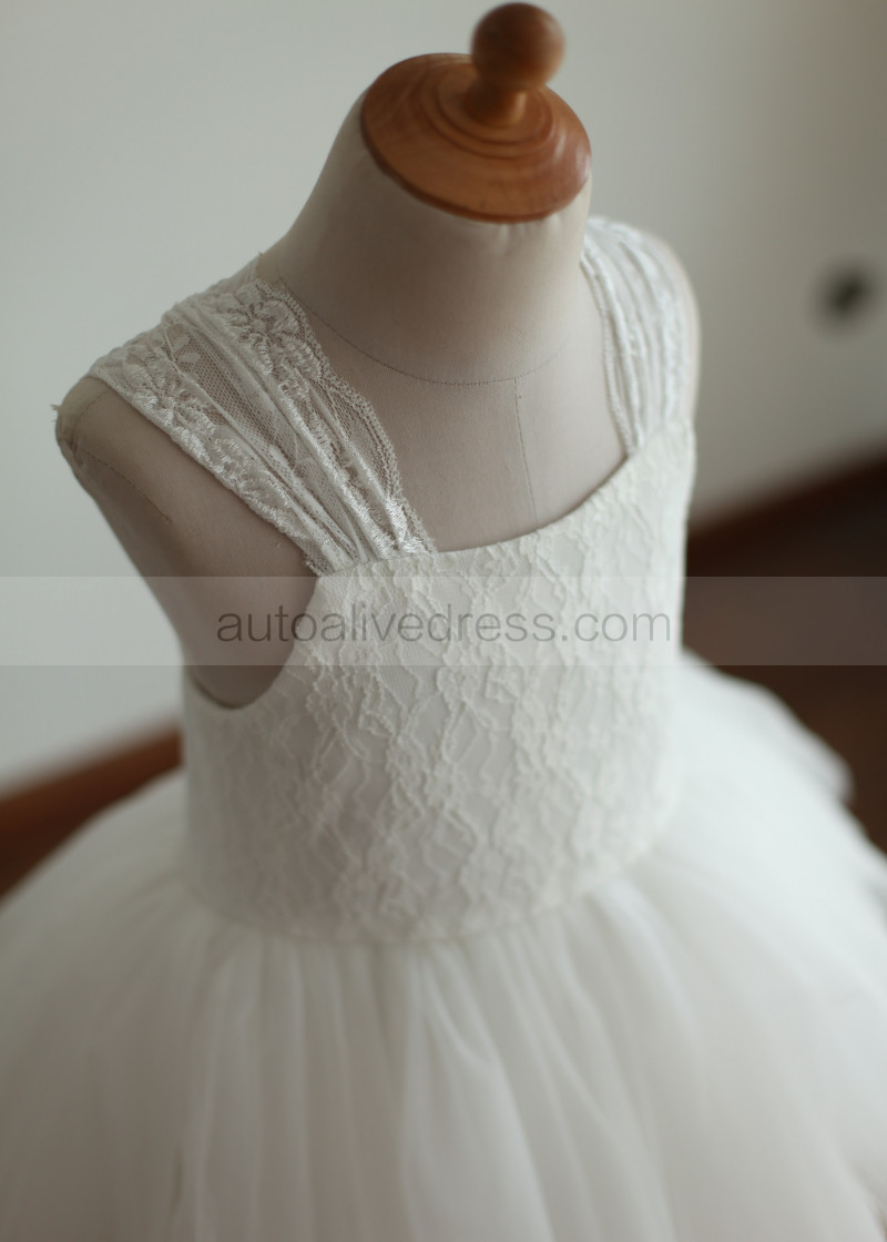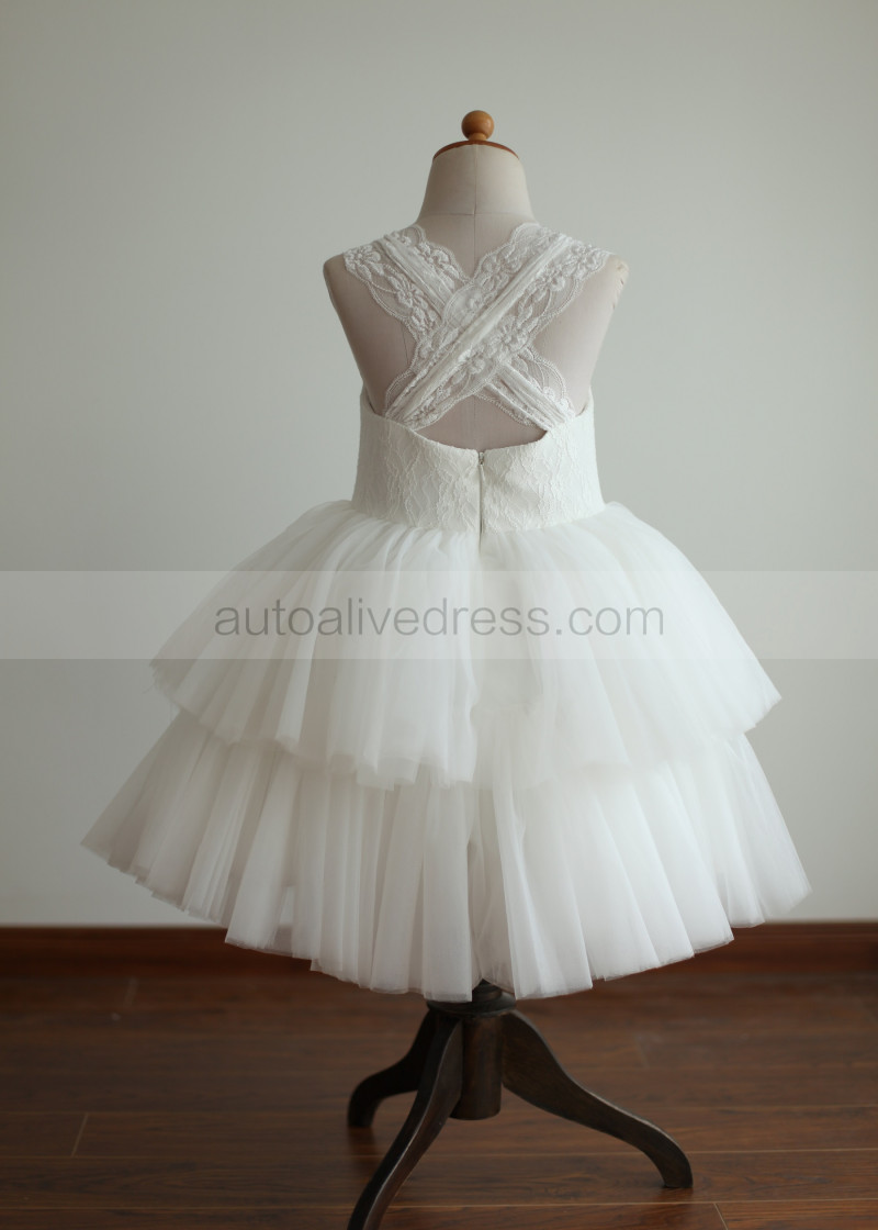 Ivory Lace Tiered Tulle Tea Length Cross Back Flower Girl Dress