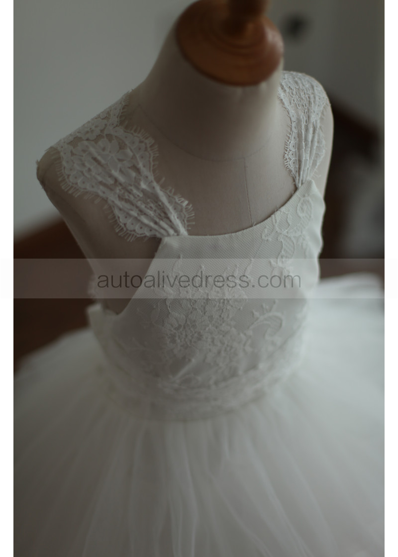 Ivory Lace Tulle Cross Back Tiered Flower Girl Dress
