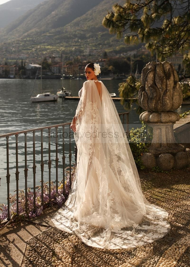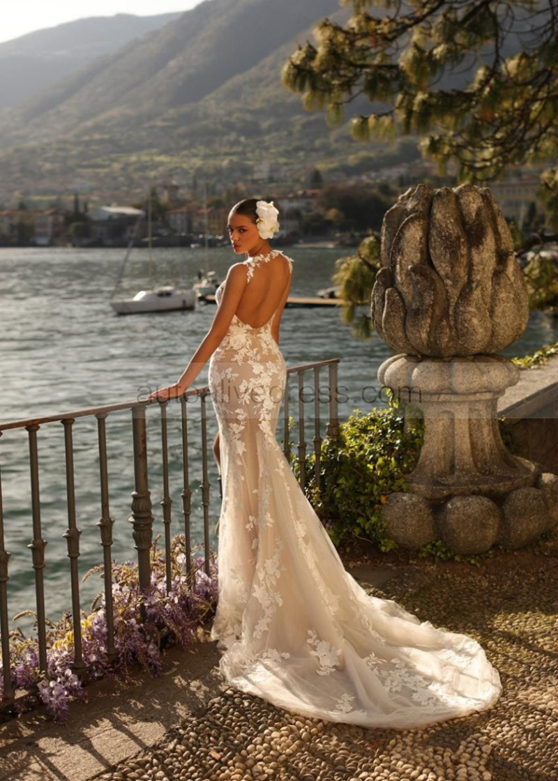 Ivory Lace Tulle Keyhole Back Wedding Dress With Removable Train