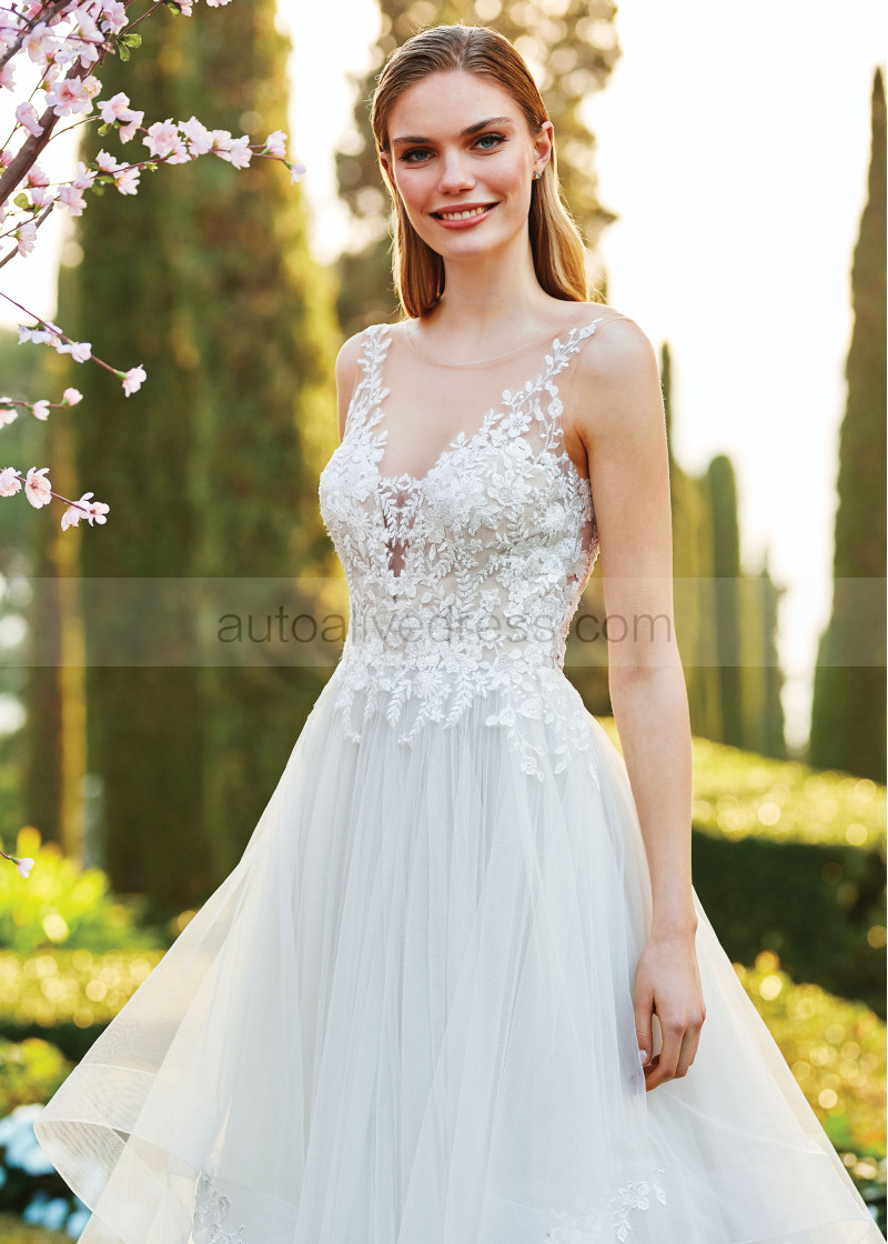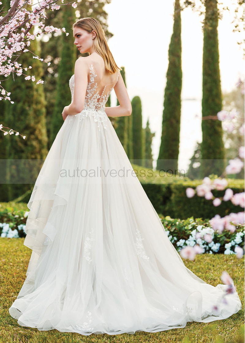 Ivory Lace Tulle Ruffle Sheer Back Wedding Dress