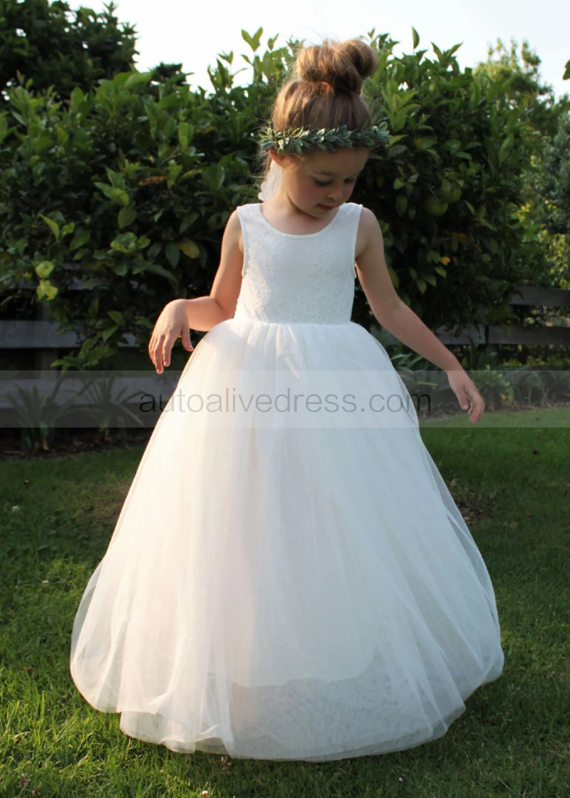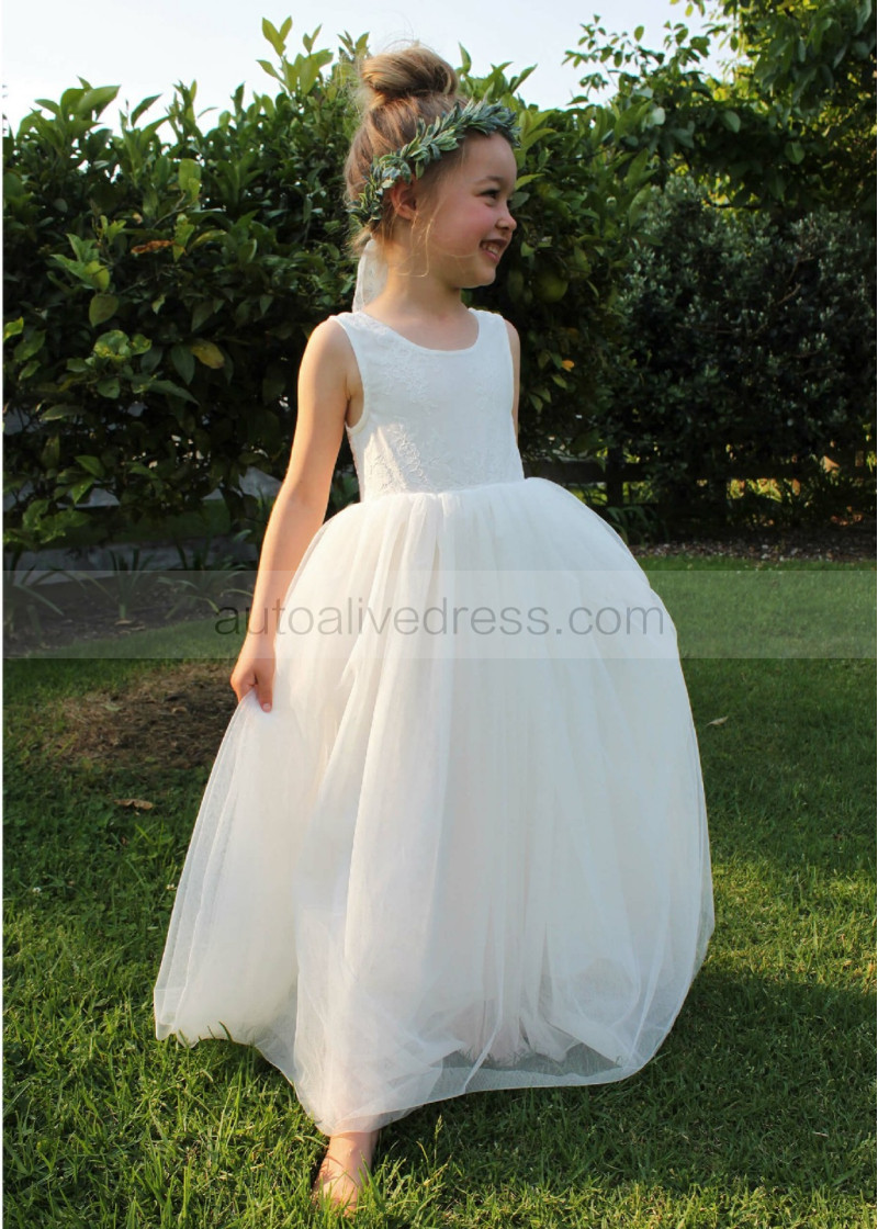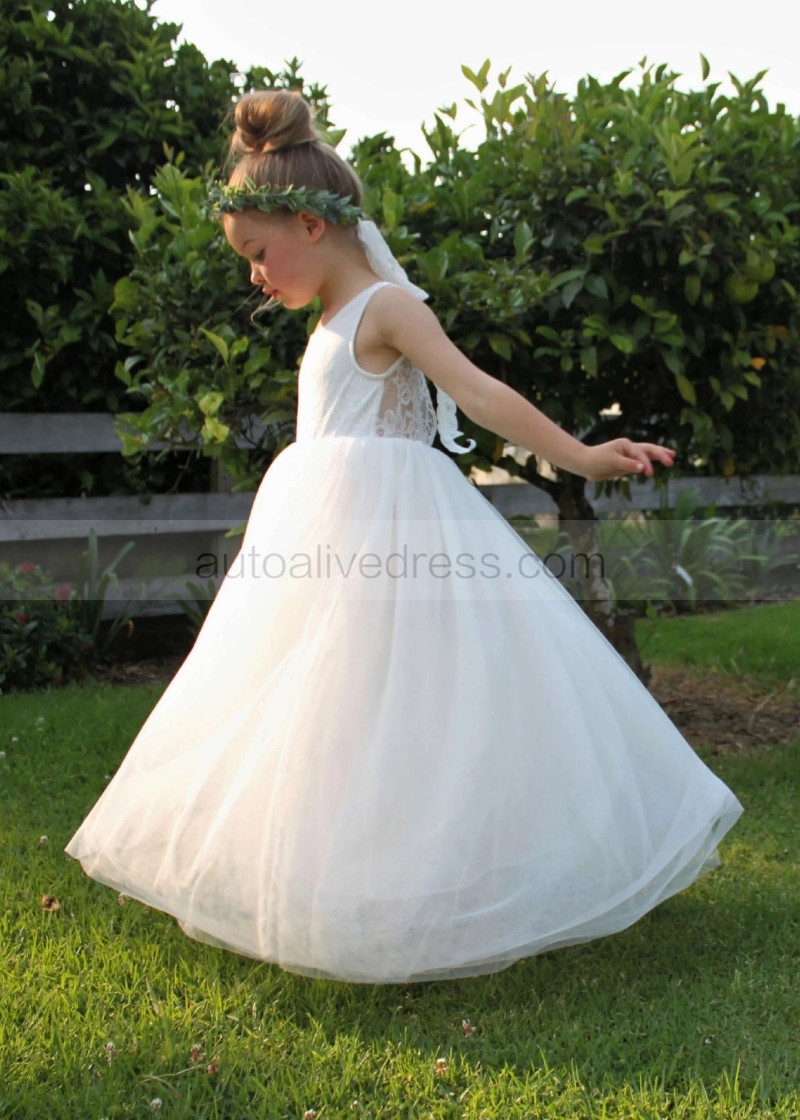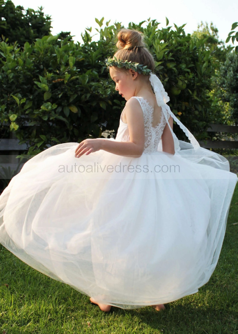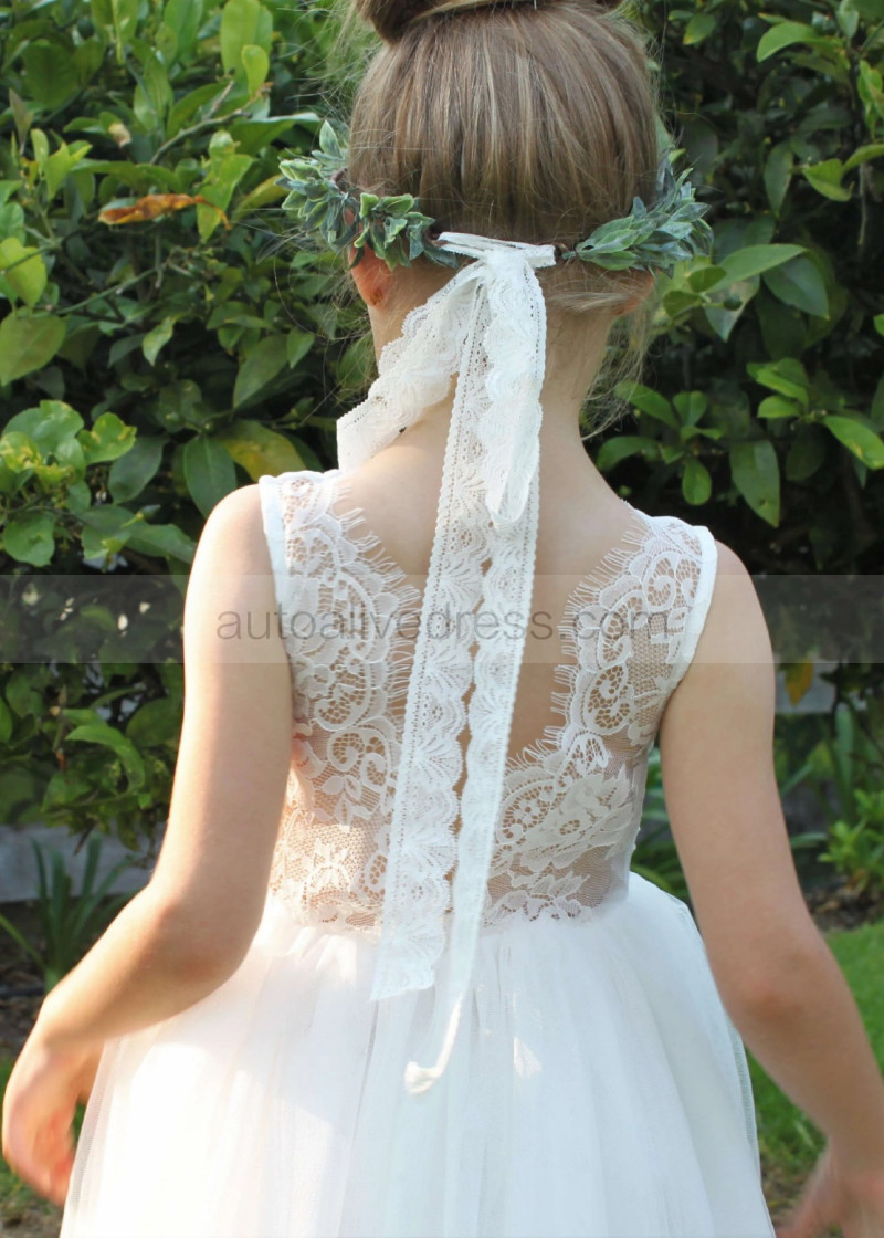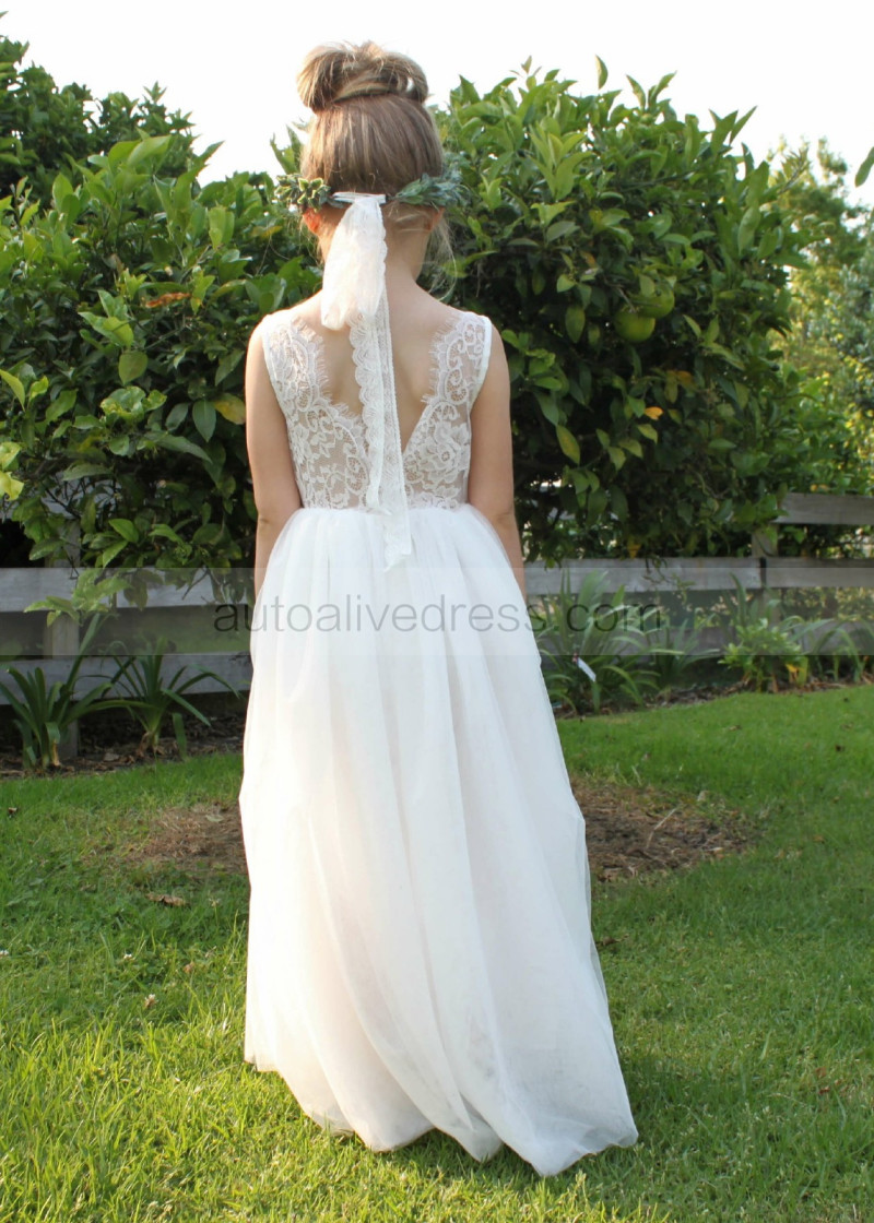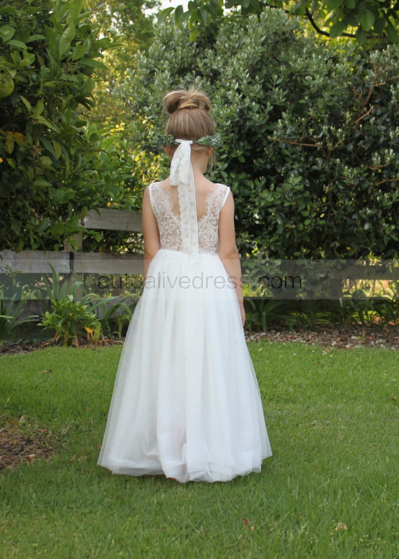 Ivory Lace Tulle Sheer Back Flower Girl Dress