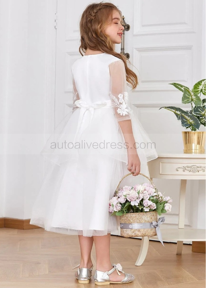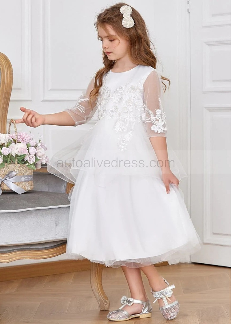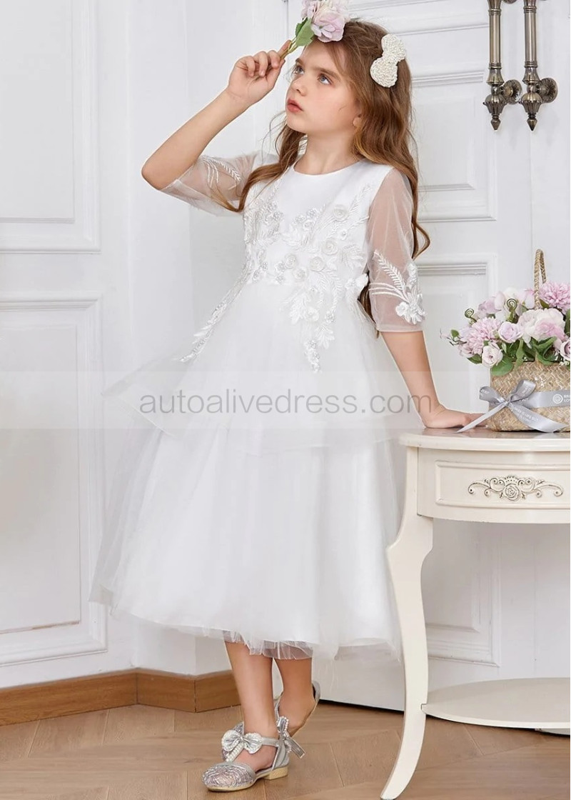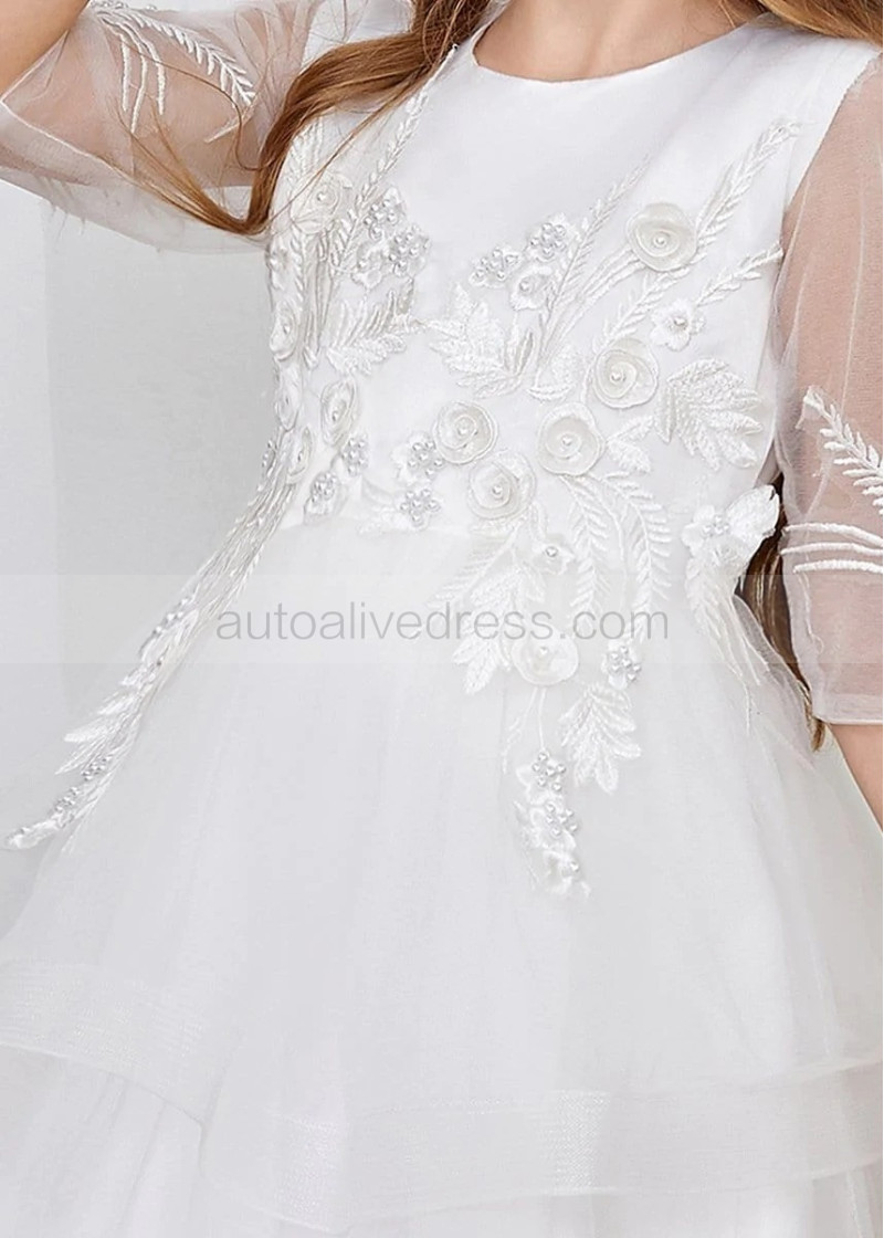 Ivory Pearl Beaded Embroidered Lace Tulle Flower Girl Dress