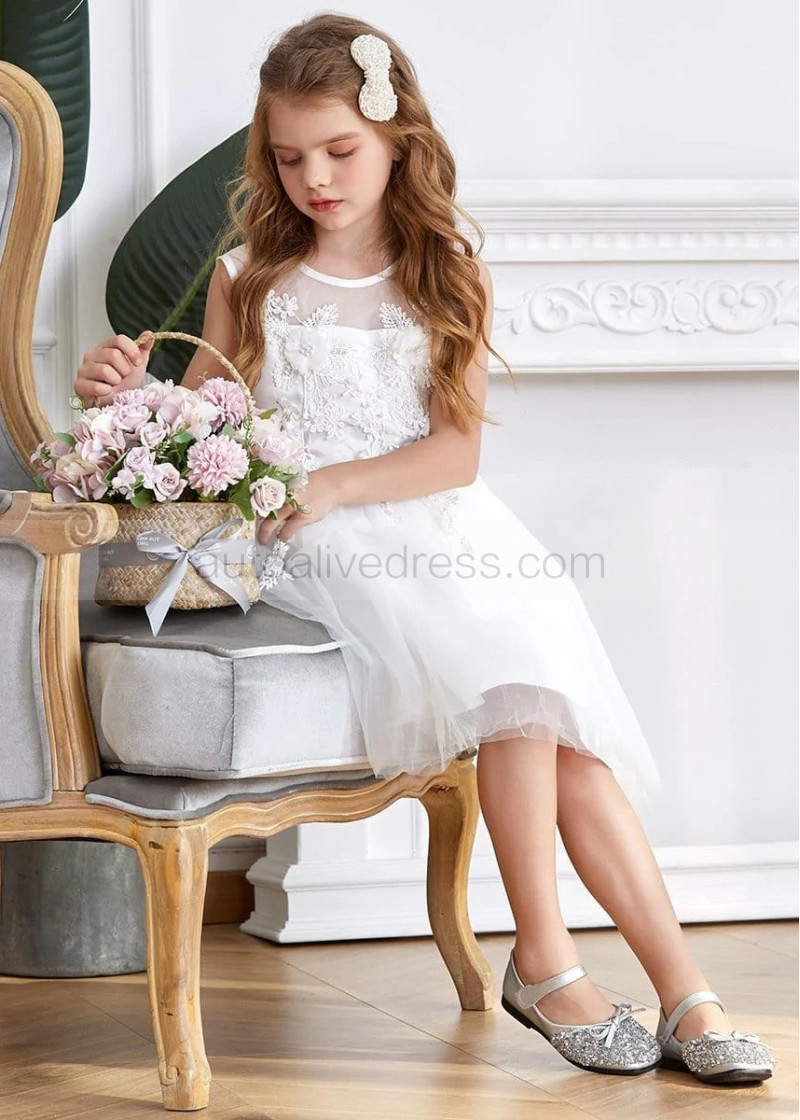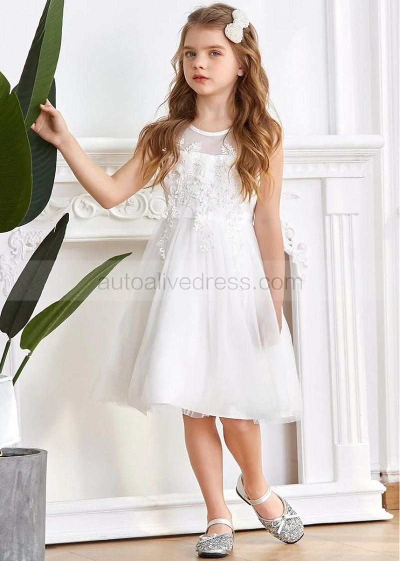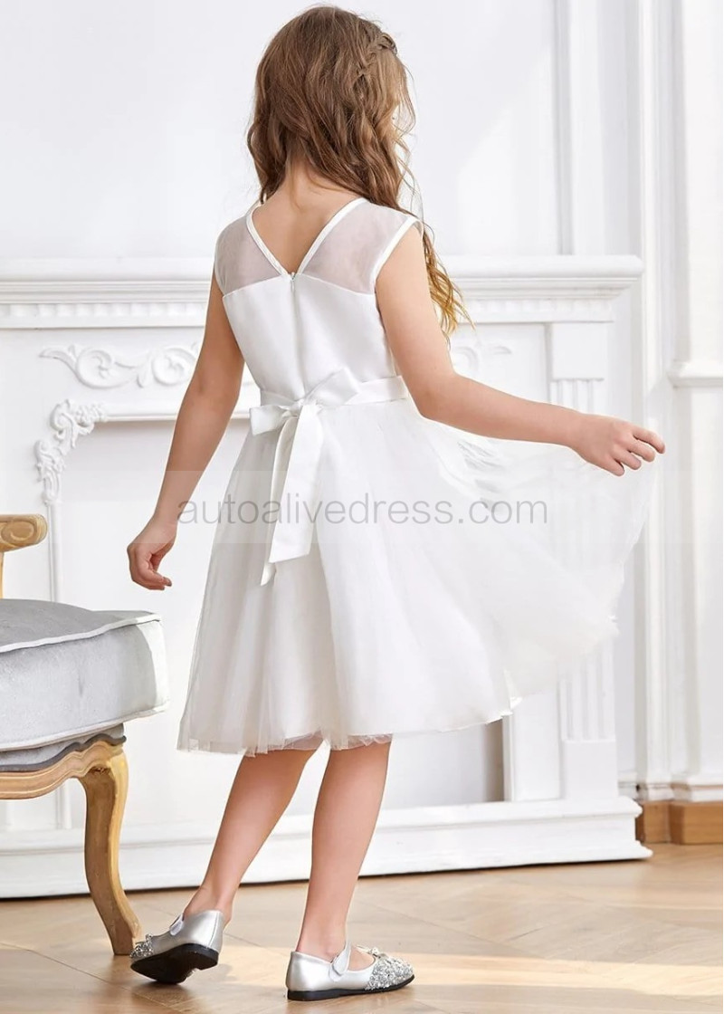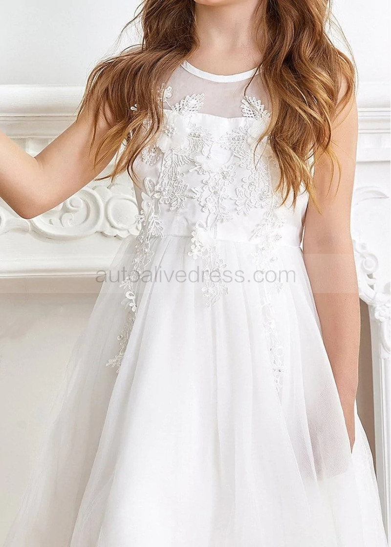 Ivory Pearl Beaded Lace Tulle V Back Flower Girl Dress