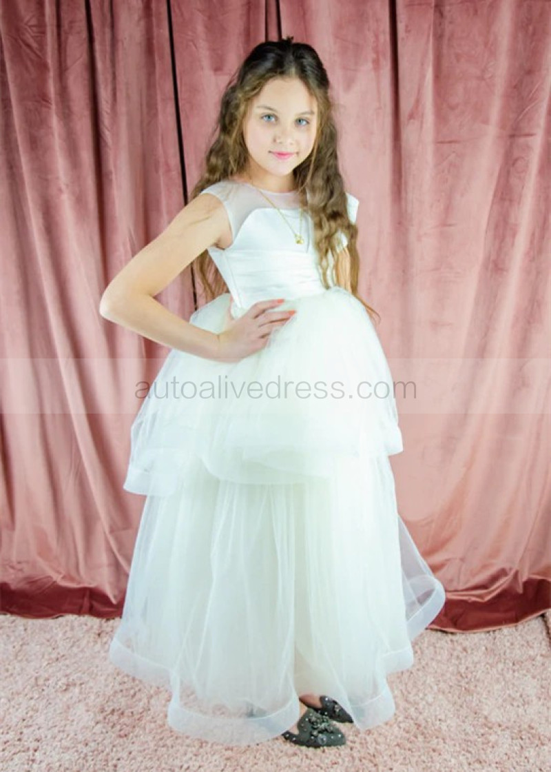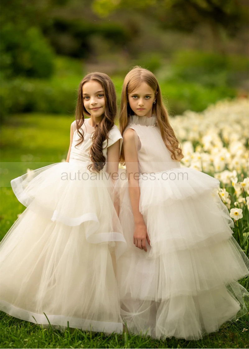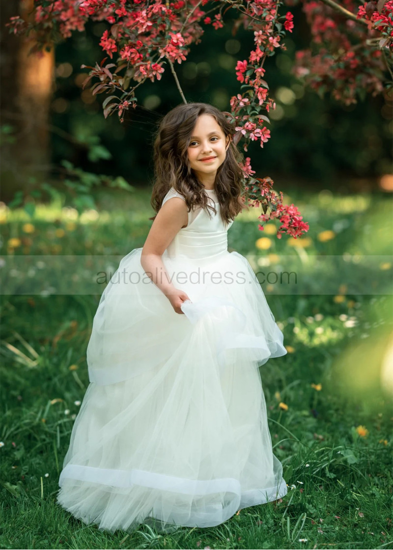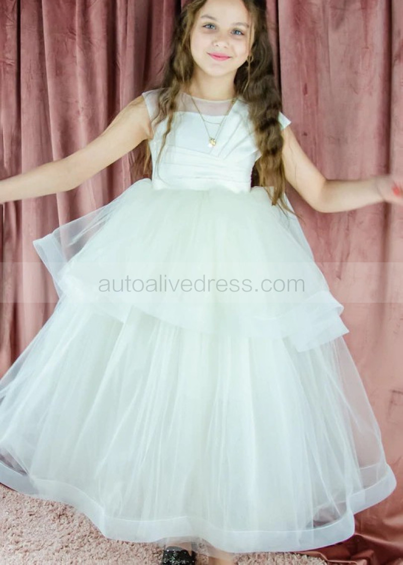 Ivory Pleated Satin Tulle Tiered Flower Girl Dress