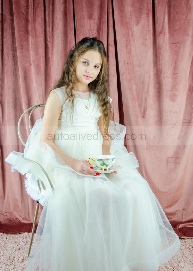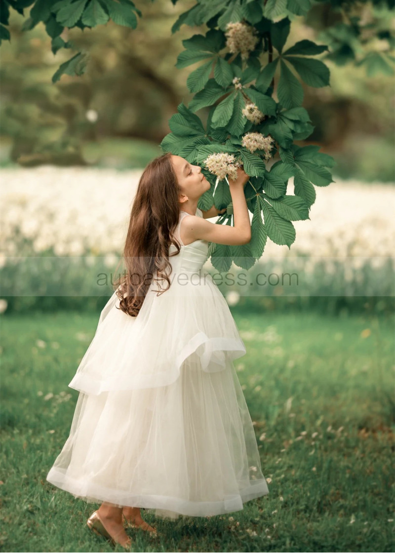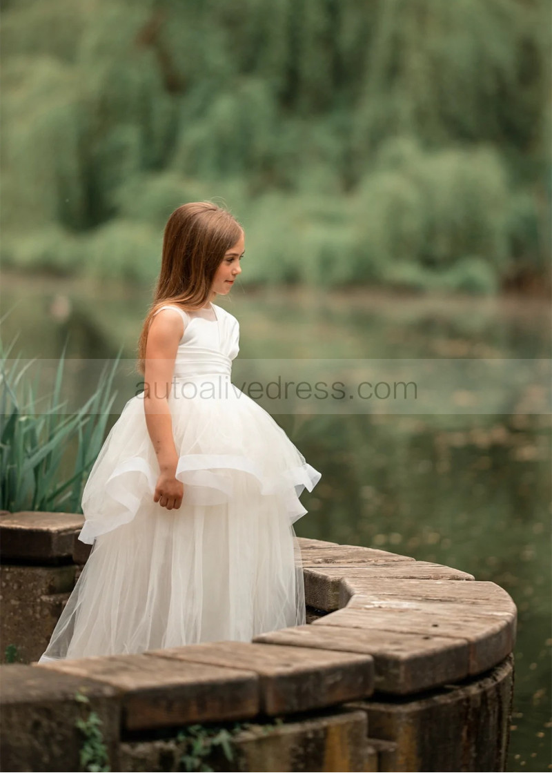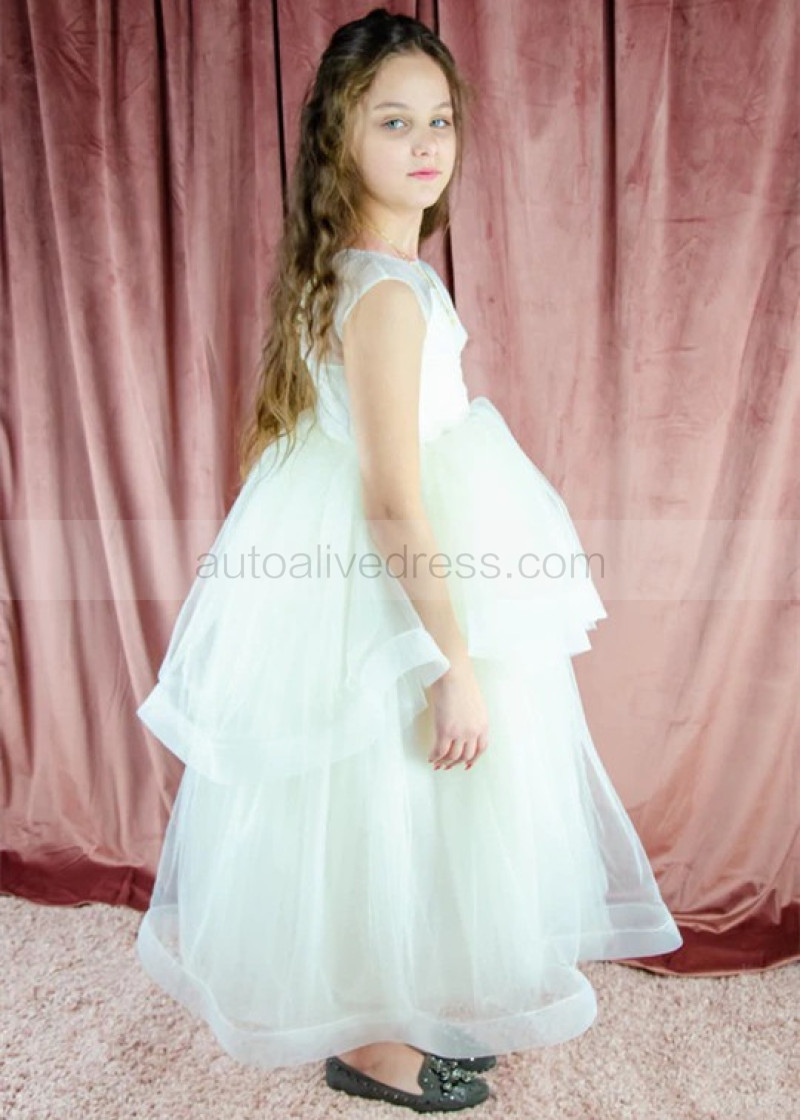 Ivory Pleated Satin Tulle Tiered Flower Girl Dress