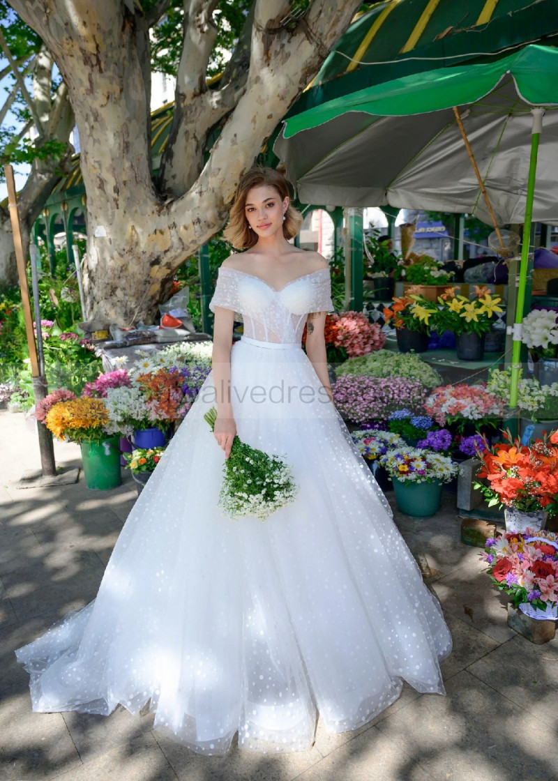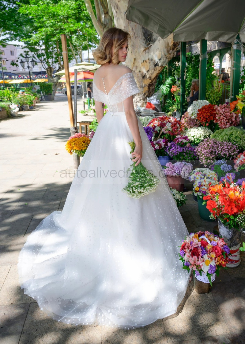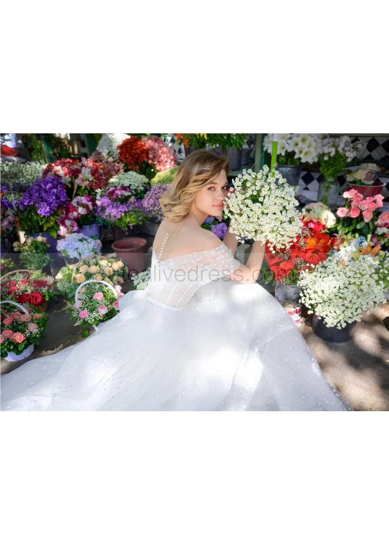 Ivory Polka Dots Tulle Pearl Buttons Back Sweet Wedding Dress
