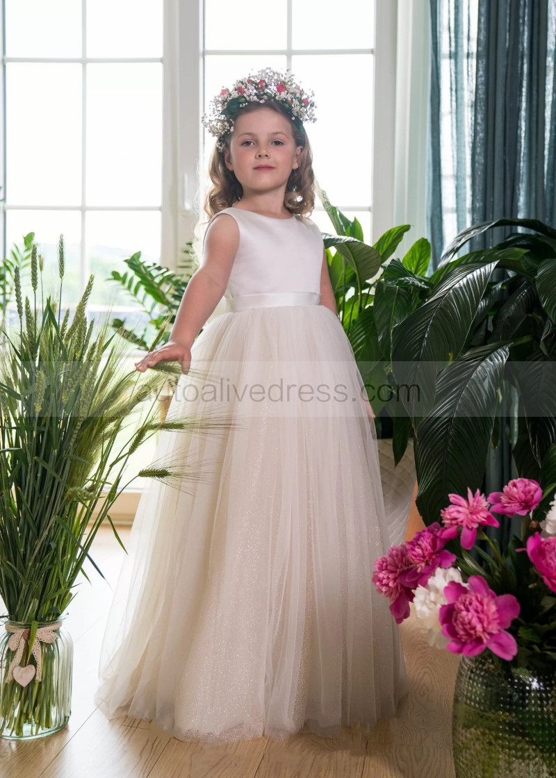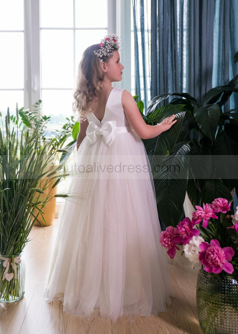 Ivory Satin Glitter Tulle V Back Flower Girl Dress