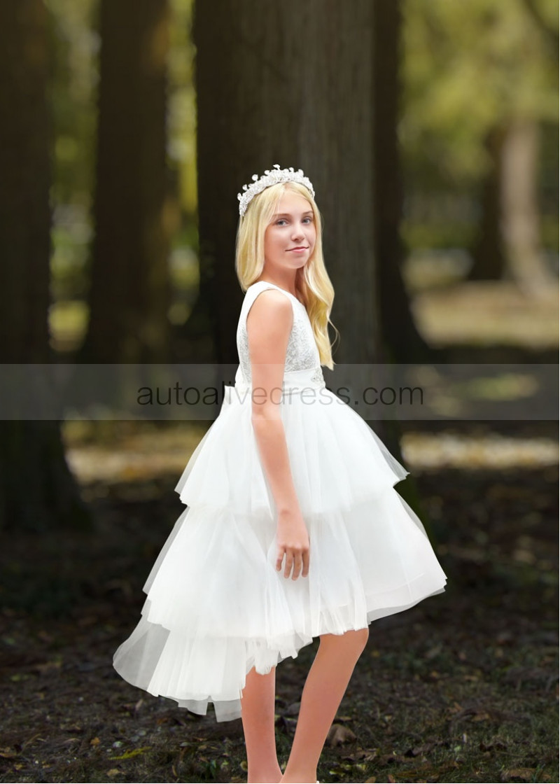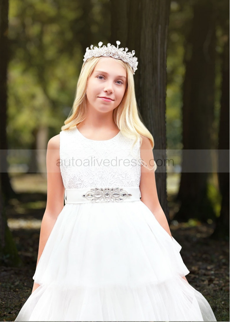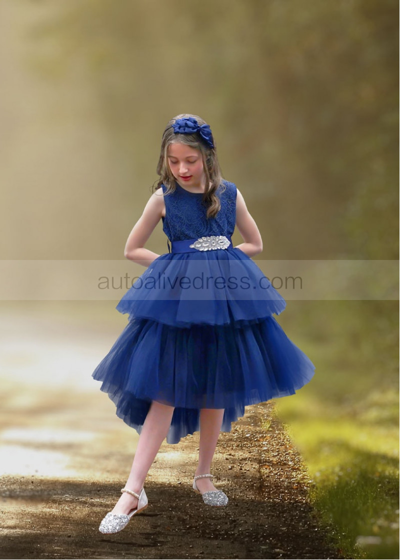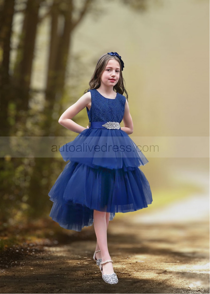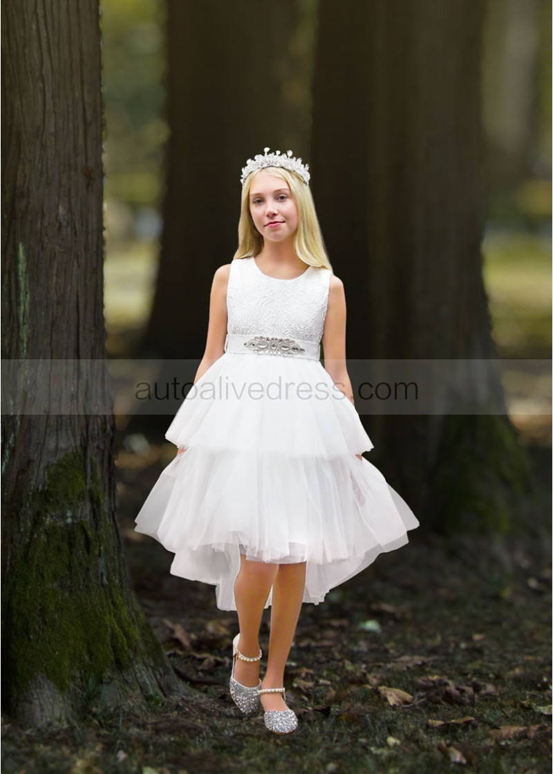 Lace Tulle High Low Flower Girl Dress With Beaded Sash