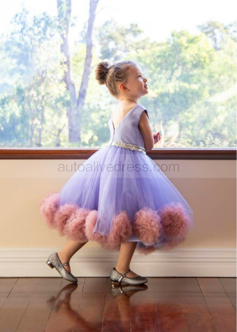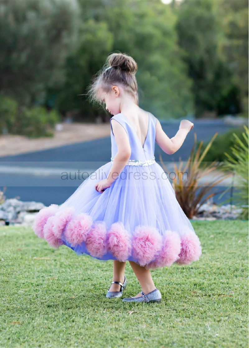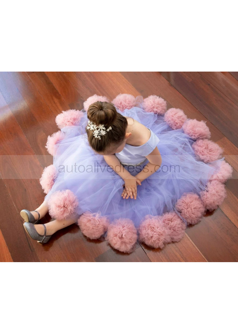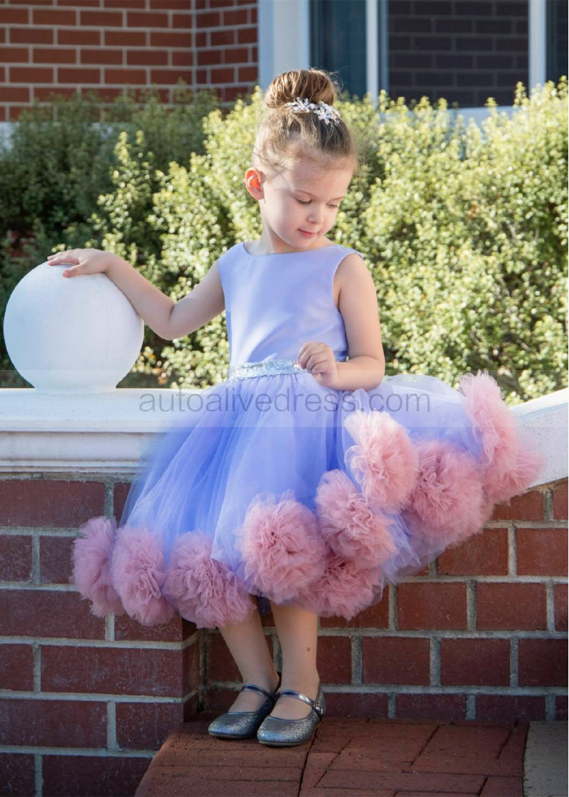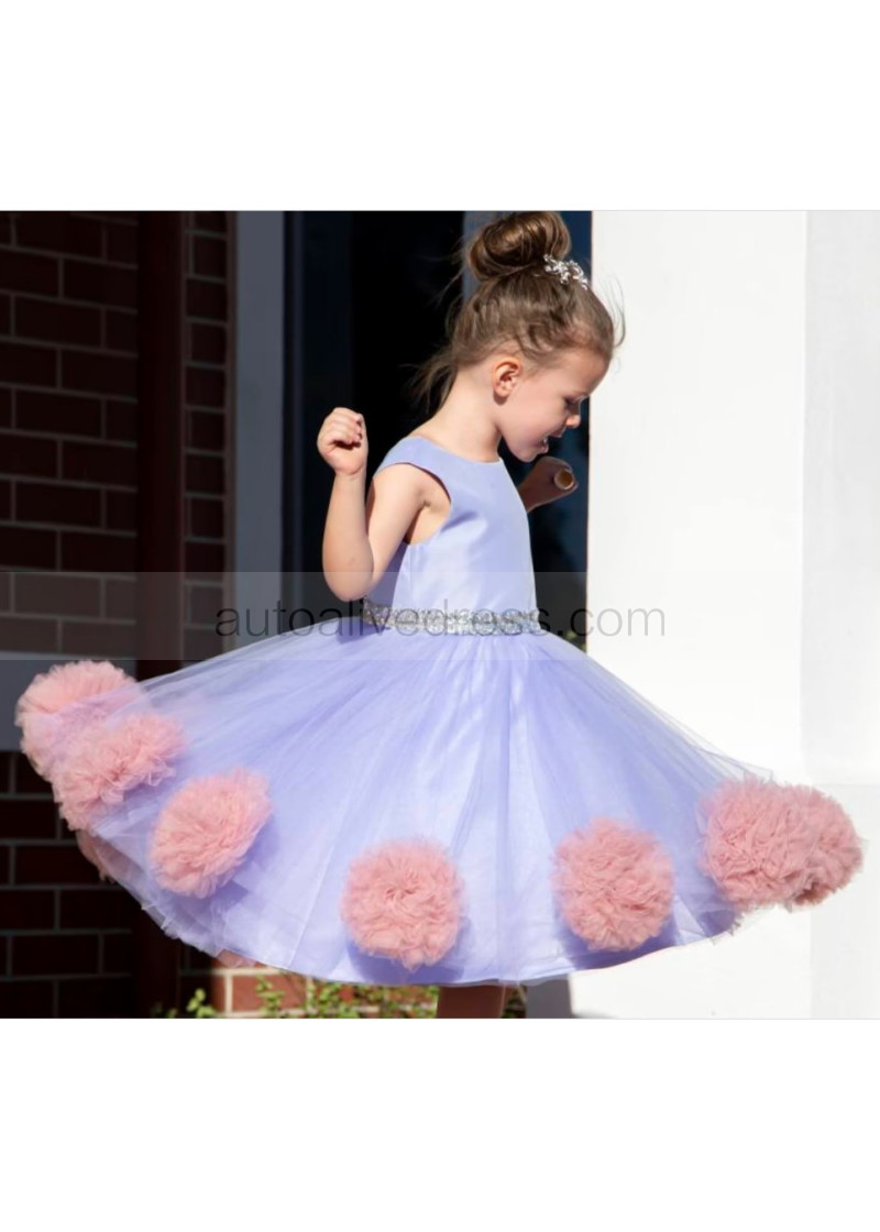 Lavender Satin Pom Pom Tulle Flower Girl Dress