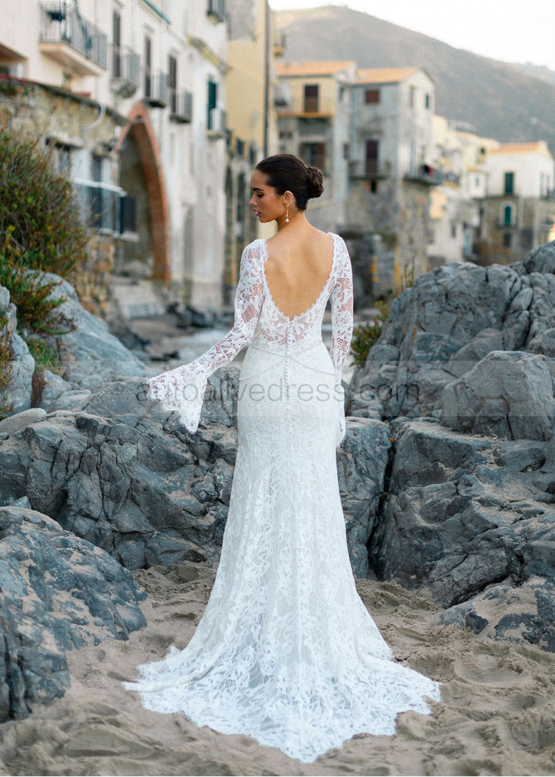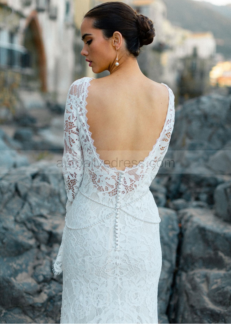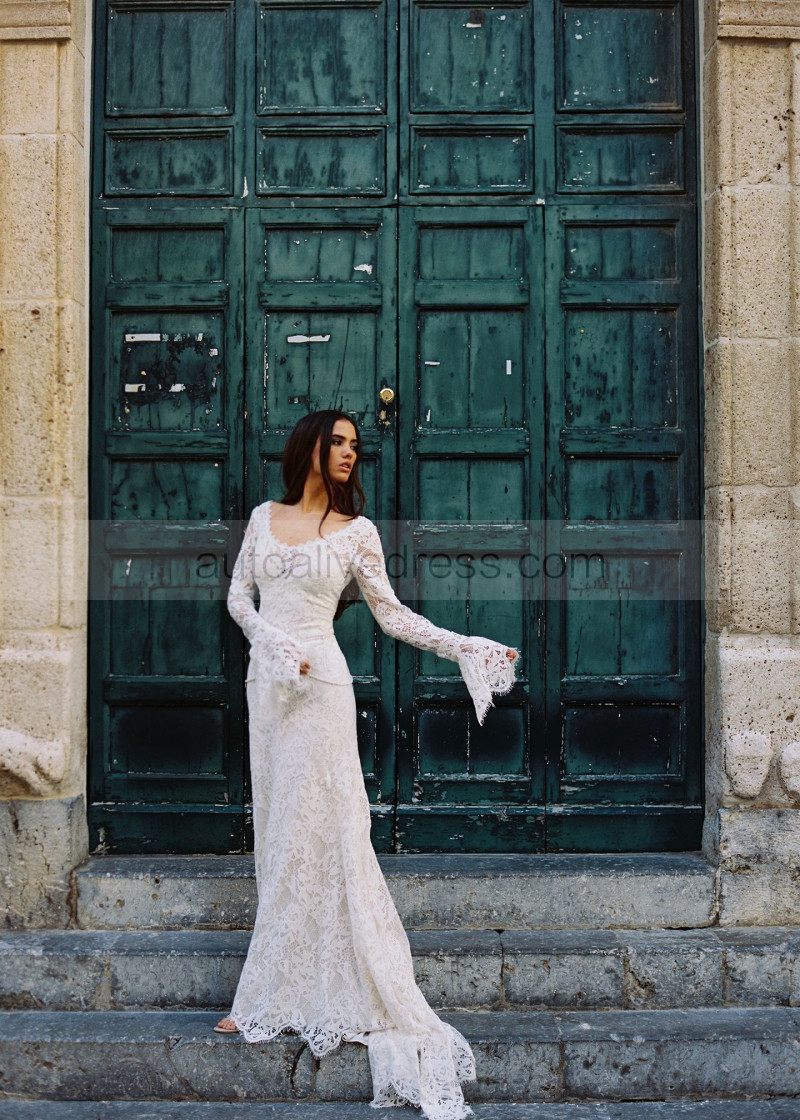 Long Bell Sleeve Ivory Lace Pearl Embellished Wedding Dress