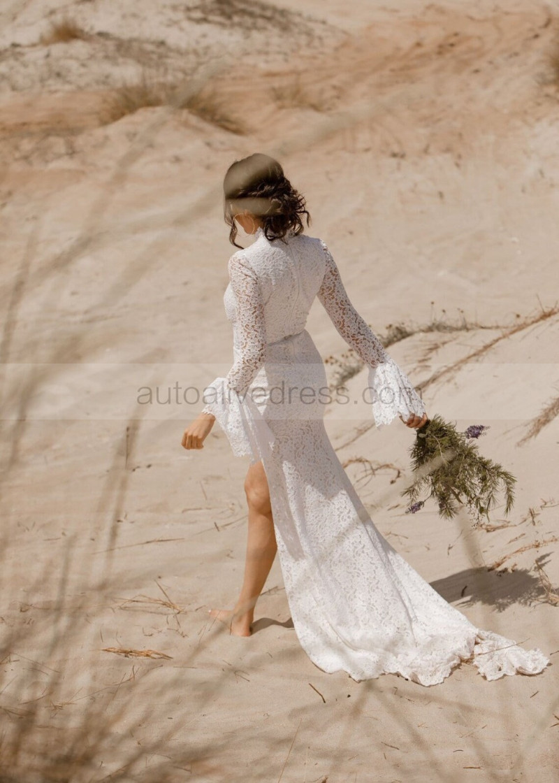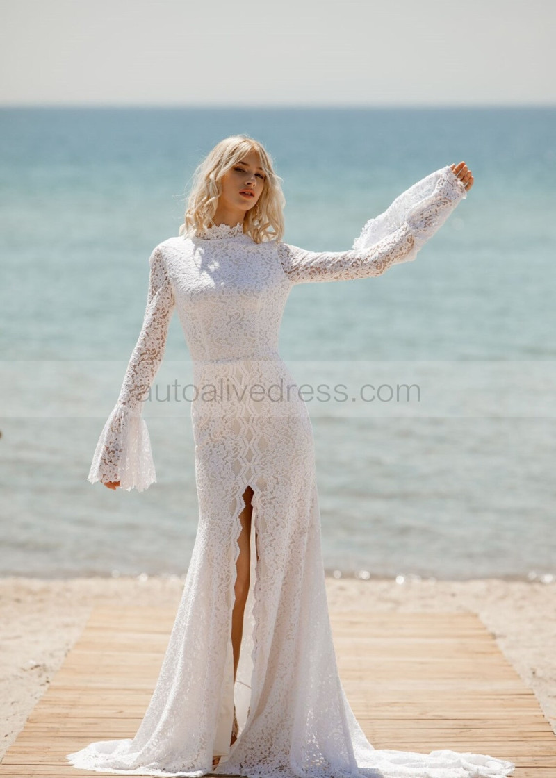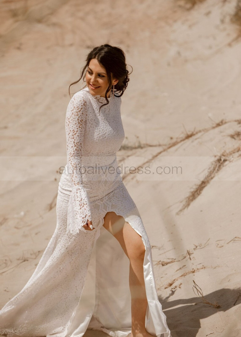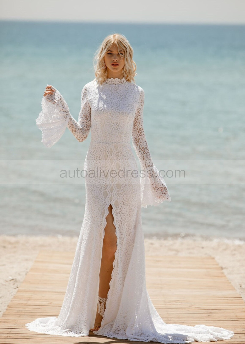 Long Bell Sleeves Ivory Lace Slit Stunning Wedding Dress