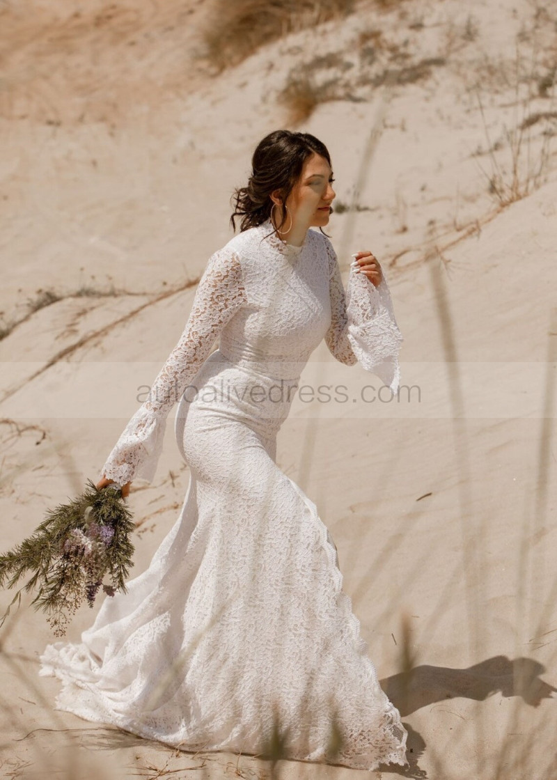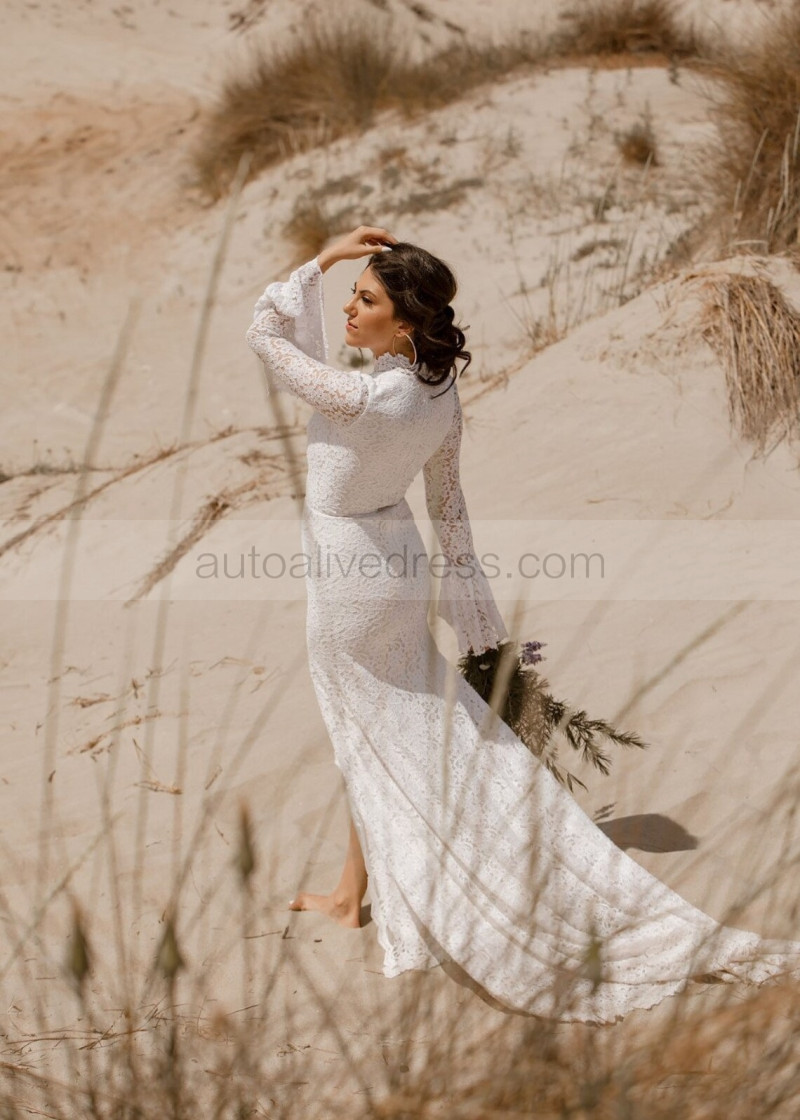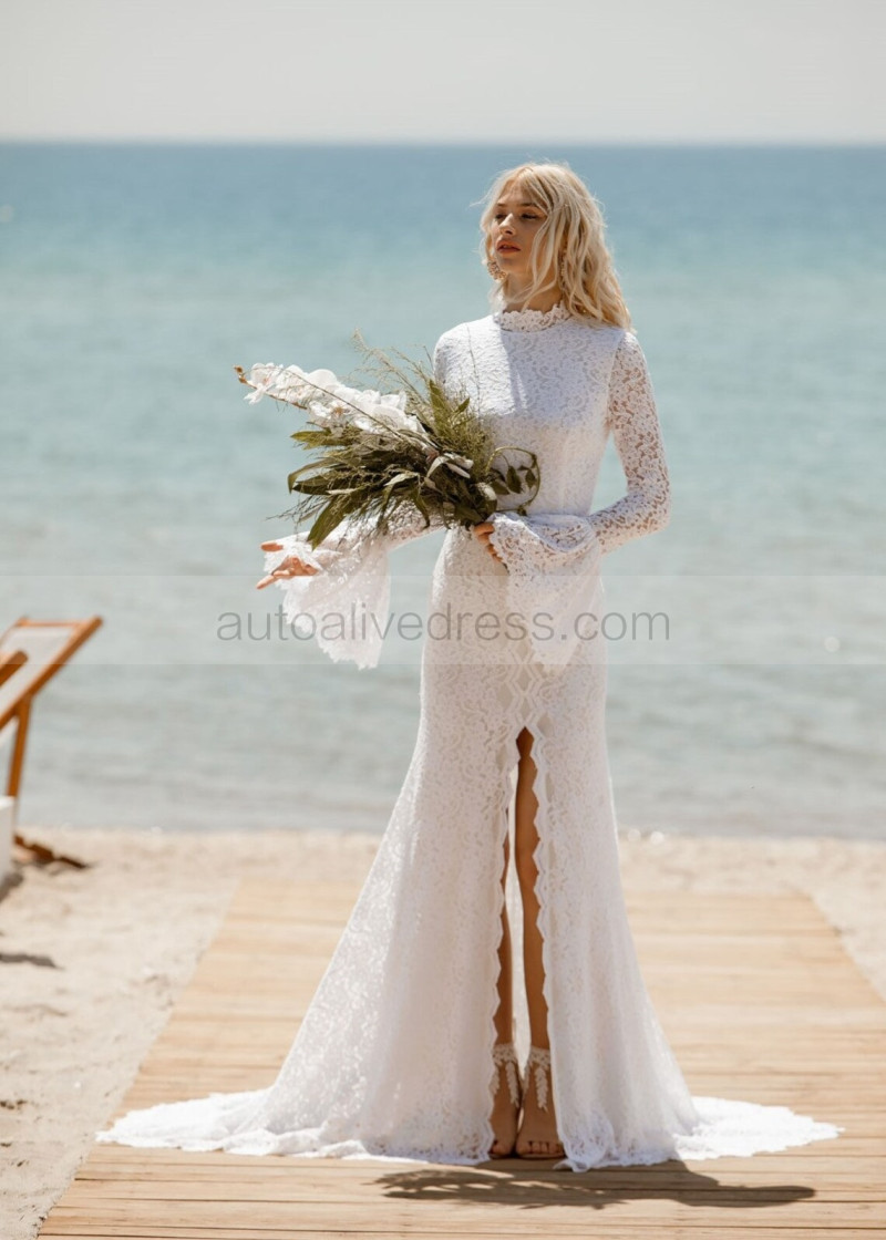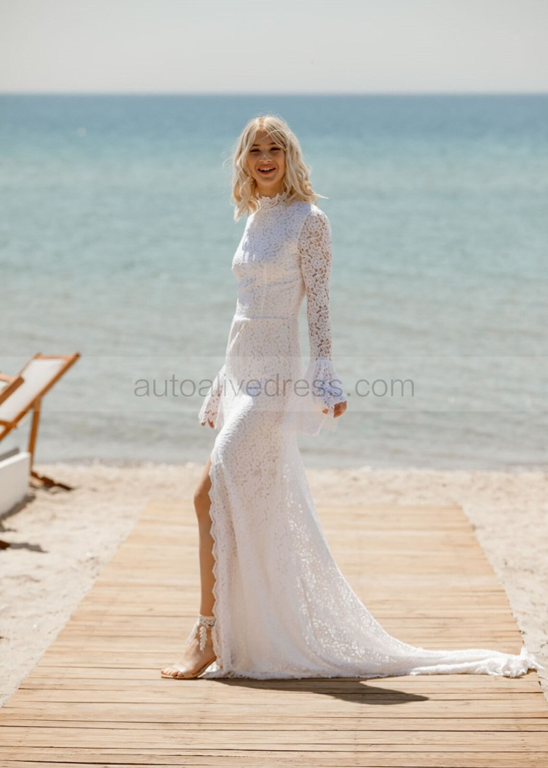 Long Bell Sleeves Ivory Lace Slit Stunning Wedding Dress