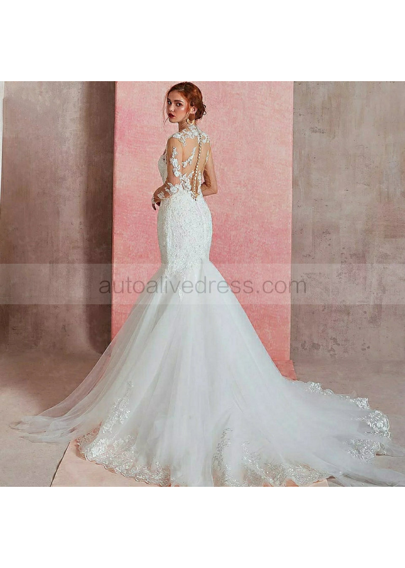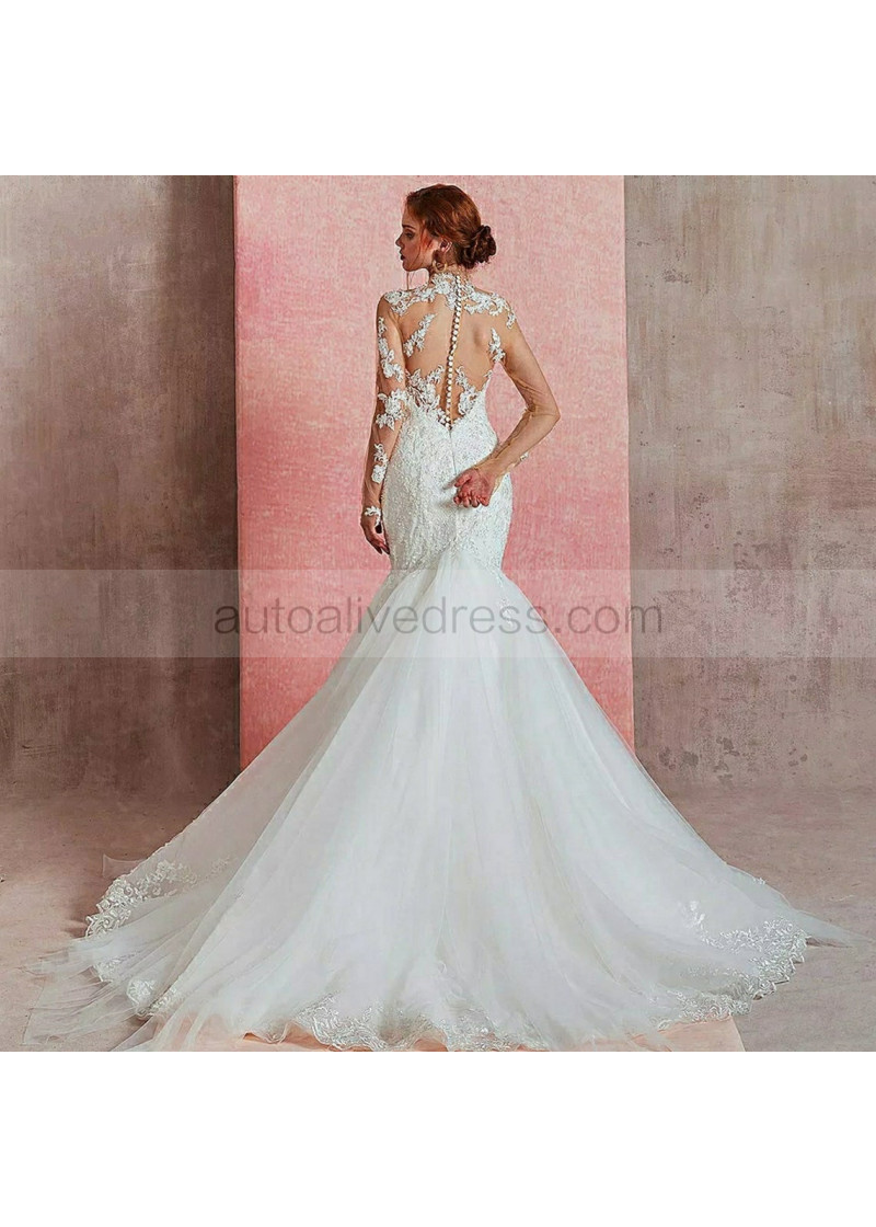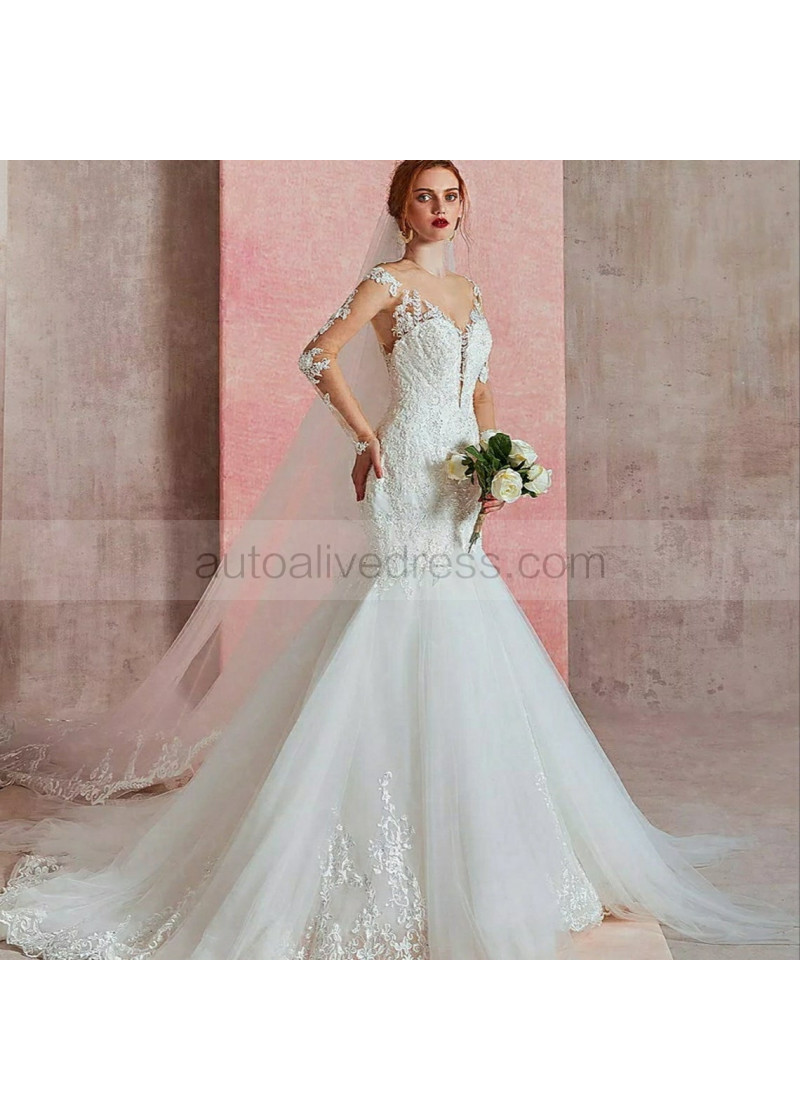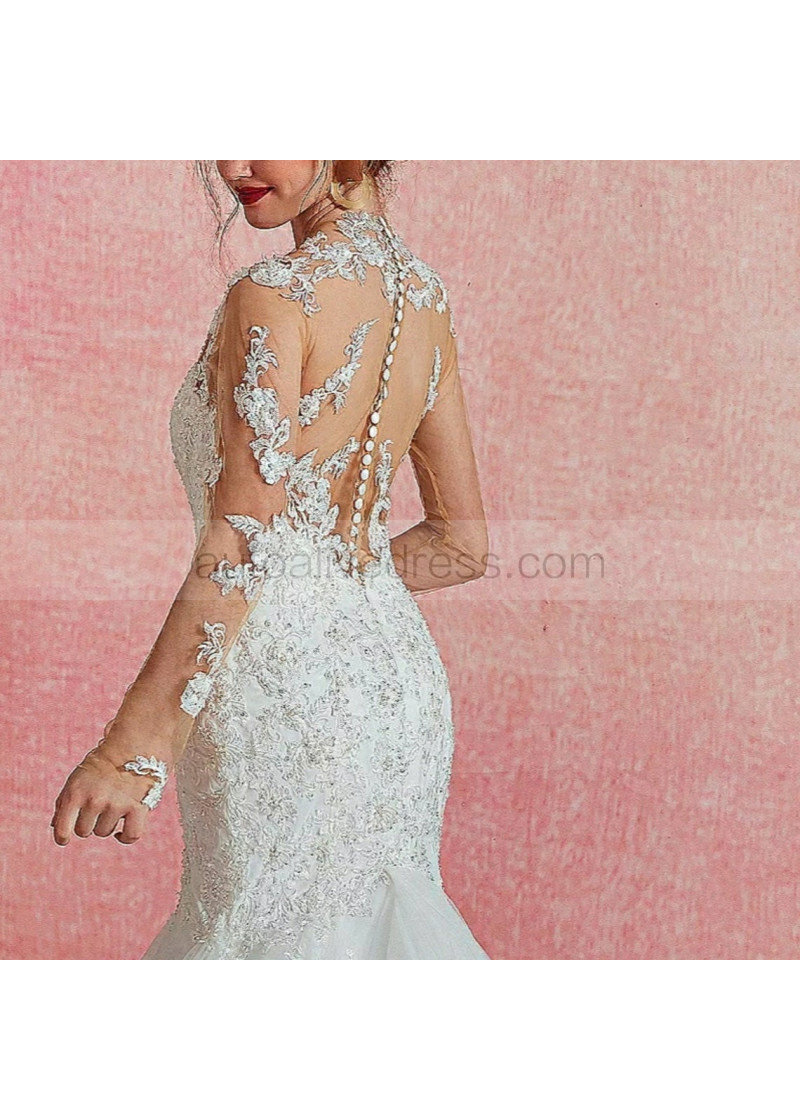 Long Sleeve Beaded Ivory Lace Tulle Wedding Dress