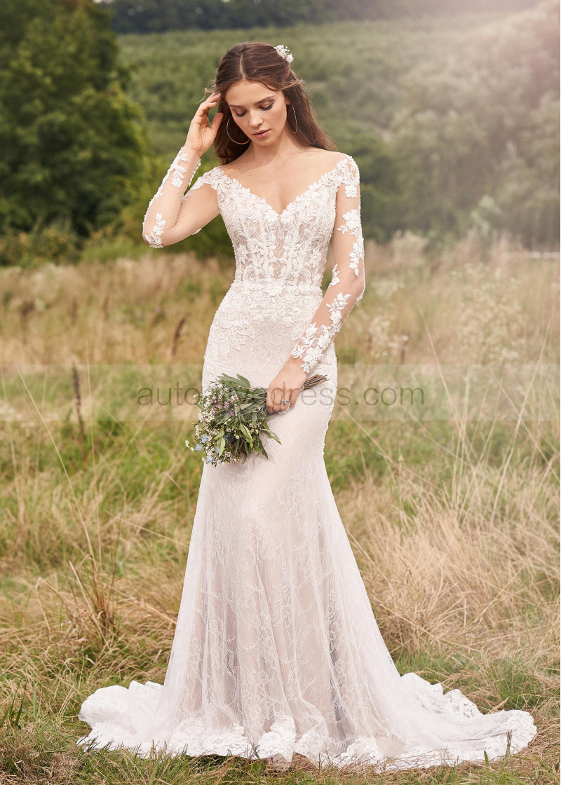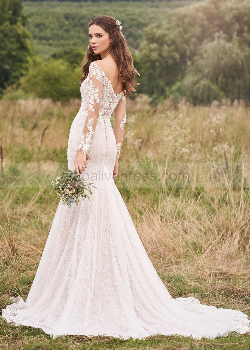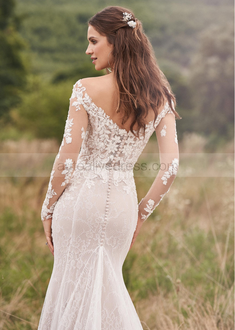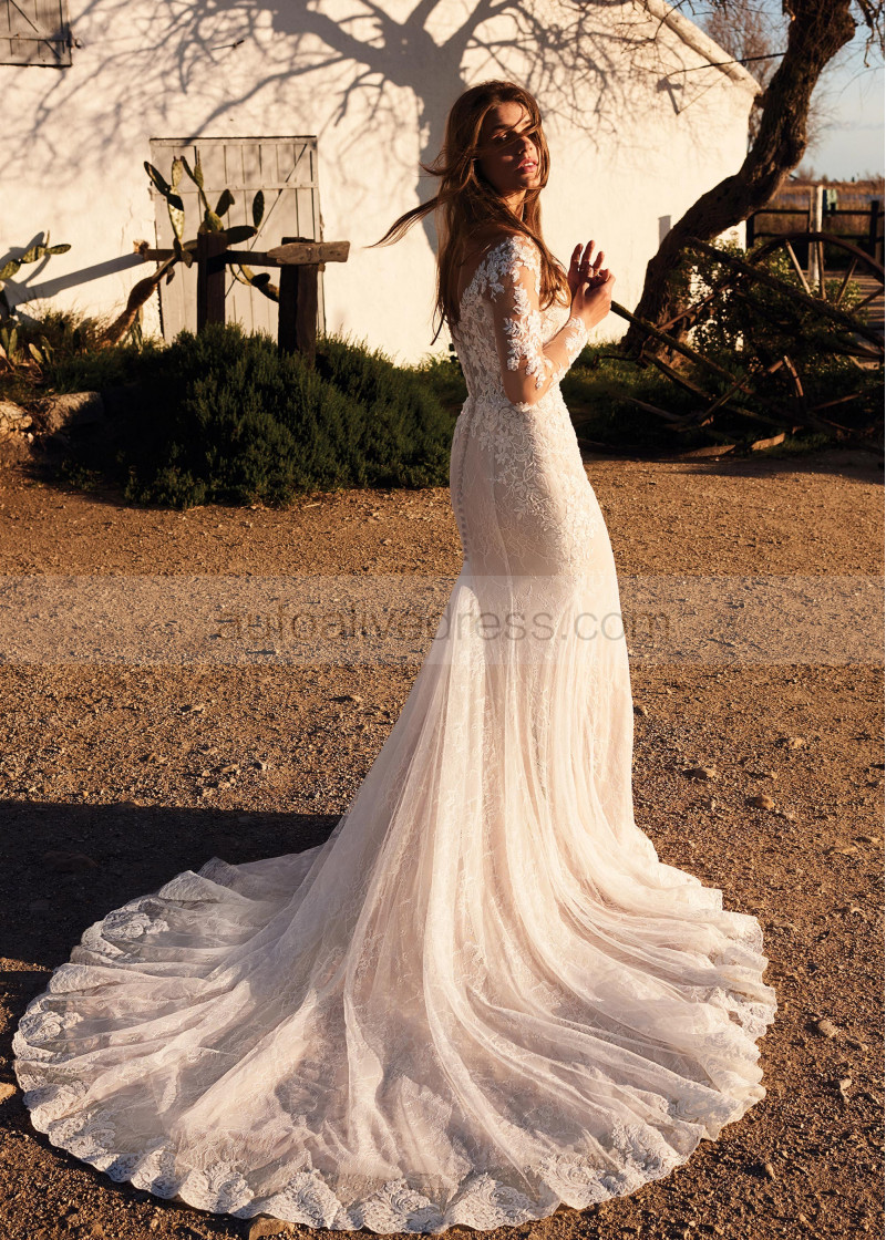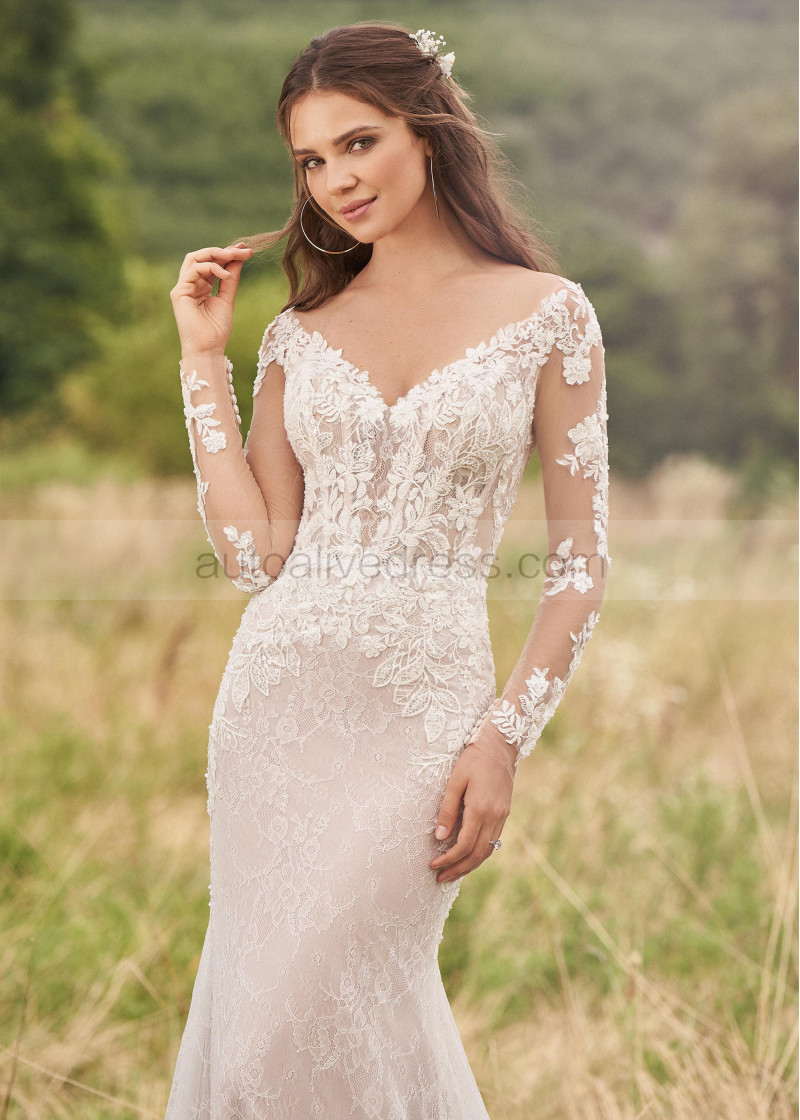 Long Sleeve Beaded V Neck Ivory Lace Tulle Wedding Dress