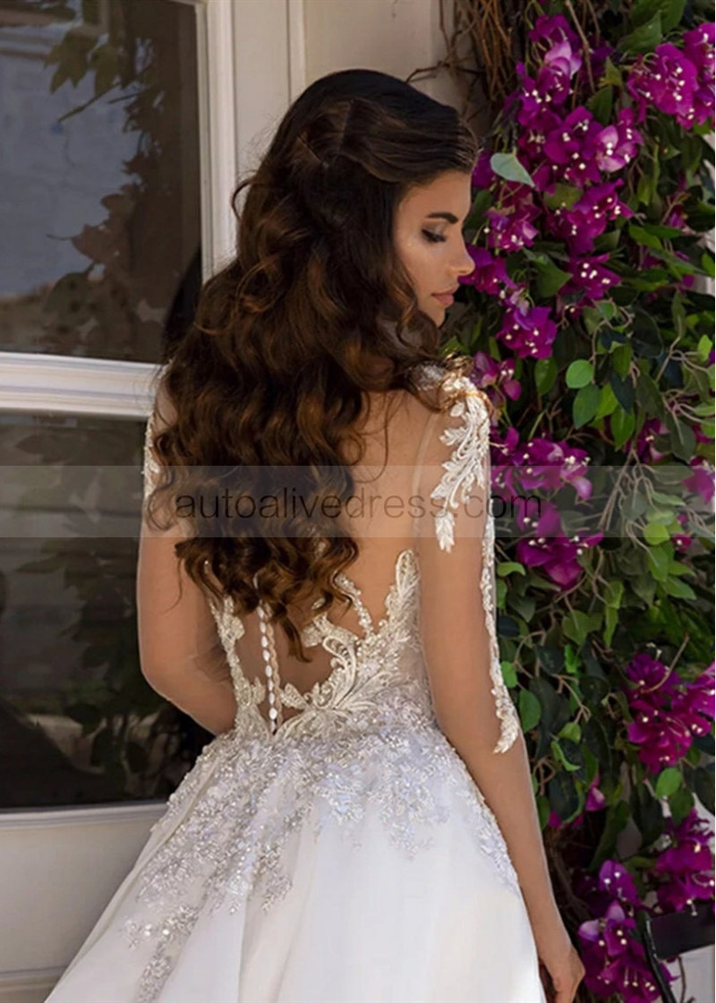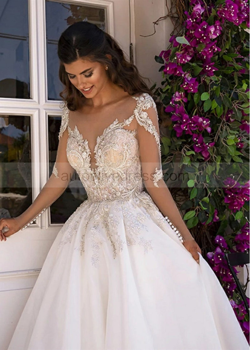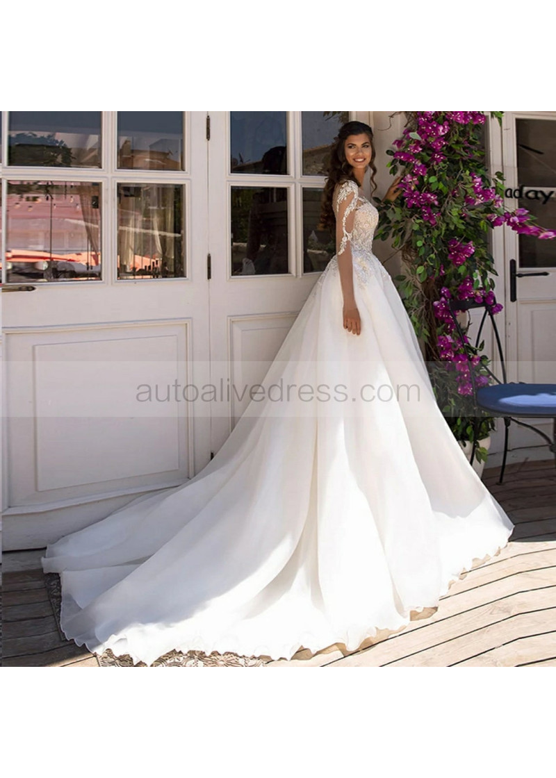 Long Sleeve Beaded Ivory Lace Organza Wedding Dress