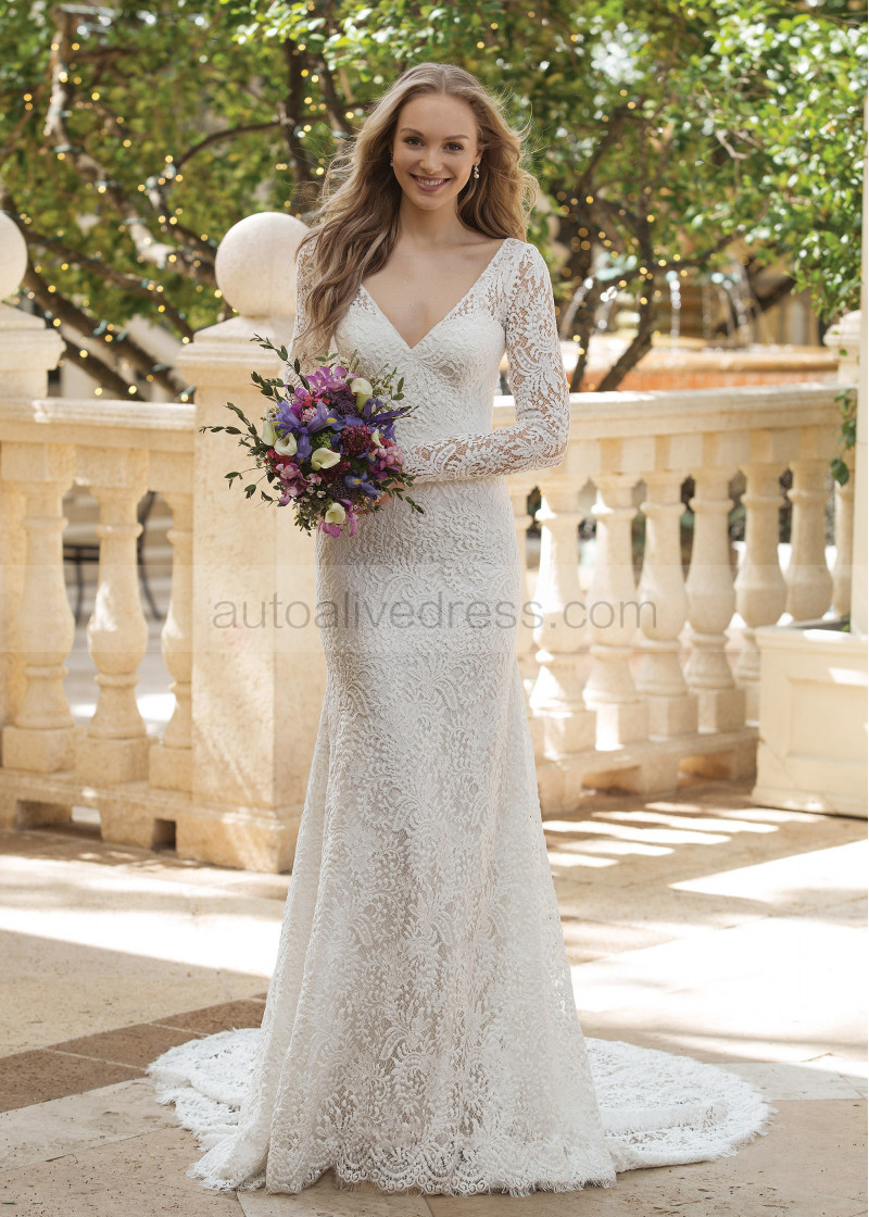 Long Sleeve V Neck Ivory Lace V Back Wedding Dress