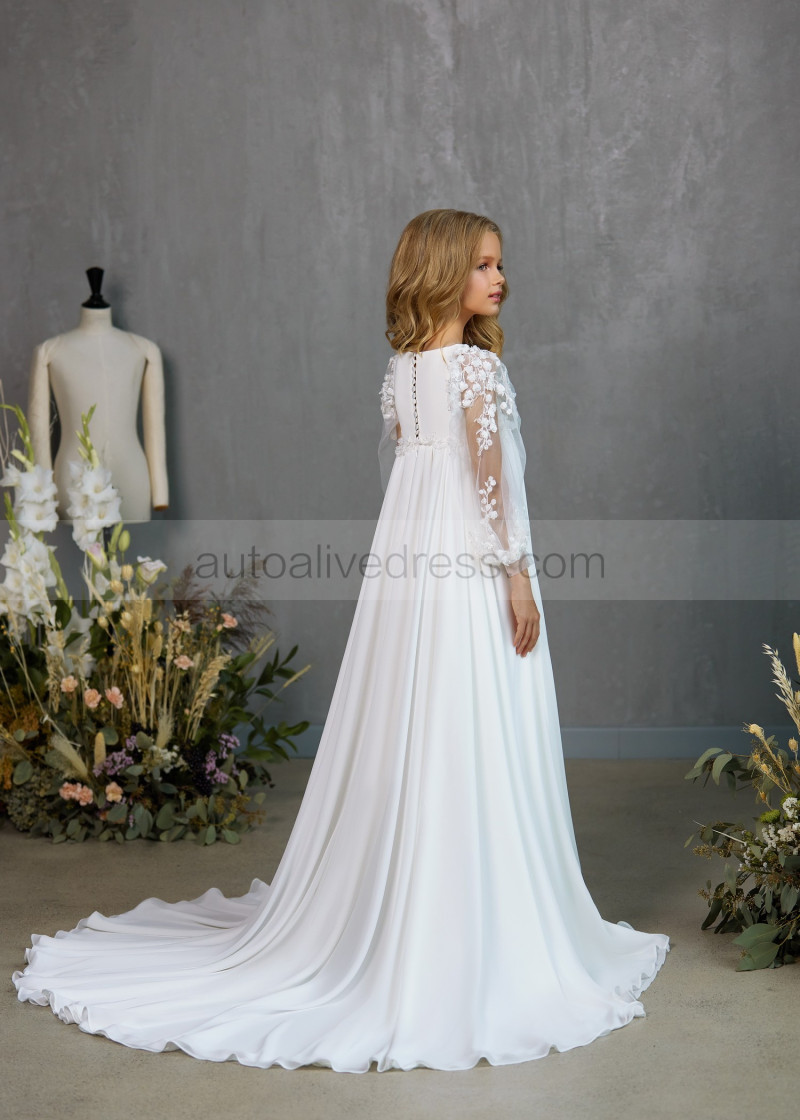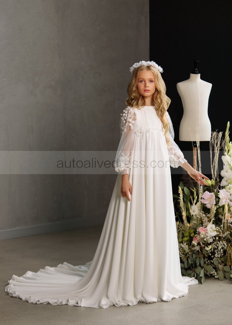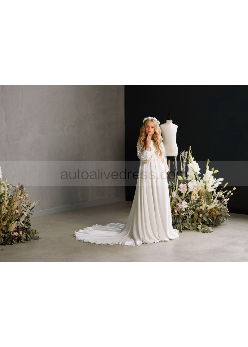 Long Sleeves Beaded Ivory Lace Chiffon Flower Girl Dress