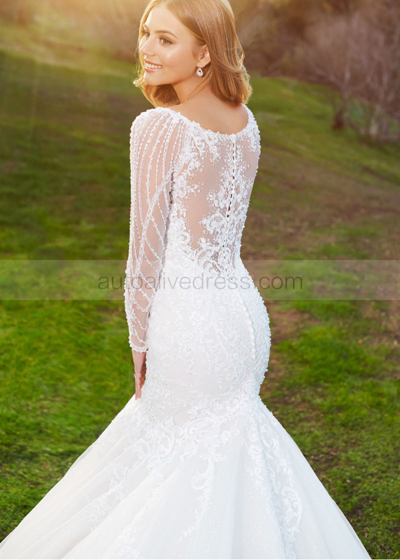 Long Sleeves Beaded Ivory Lace Tulle Luxurious Wedding Dress