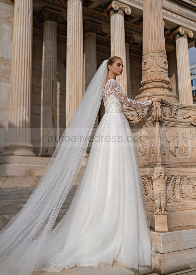 Long Sleeves Beaded Ivory Lace Tulle Shiny Wedding Dress