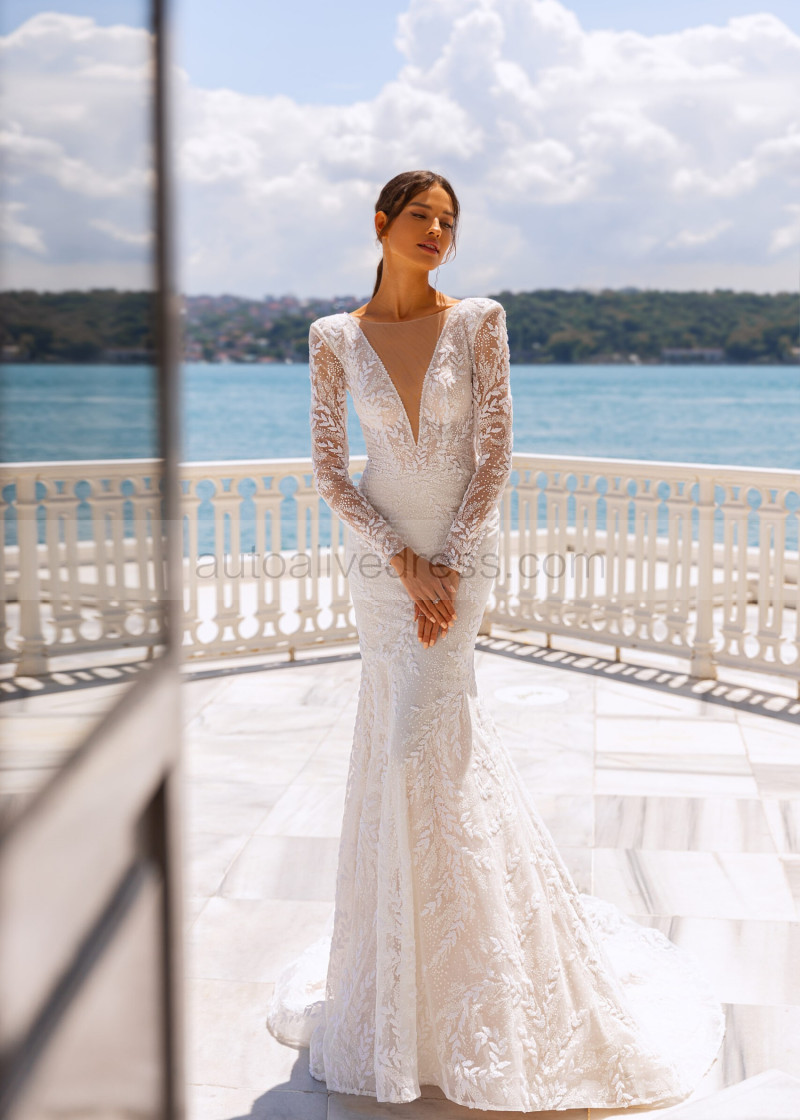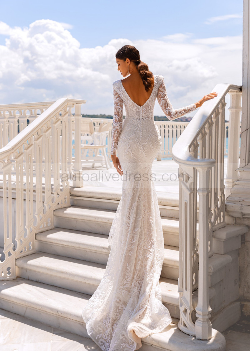 Long Sleeves Beaded Ivory Lace Tulle V Back Sexy Wedding Dress