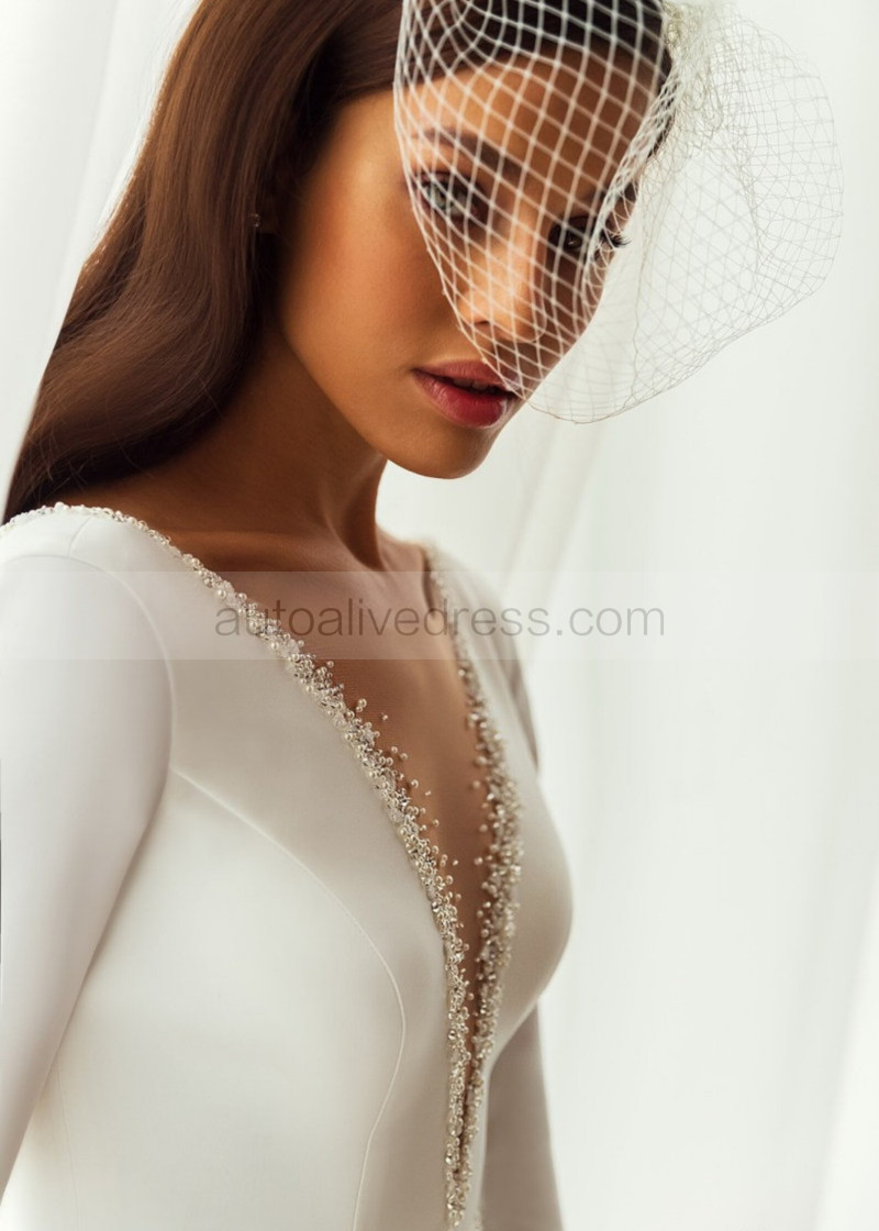 Long Sleeves Beaded Ivory Satin Open Back Stunning Wedding Dress