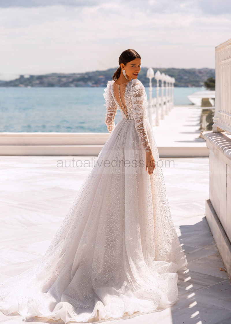 Long Sleeves Beaded Ivory Tulle Dreamy Wedding Dress