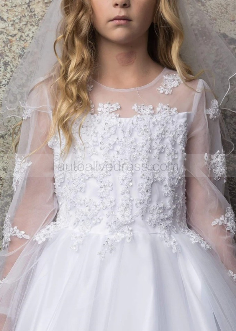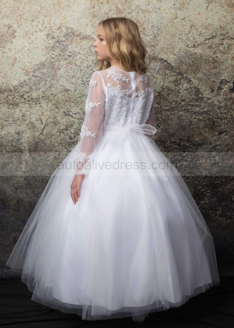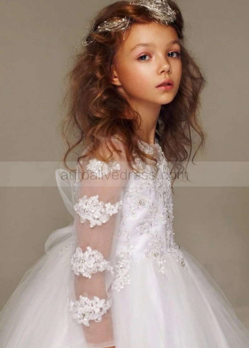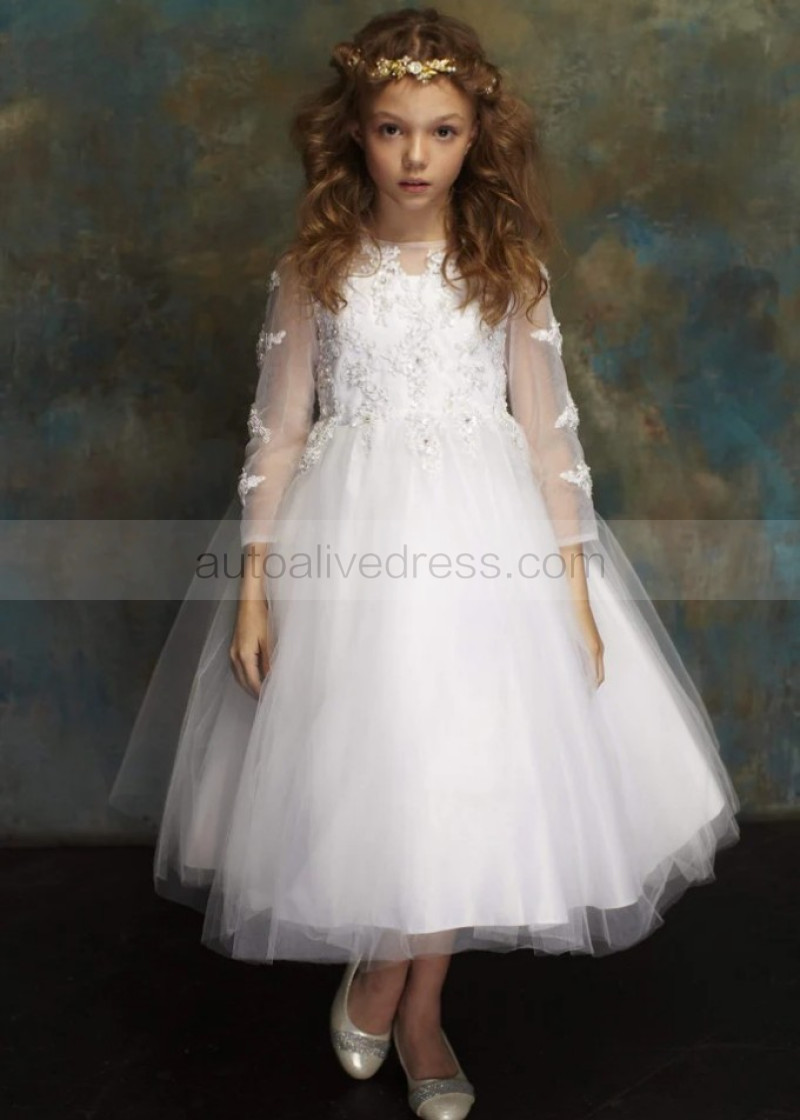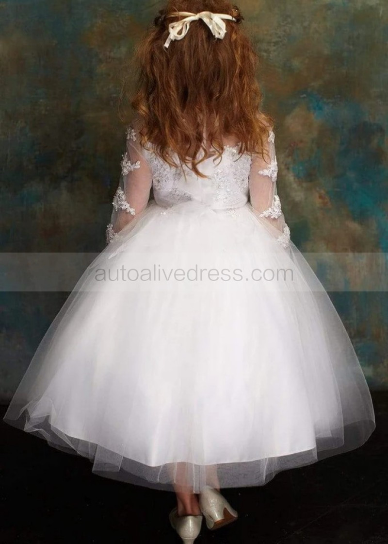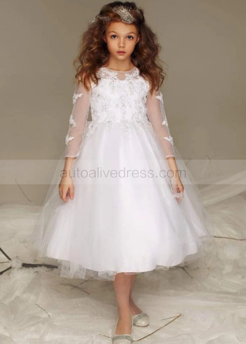 Long Sleeves Beaded Lace Tulle Tea Length Flower Girl Dress