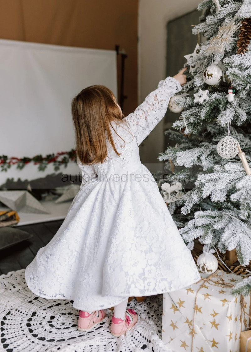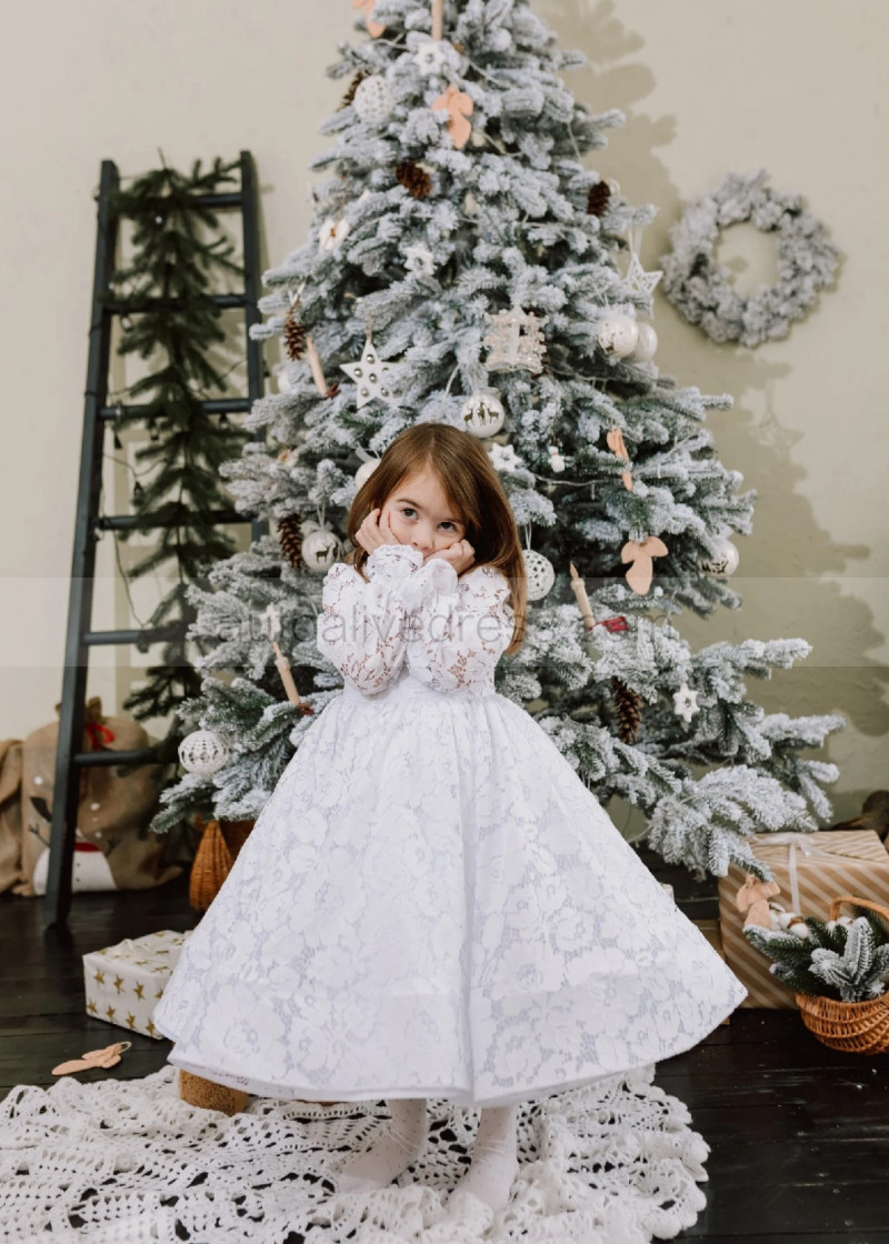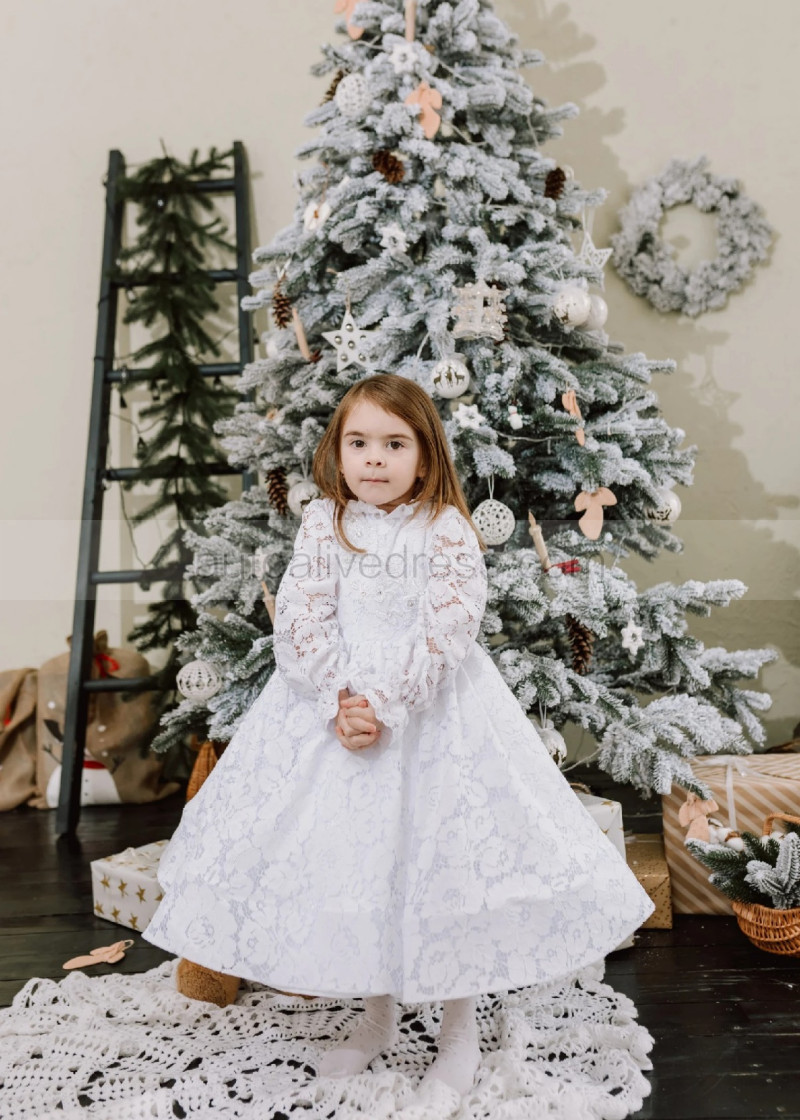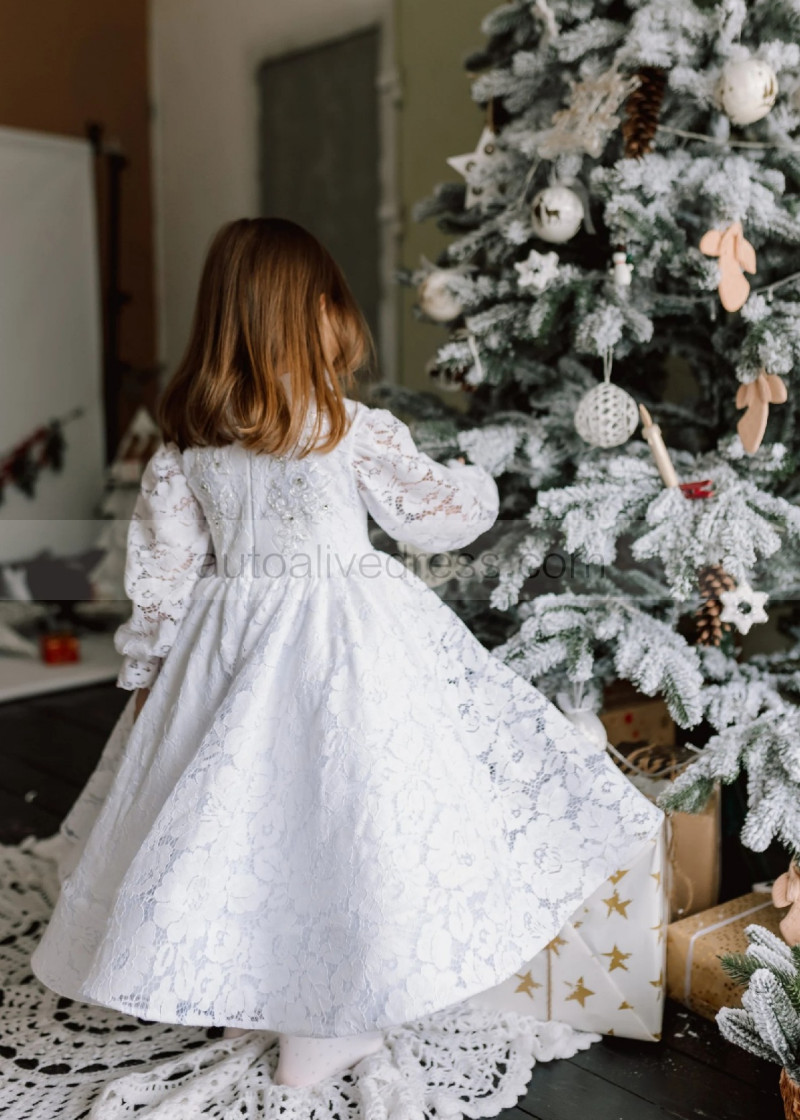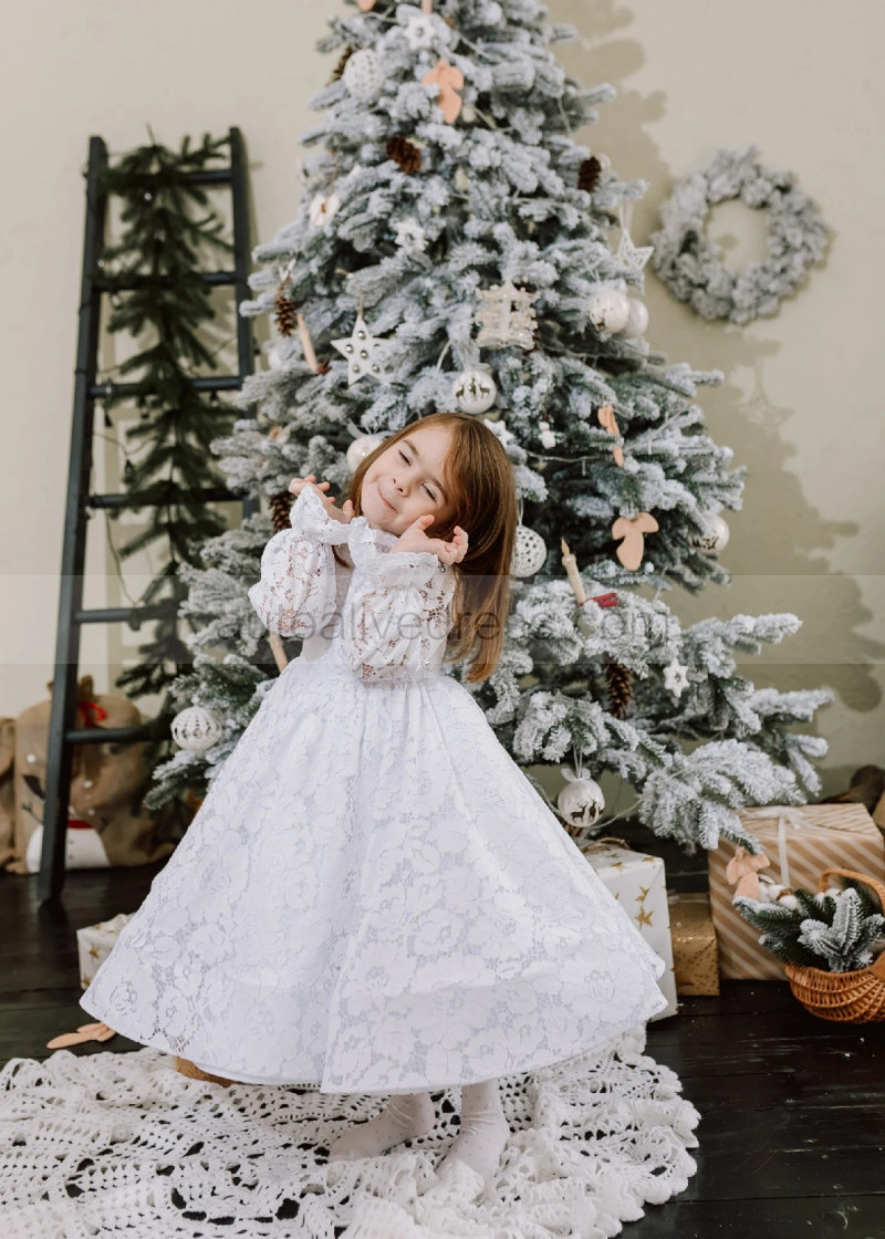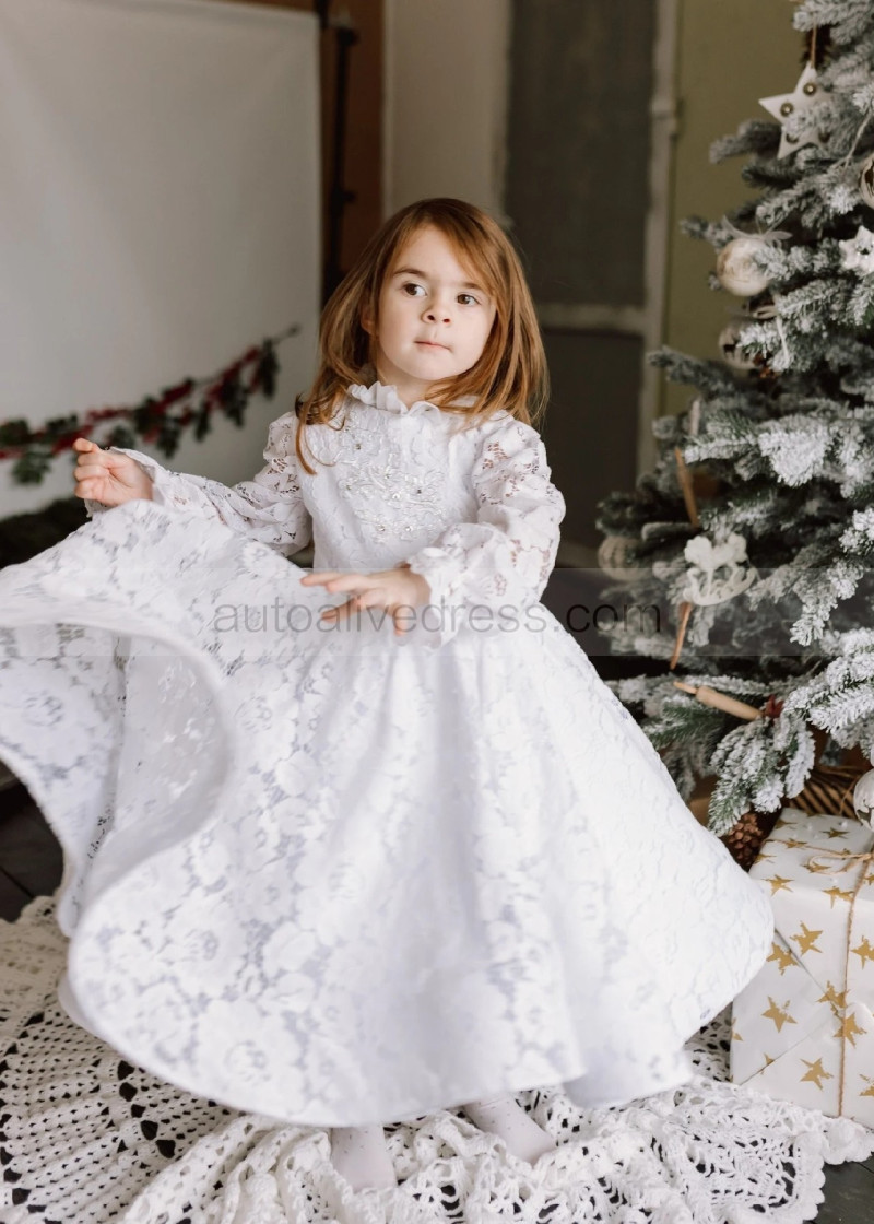 Long Sleeves Beaded White Lace Tulle Flower Girl Dress