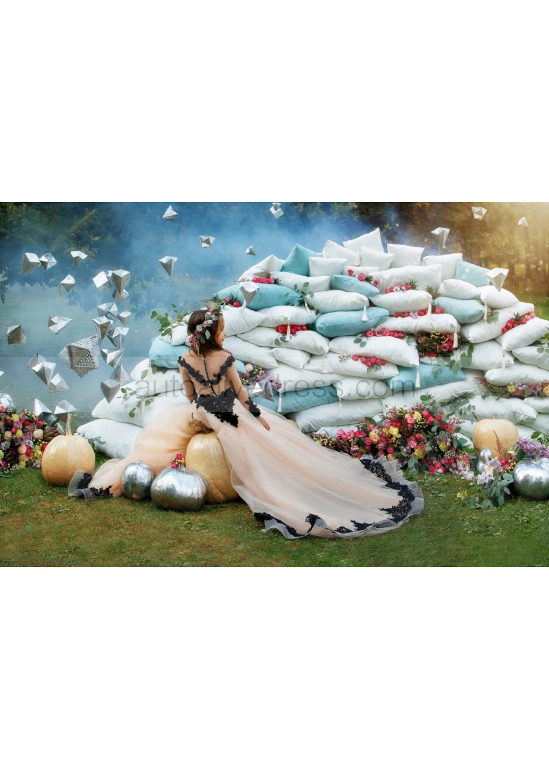 Long Sleeves Black Lace Champagne Tulle Flower Girl Dress