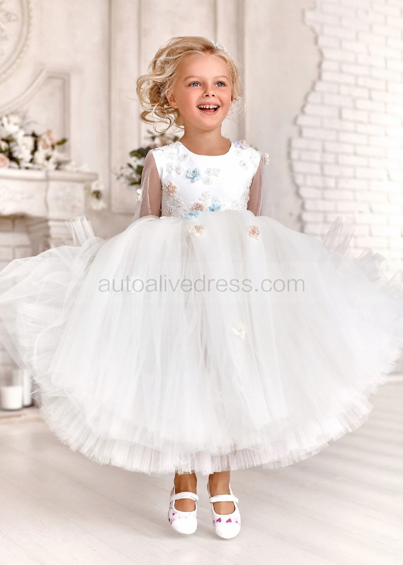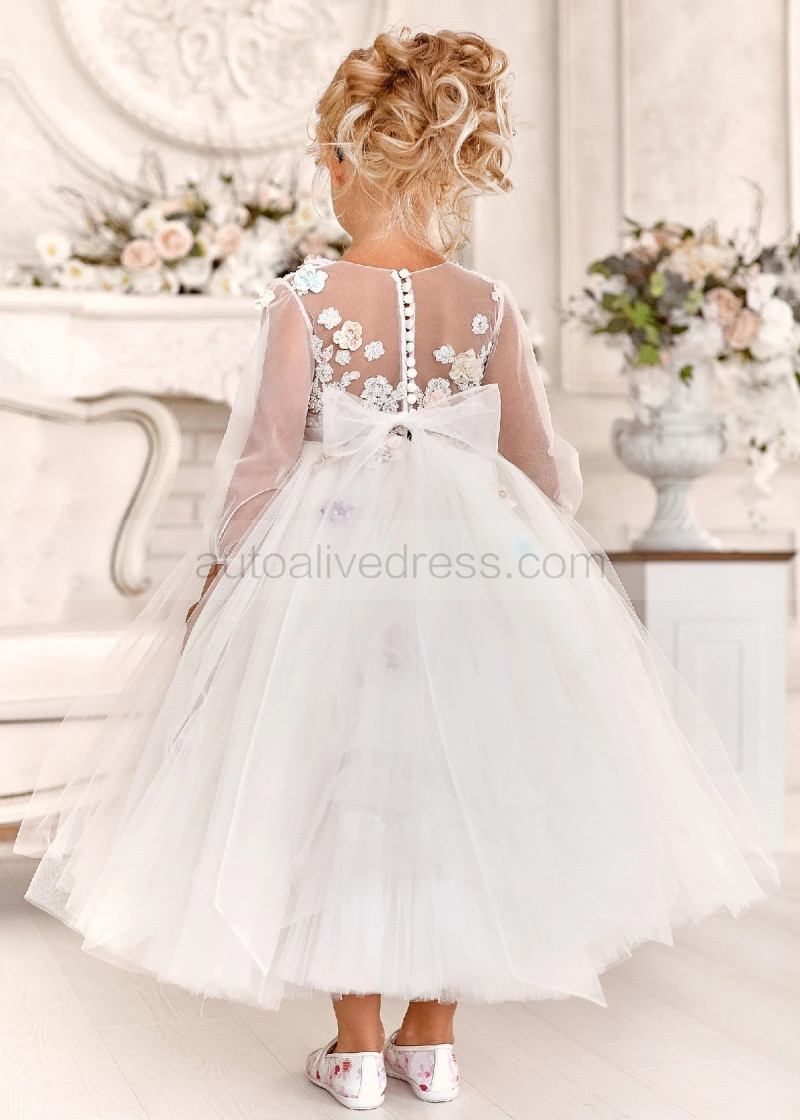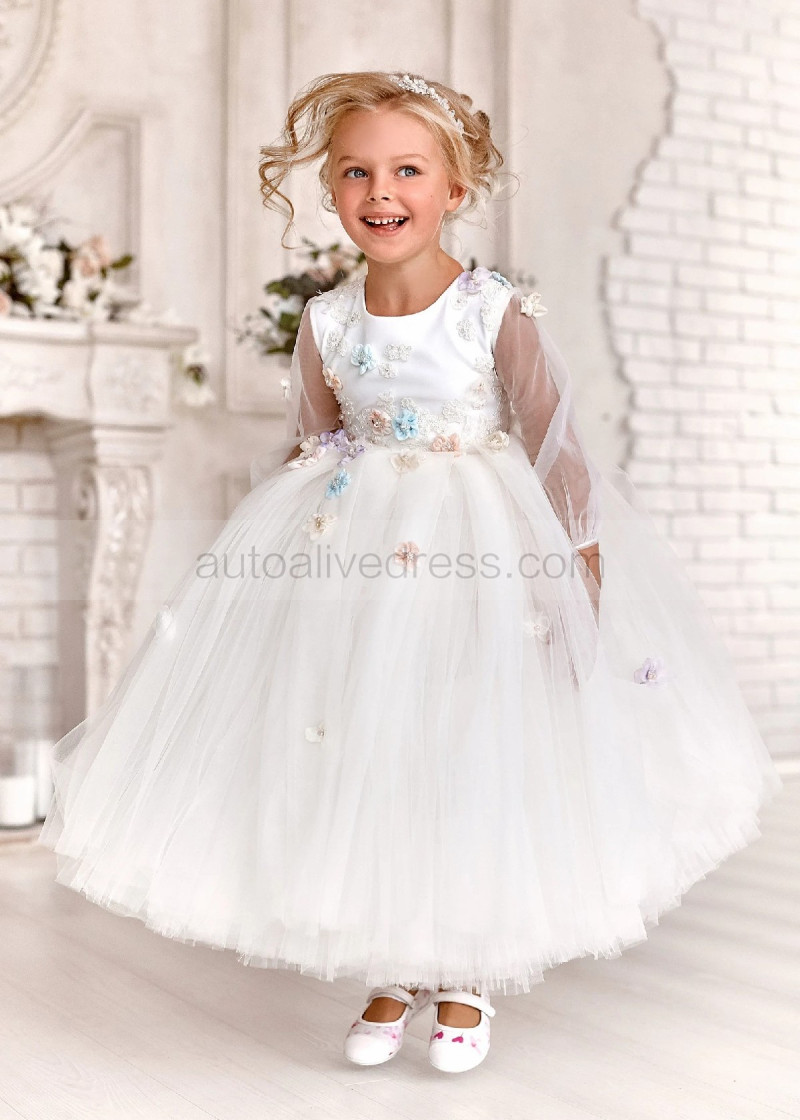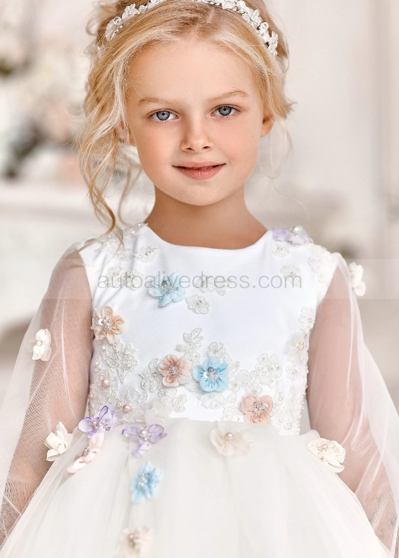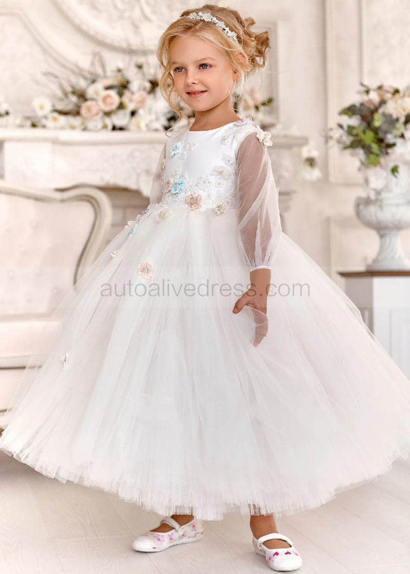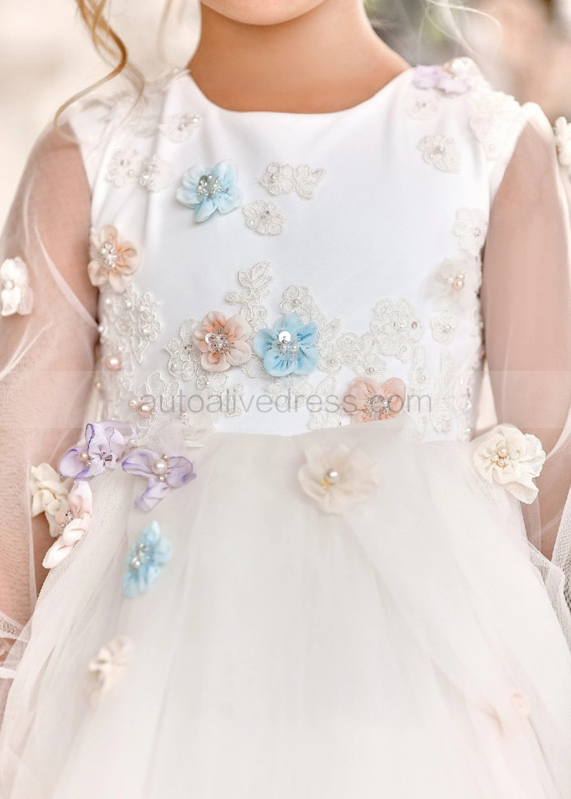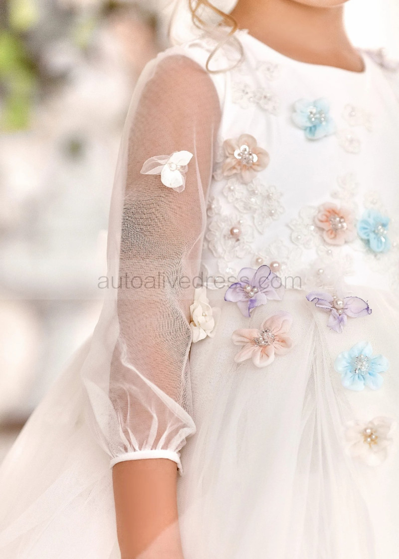 Long Sleeves Colorful Beaded 3D Flowers Cute Flower Girl Dress