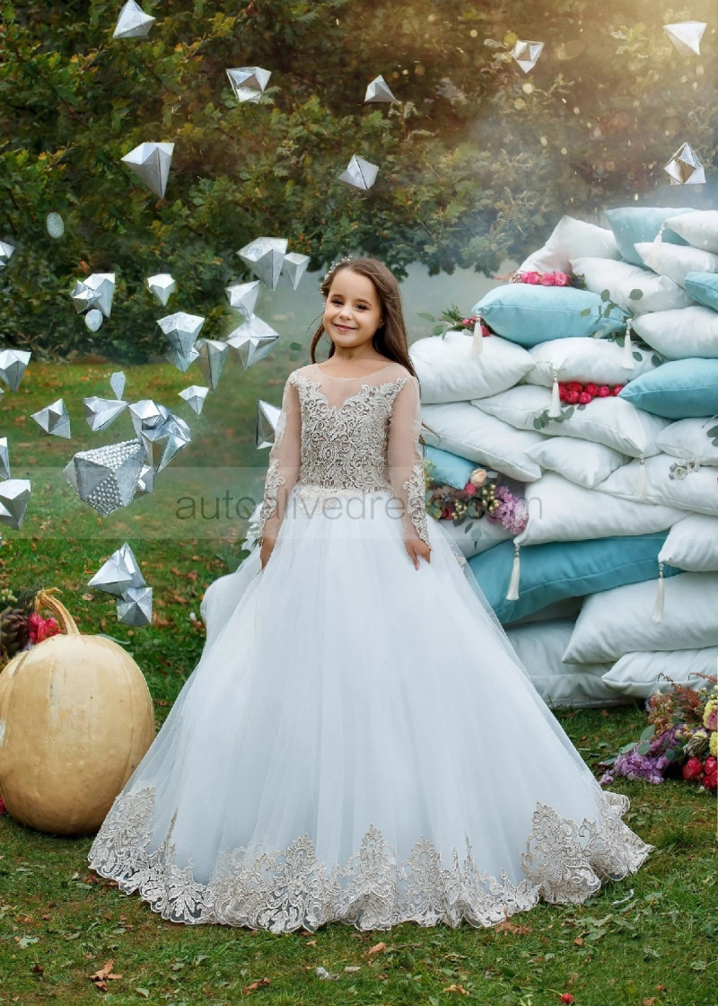 Long Sleeves Gold Lace White Tulle Dreamy Flower Girl Dress