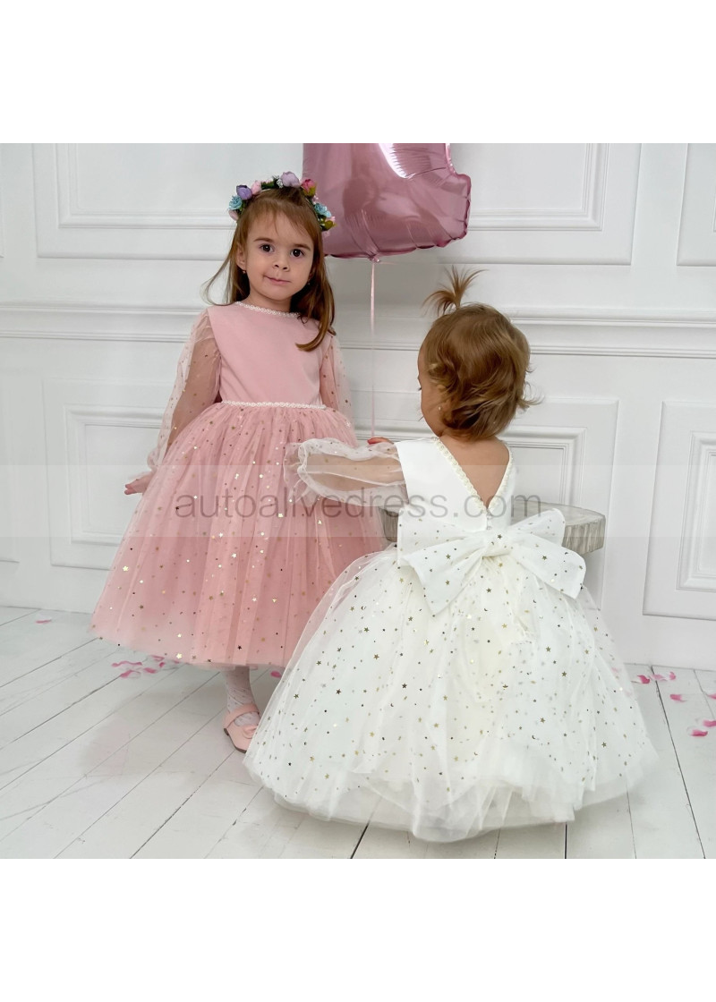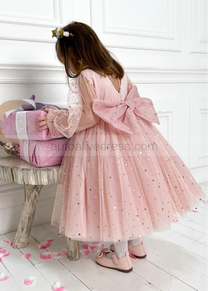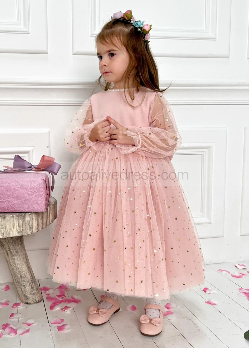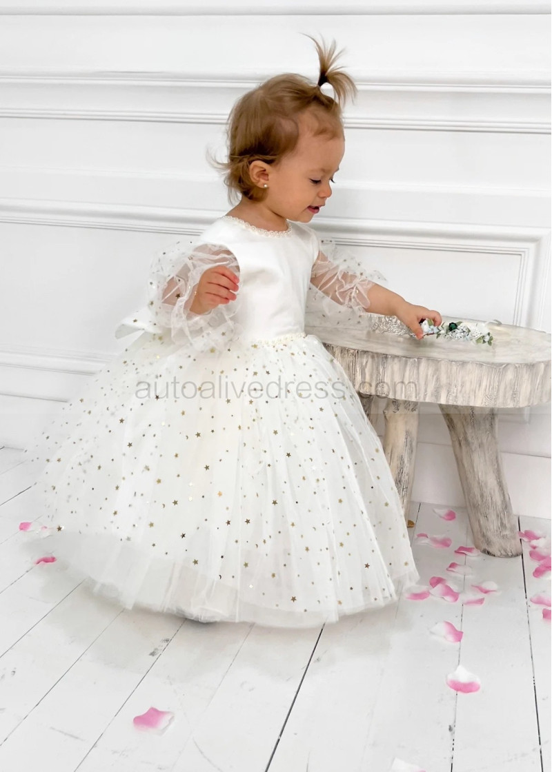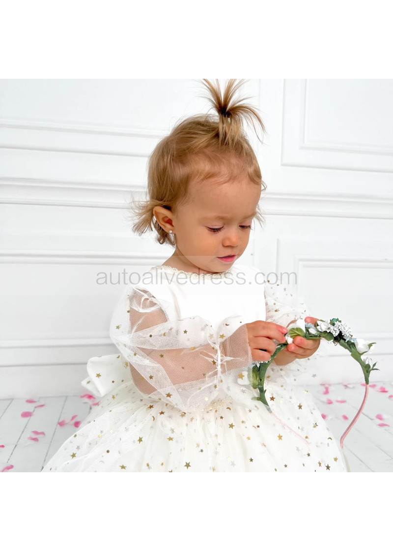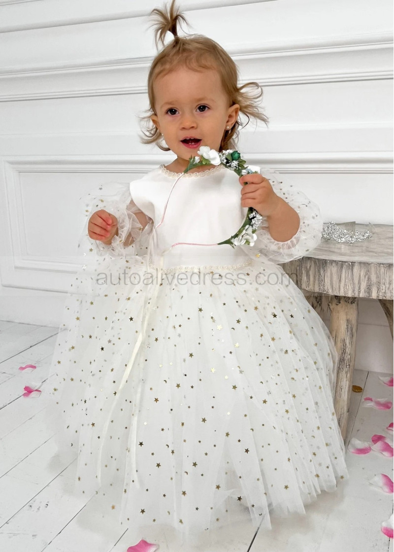 Long Sleeves Gold Star Moon Tulle Flower Girl Dress