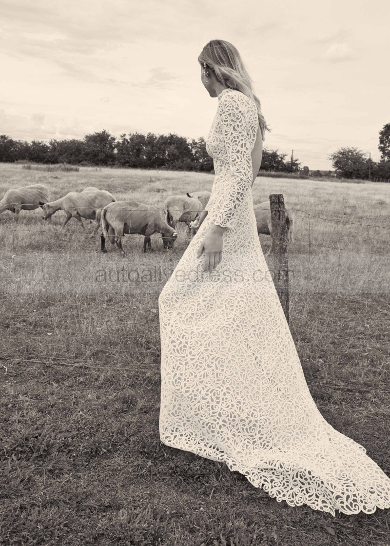 Long Sleeves High Neck Ivory Lace Vintage Wedding Dress